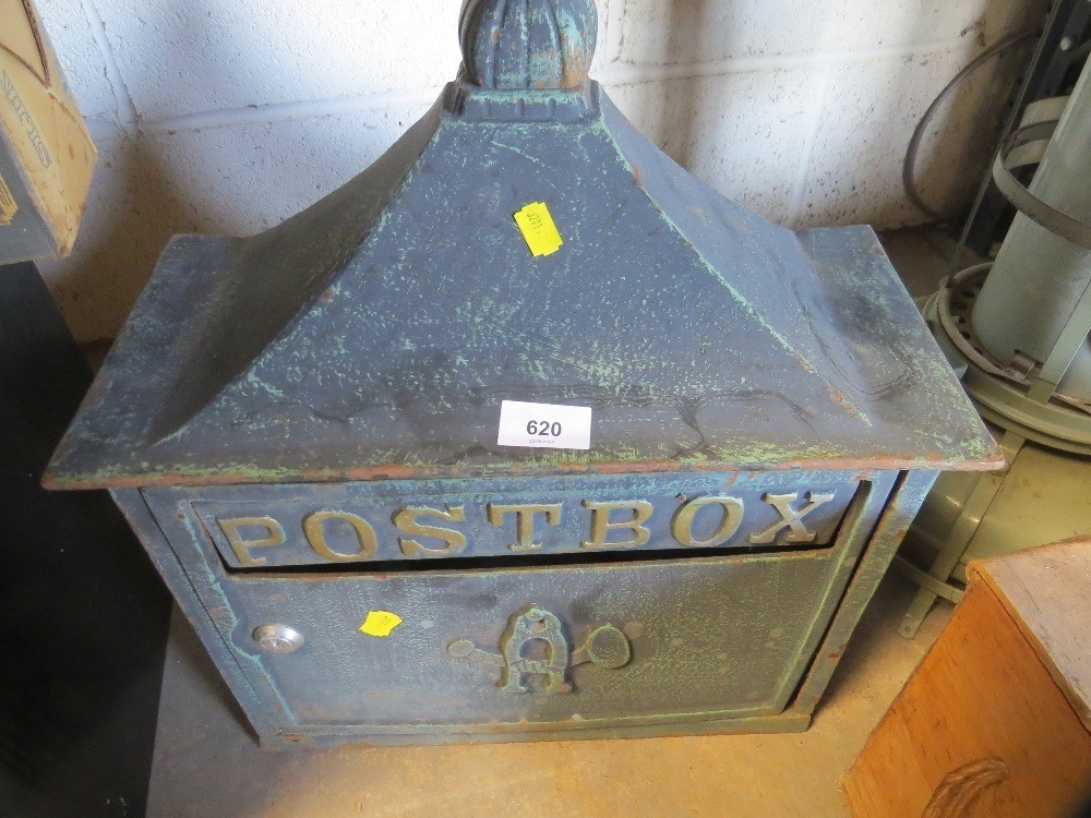 A cast iron decorative wall mounted post box
