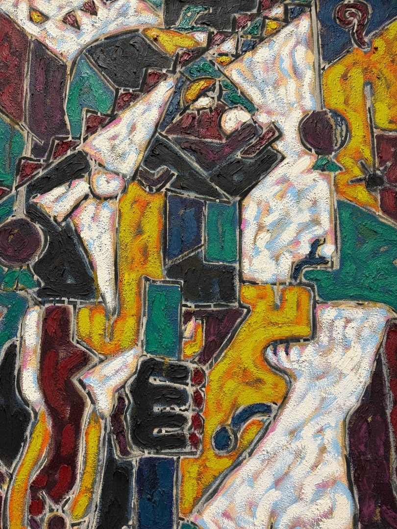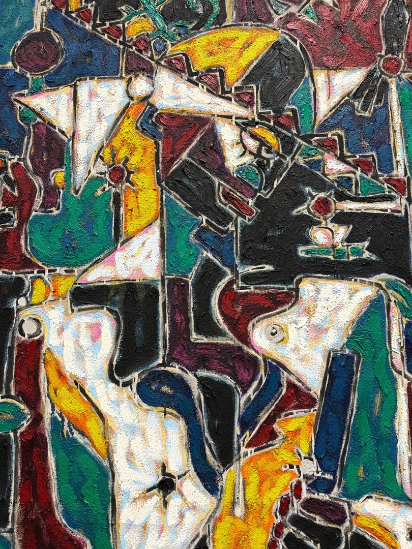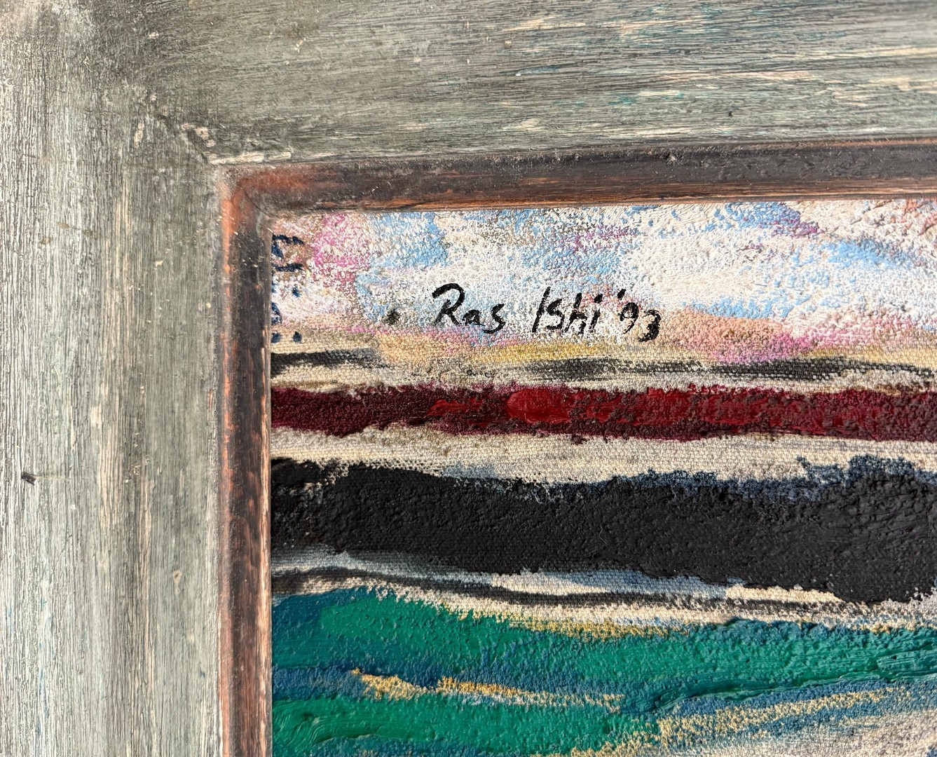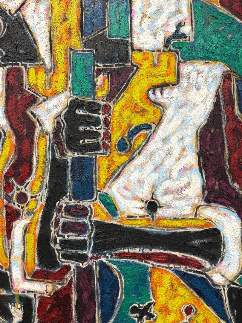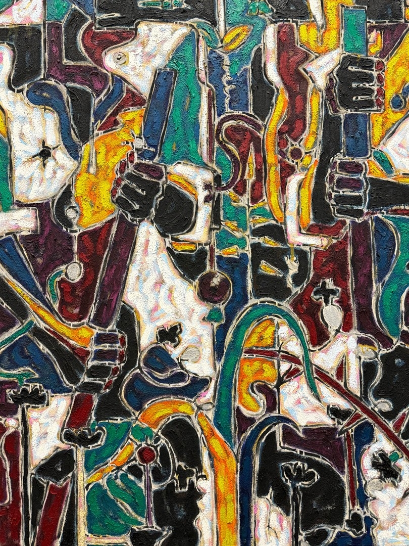 RAS ISHI BUTCHER (BARBADIAN B. 1965). ABSTRACT FIGURES. oil on canvas, 202cm x 172cm, framed.