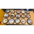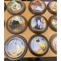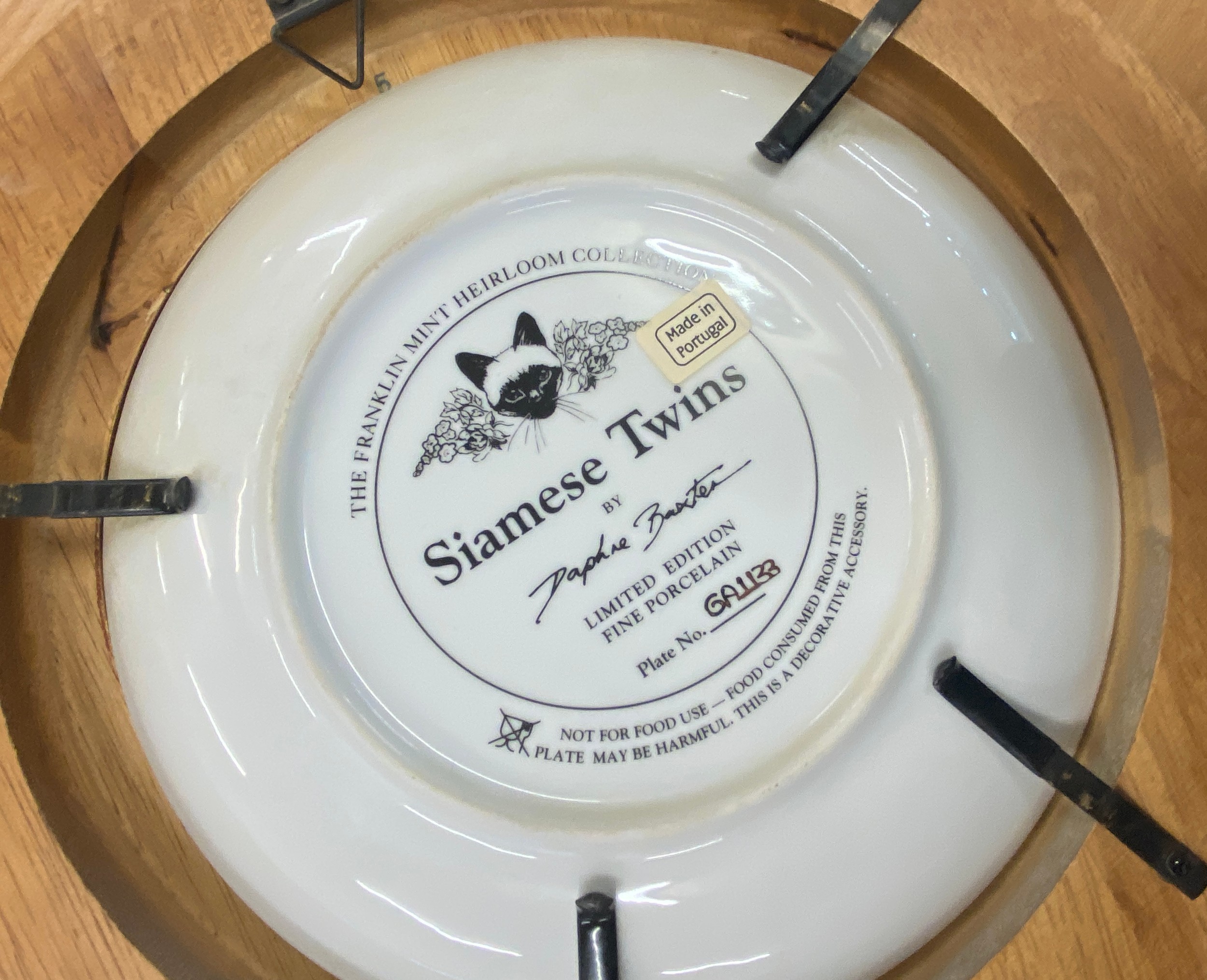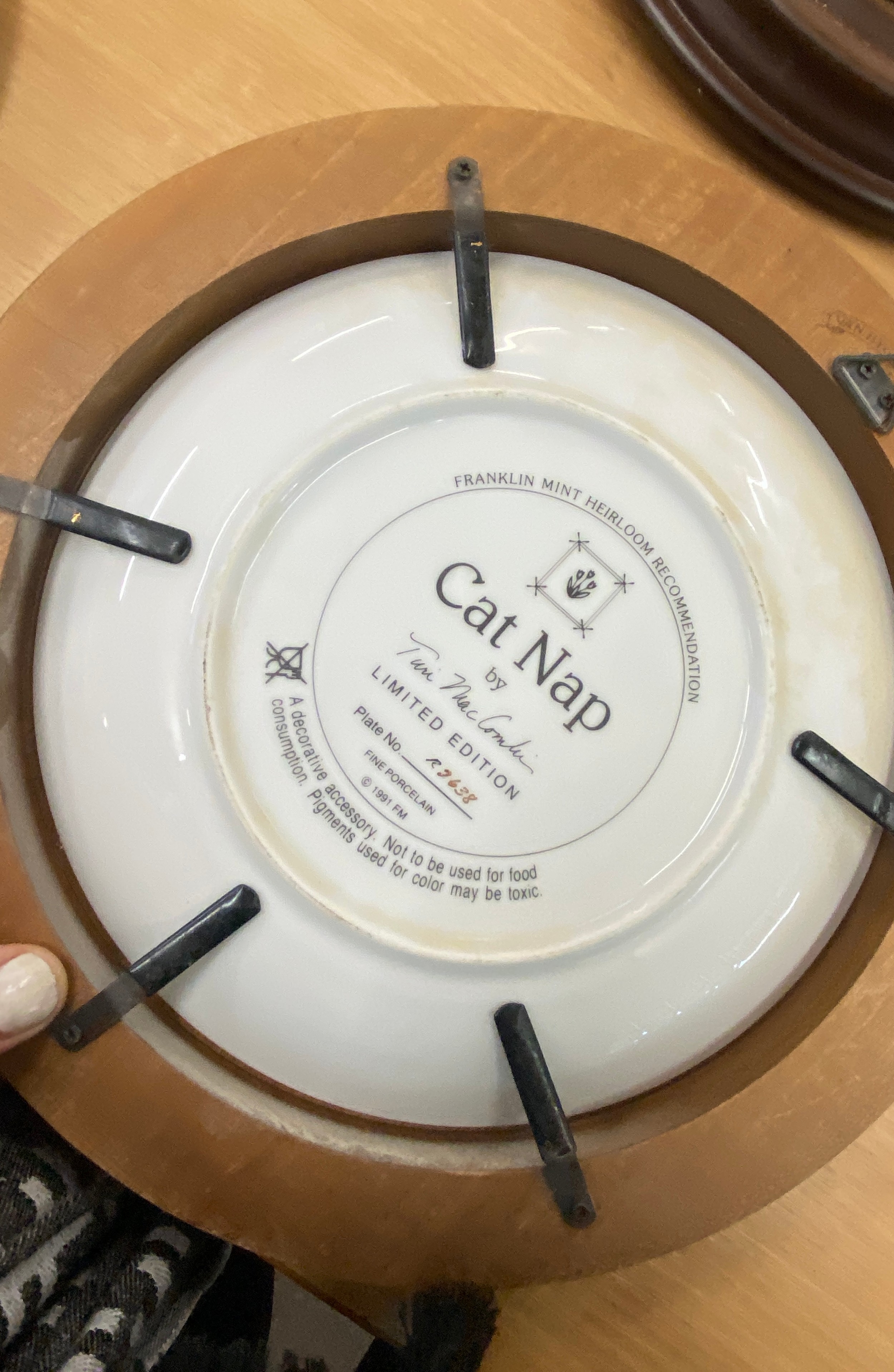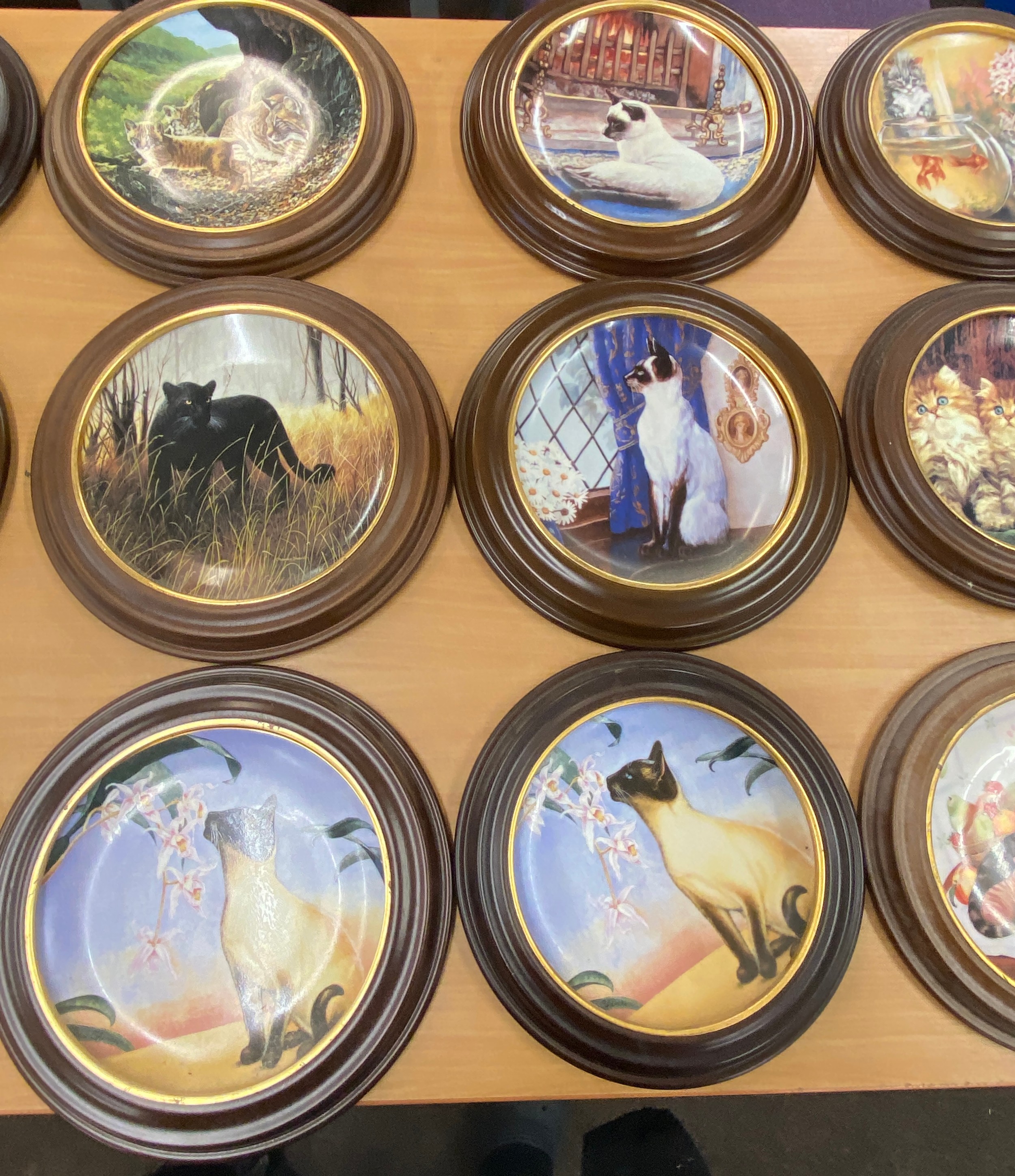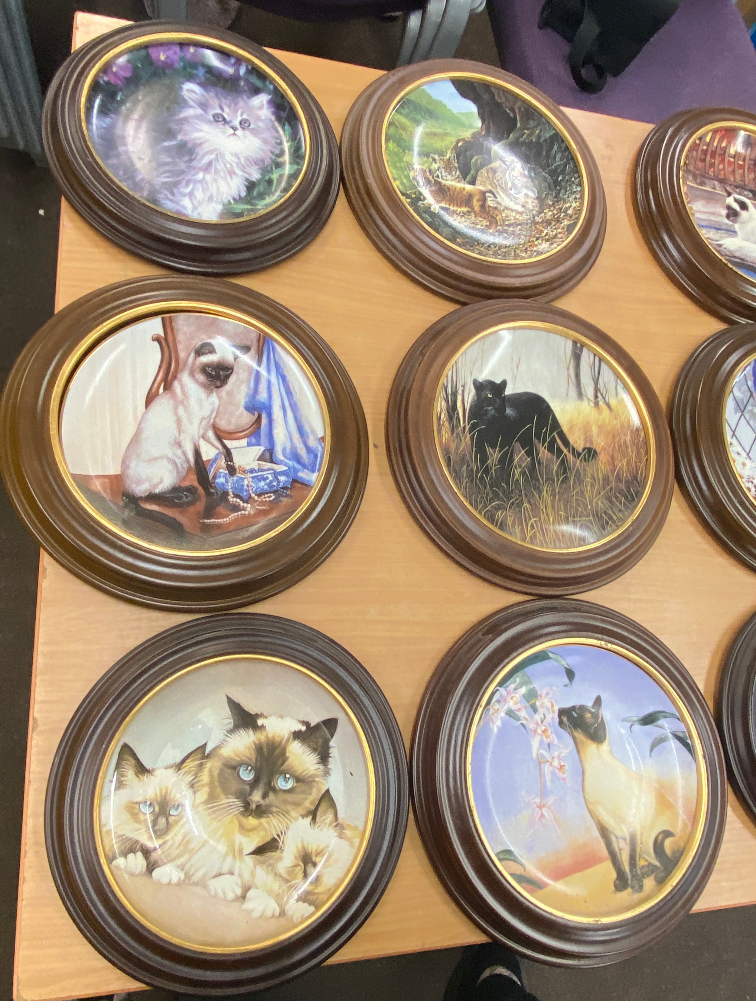 Large selection of wooden framed collectors plates includes Edwin E Knowles, Cat Nap, Siamese twins etc