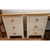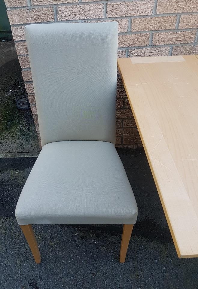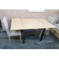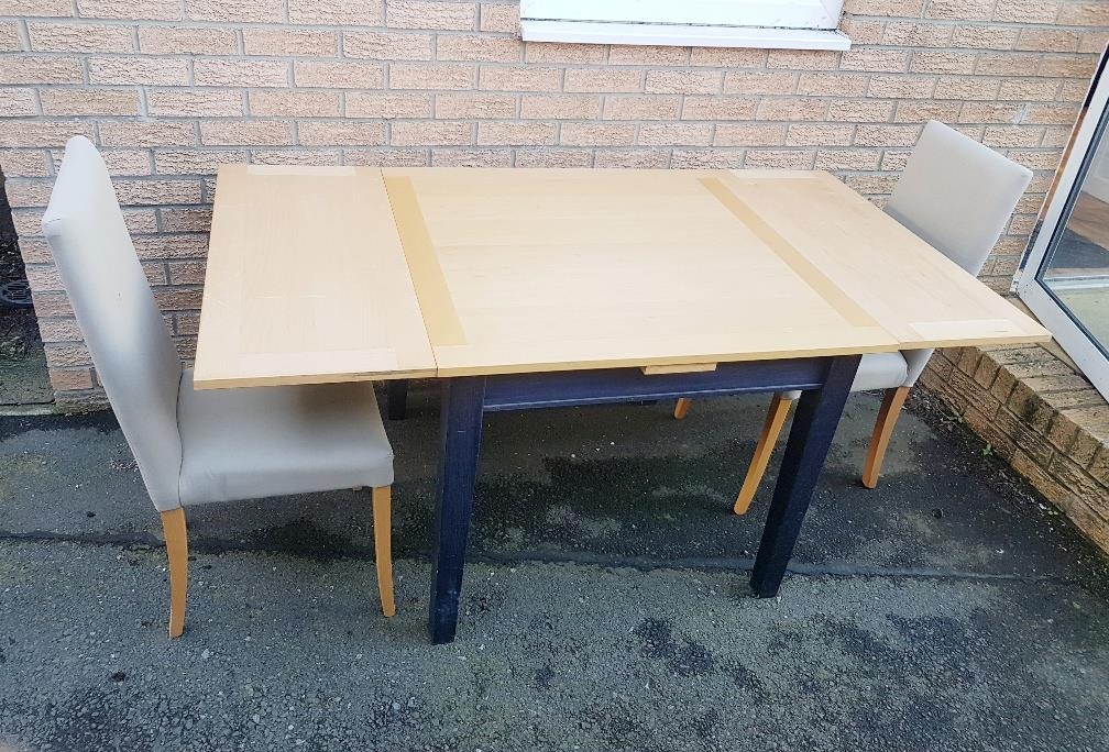 Modern extending dining table with two upholstered chairs. Measures 65 inches x 36 inches x 30 inches in height when extended