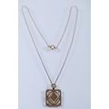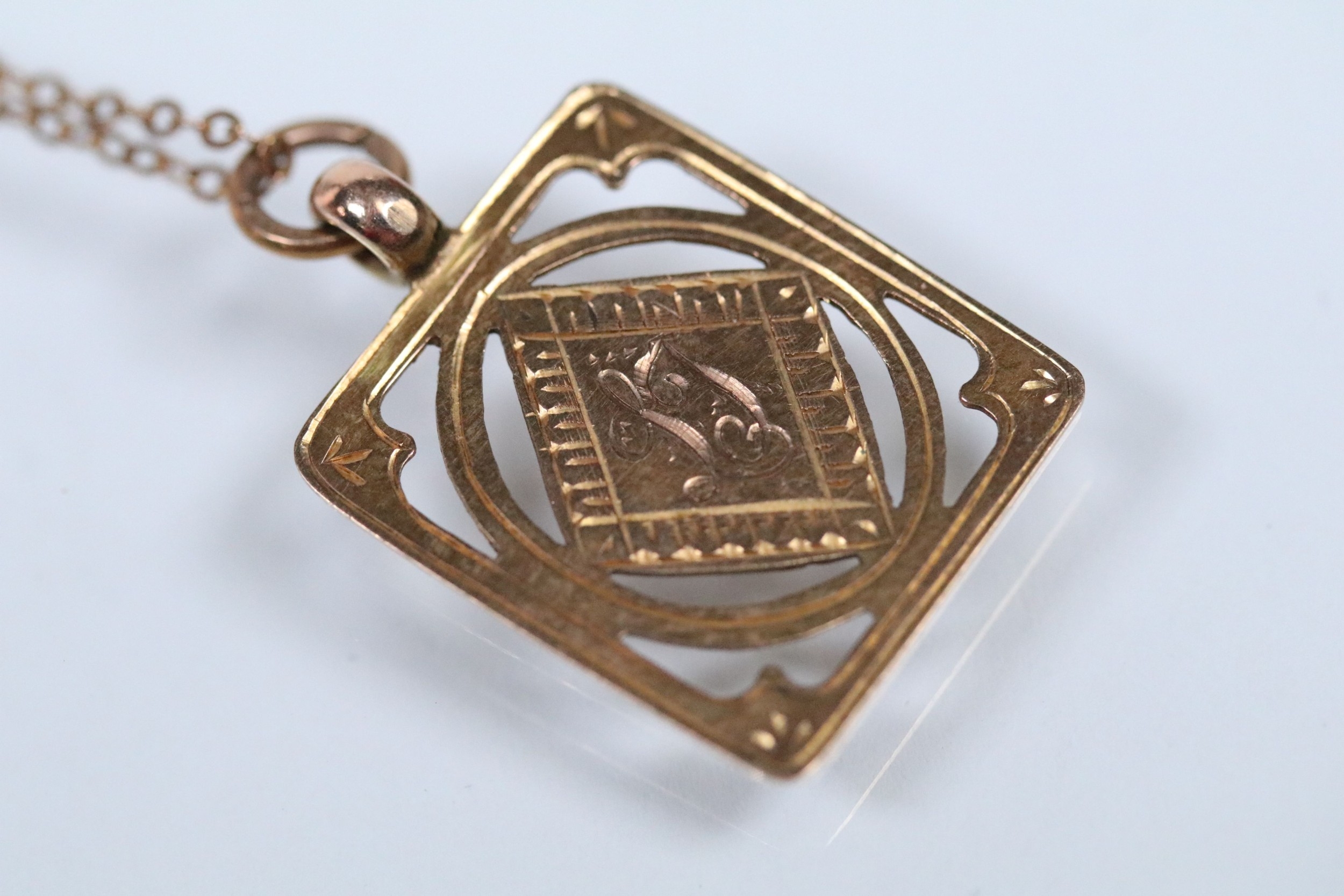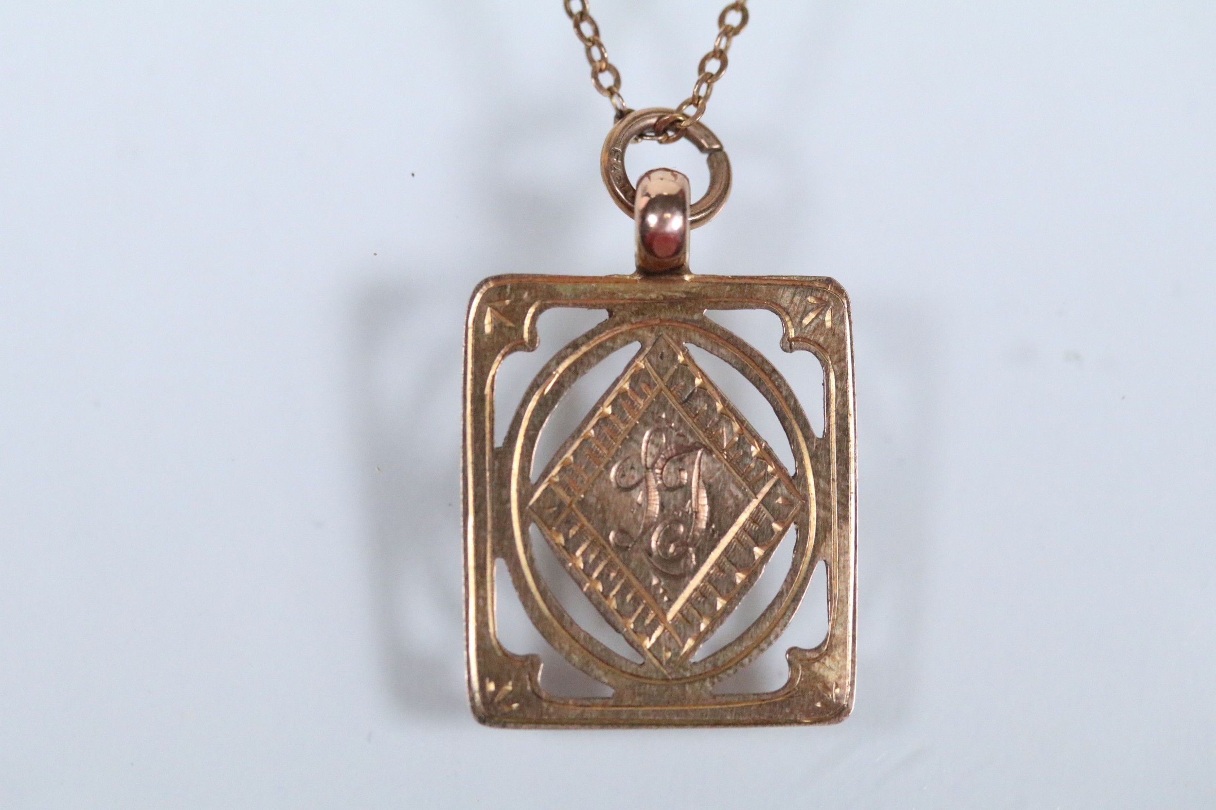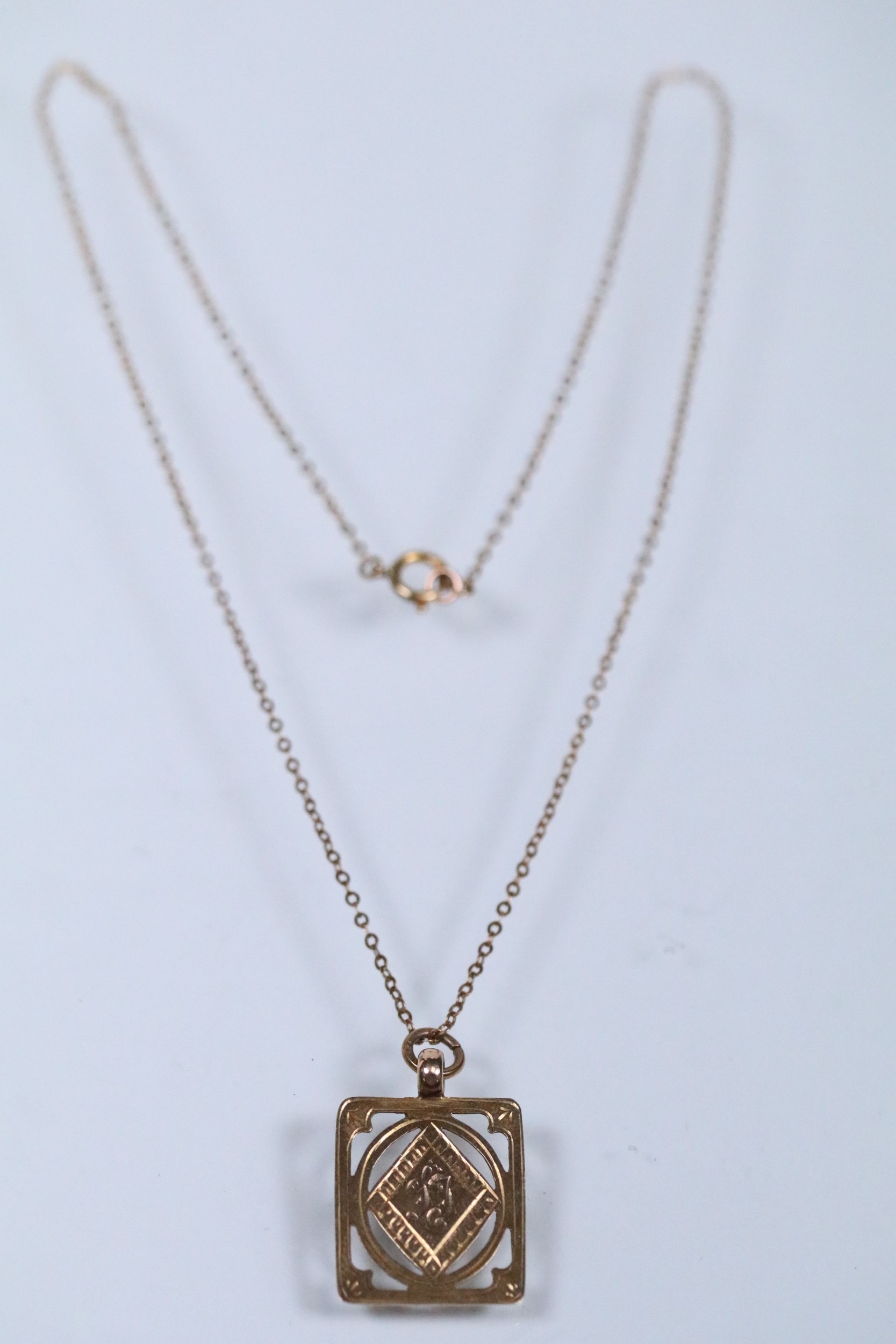 9ct gold pendant necklace having a fine link chain with a rectangular initial pendant with pierced details. Chain marked 9ct, pendant hallmarked Birmingham 1925).