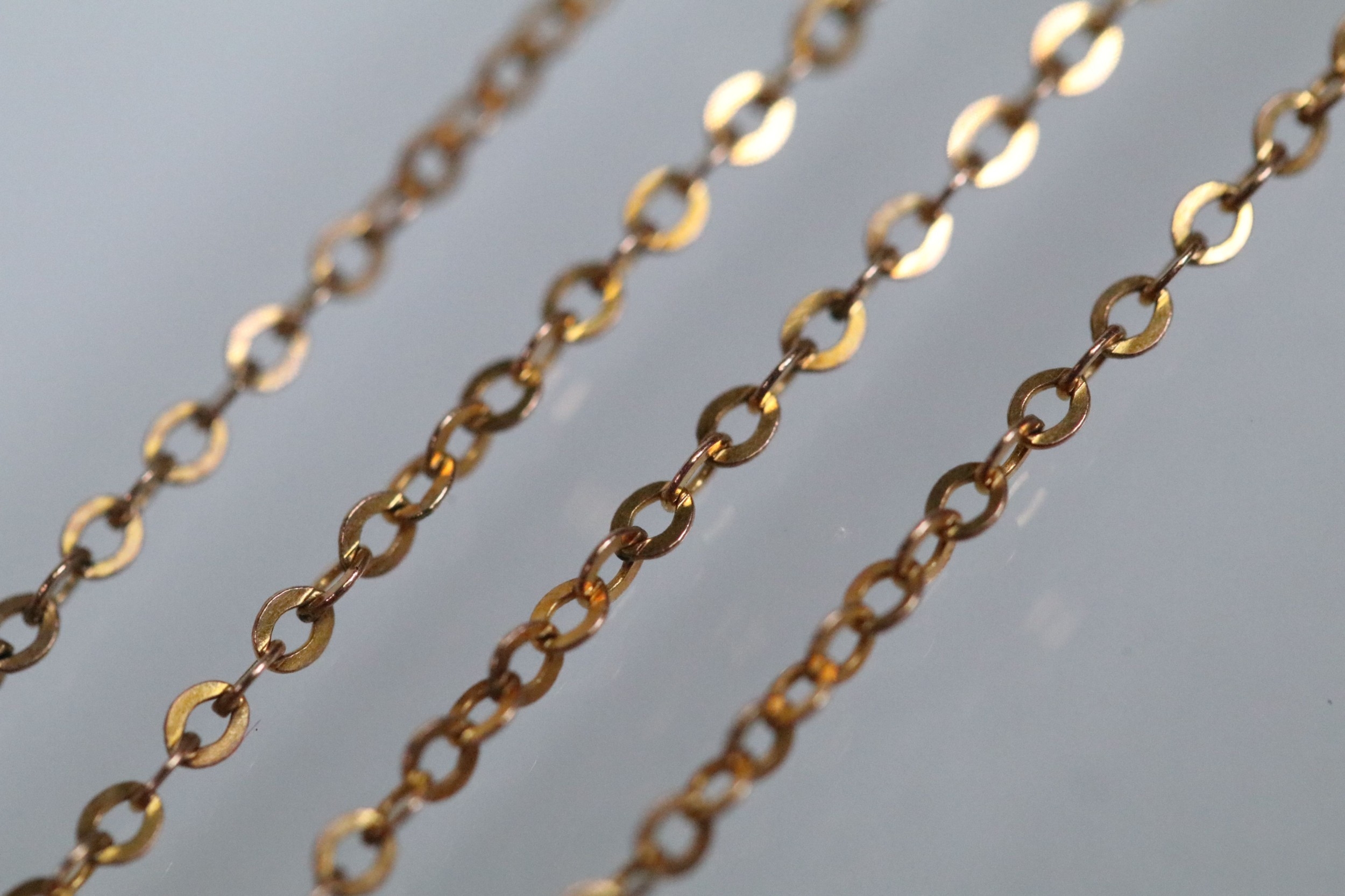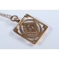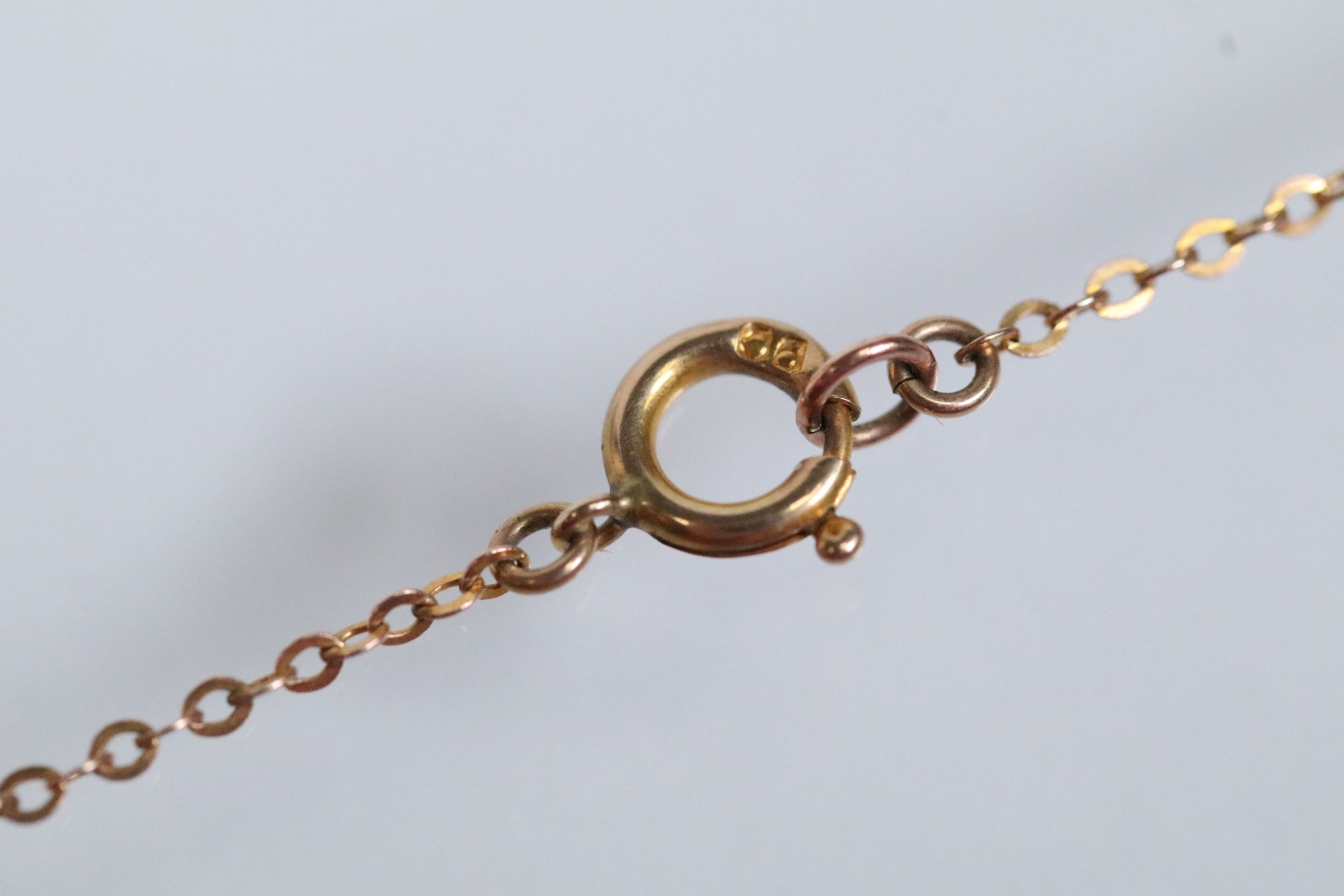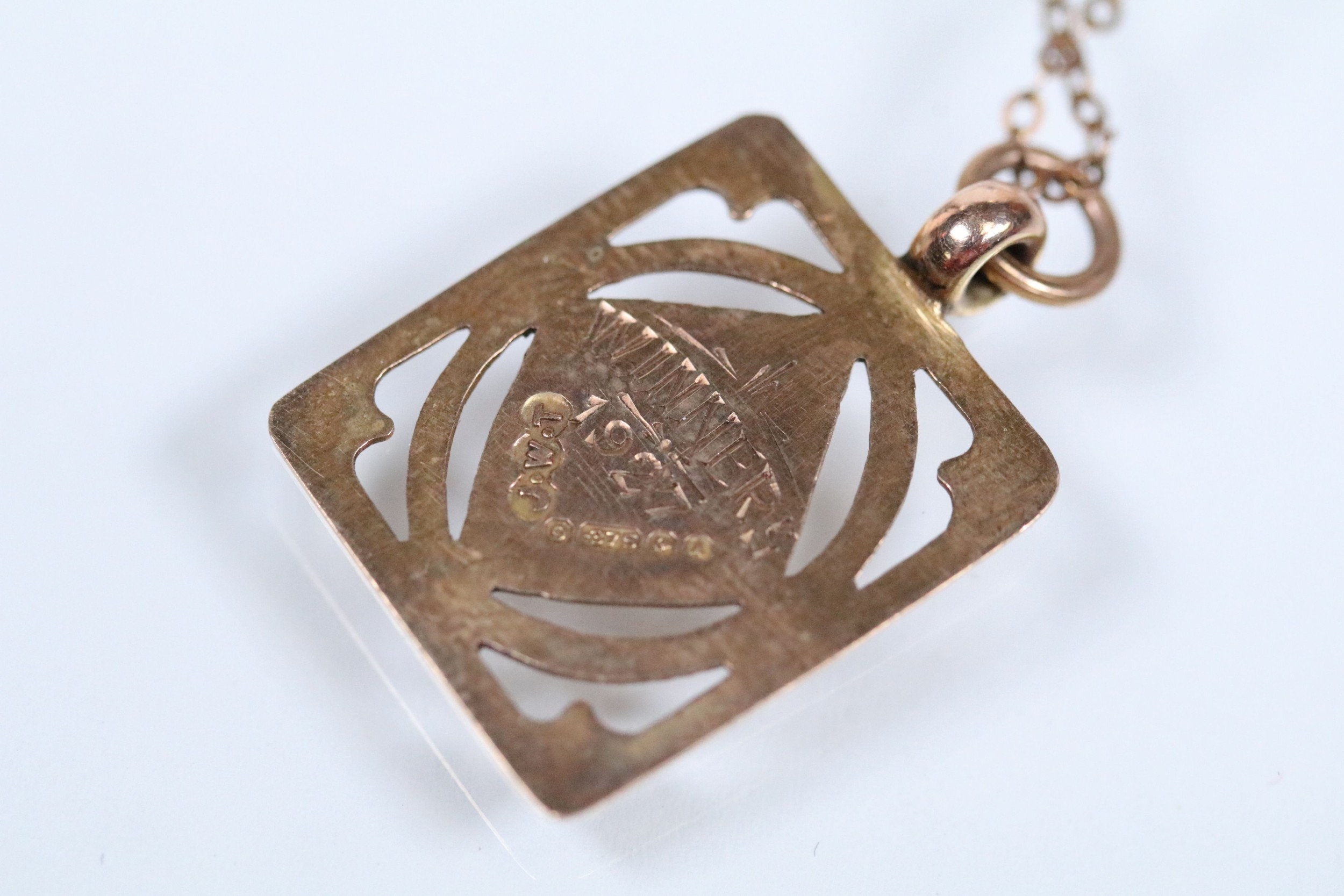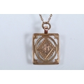 9ct gold pendant necklace having a fine link chain with a rectangular initial pendant with pierced details. Chain marked 9ct, pendant hallmarked Birmingham 1925).