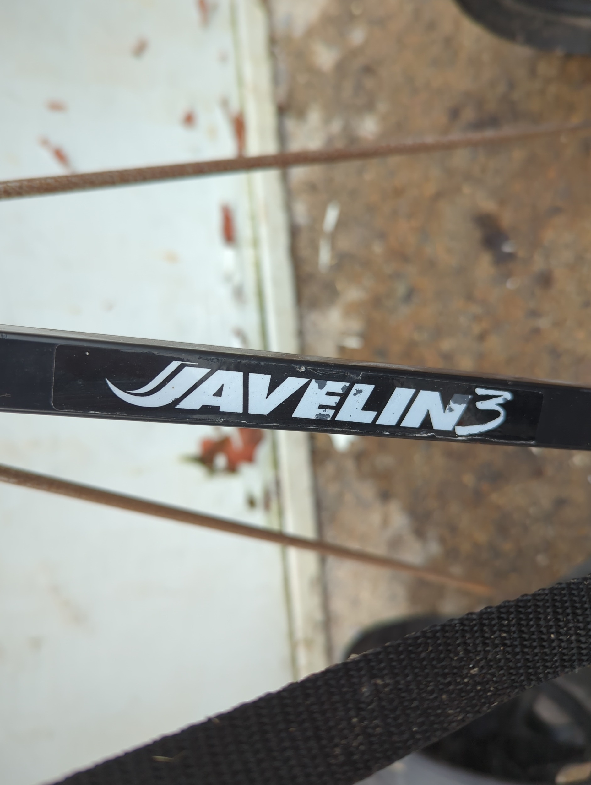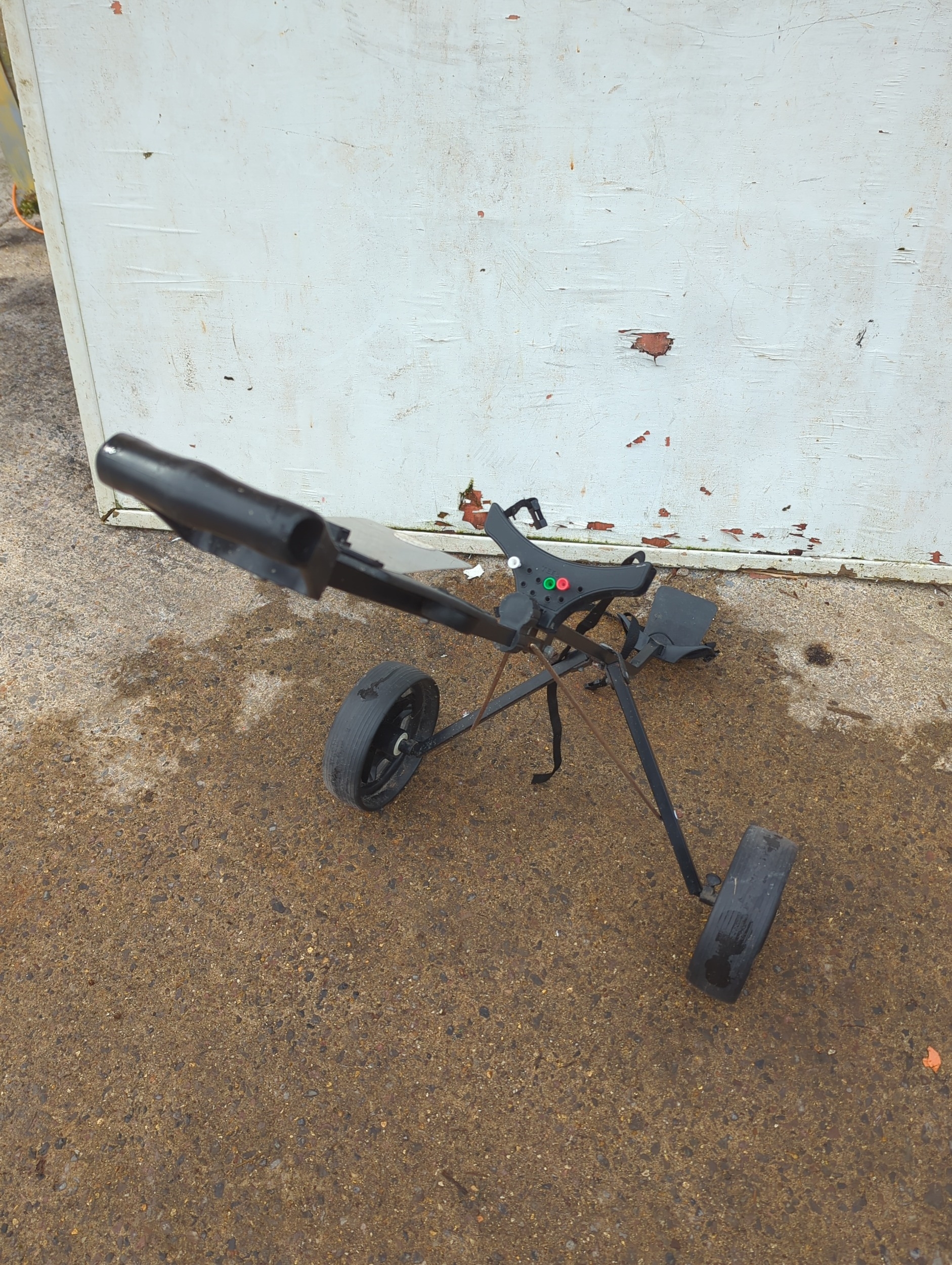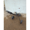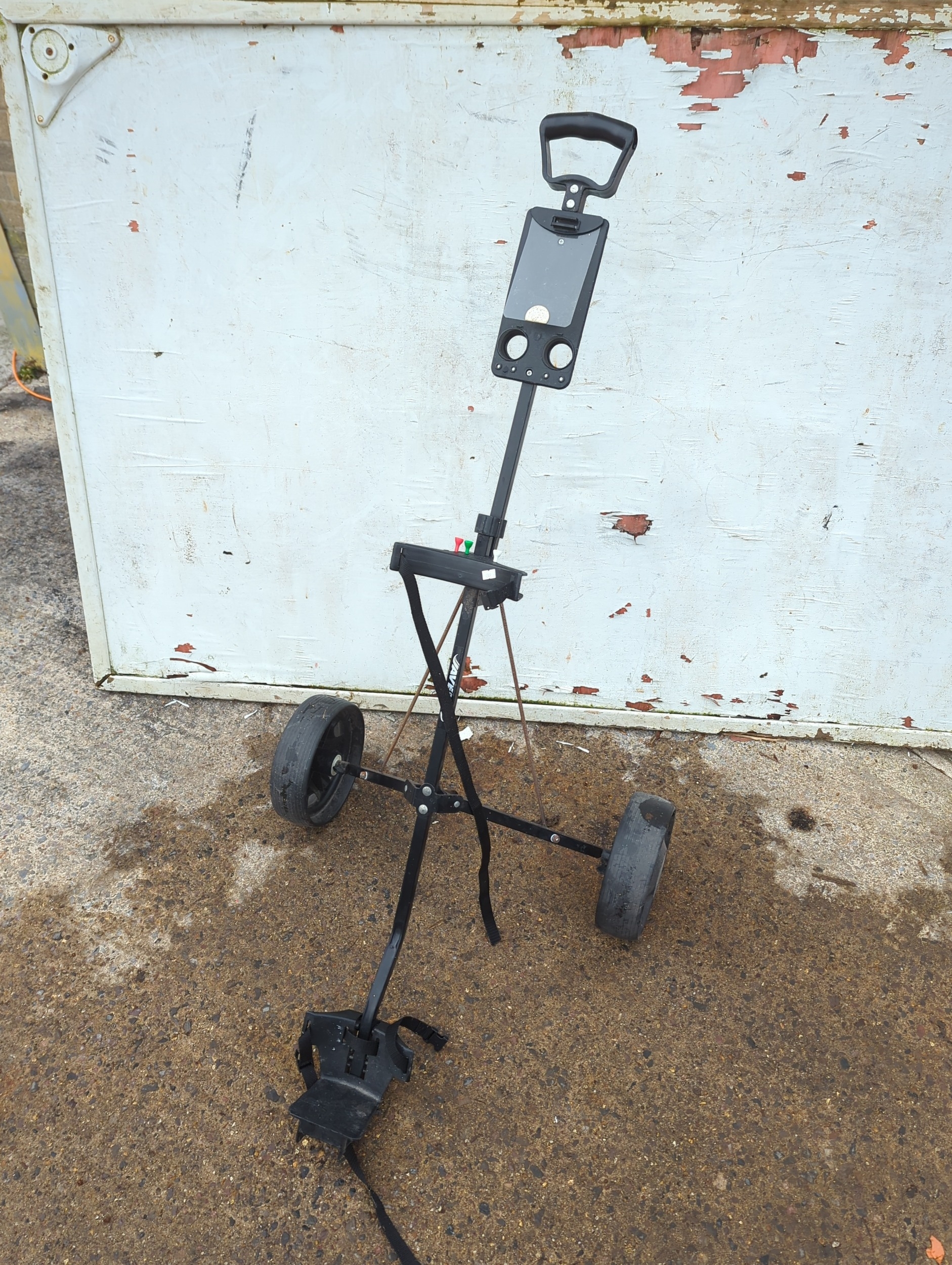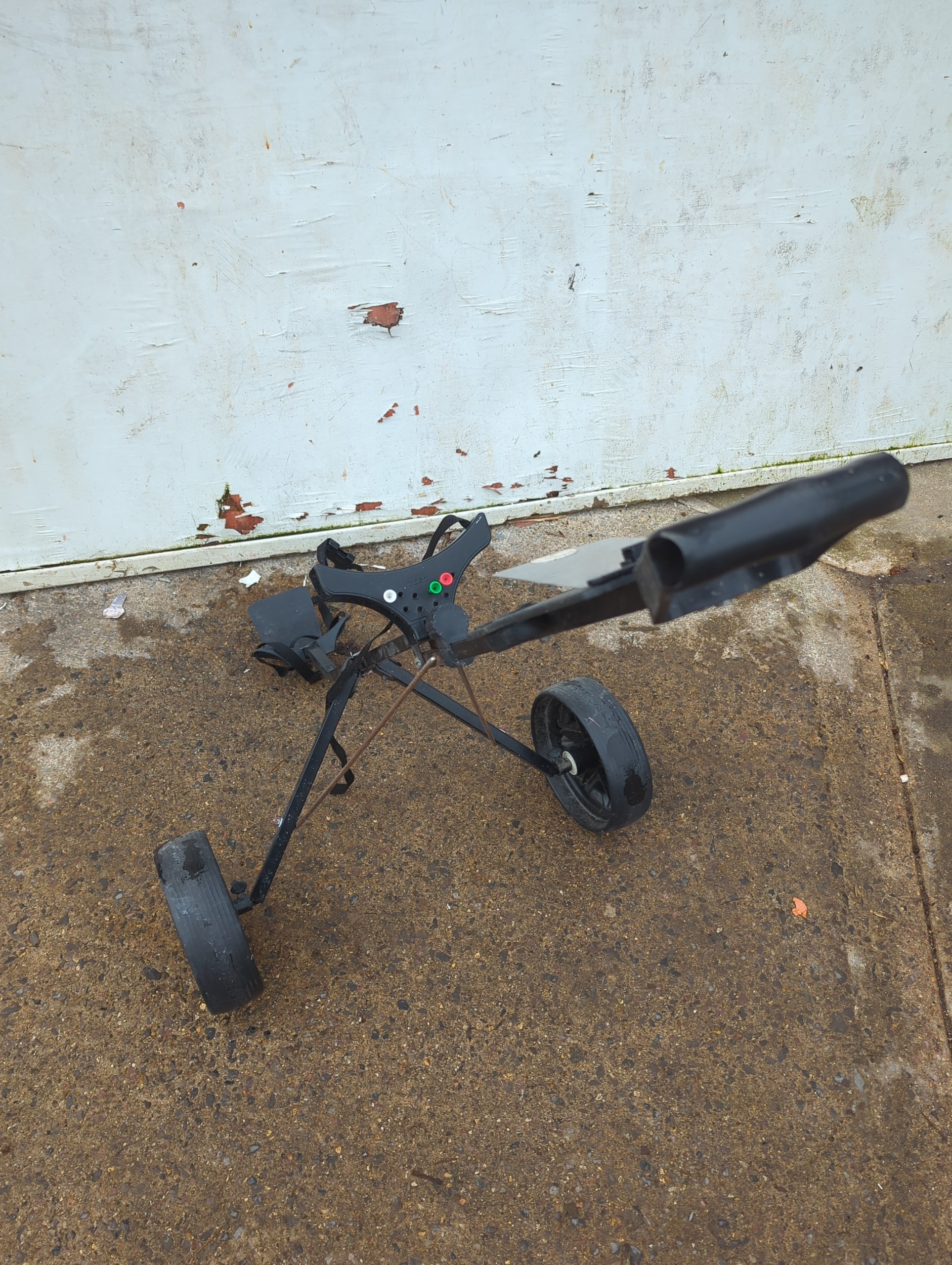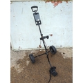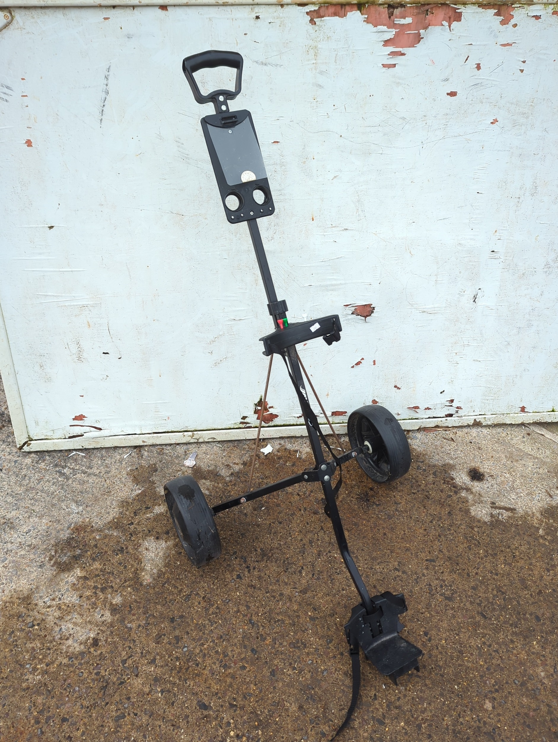 This is a Javelin 3 golf trolley designed for outdoor use on golf courses. It features a sturdy black frame with two wheels for easy maneuverability. The telescopic handle is adjustable and designed for comfortable handling, making it suitable for carrying golf bags of various sizes. The trolley is compact and foldable for convenient storage and transport.