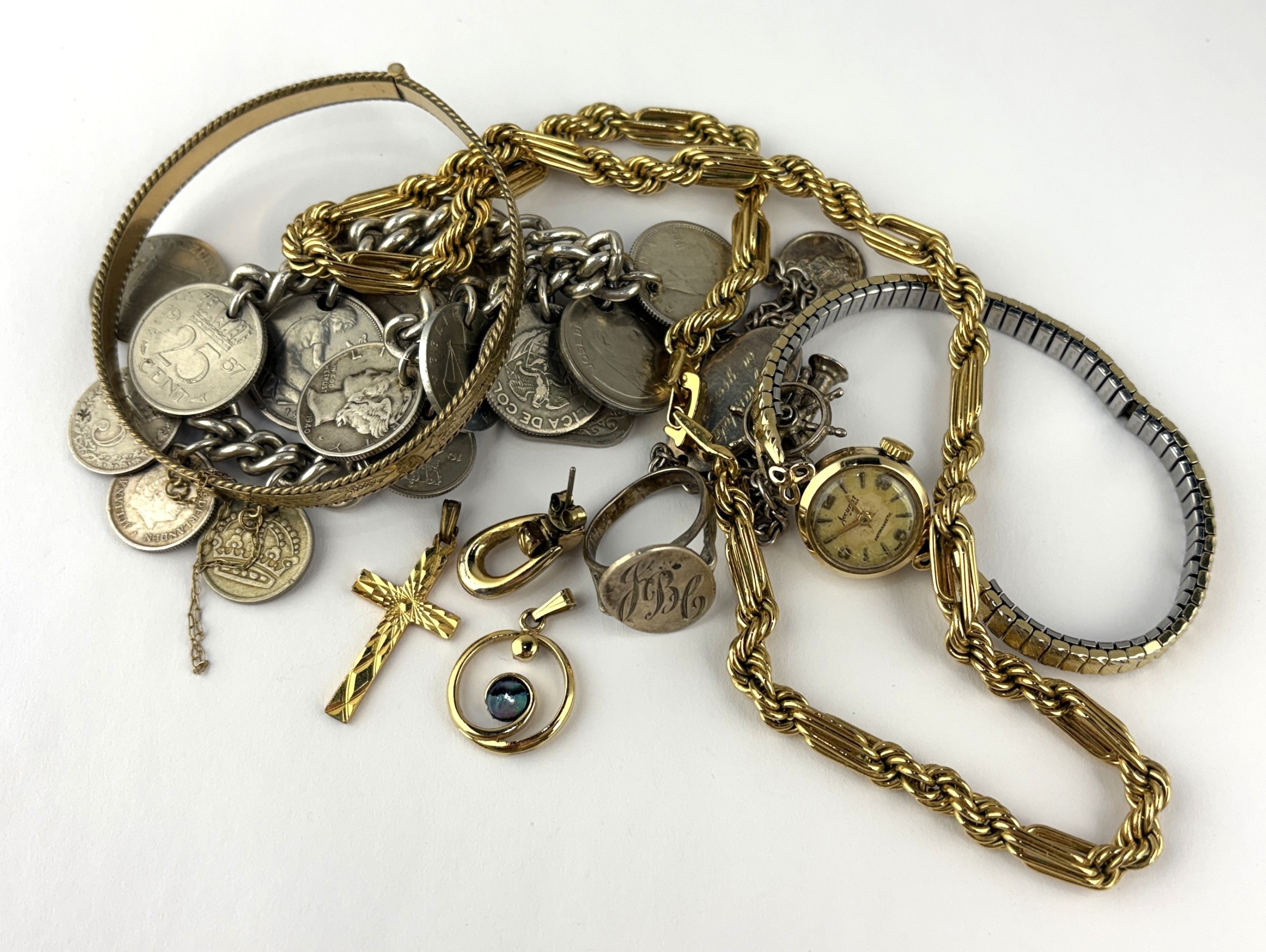 An Accurist 9ct gold circular cased ladies wrist watch on an expanding metal bracelet, a mostly base metal coin bracelet, a gilt metal neck chain, a gilt metal bangle and four further items of jewellery