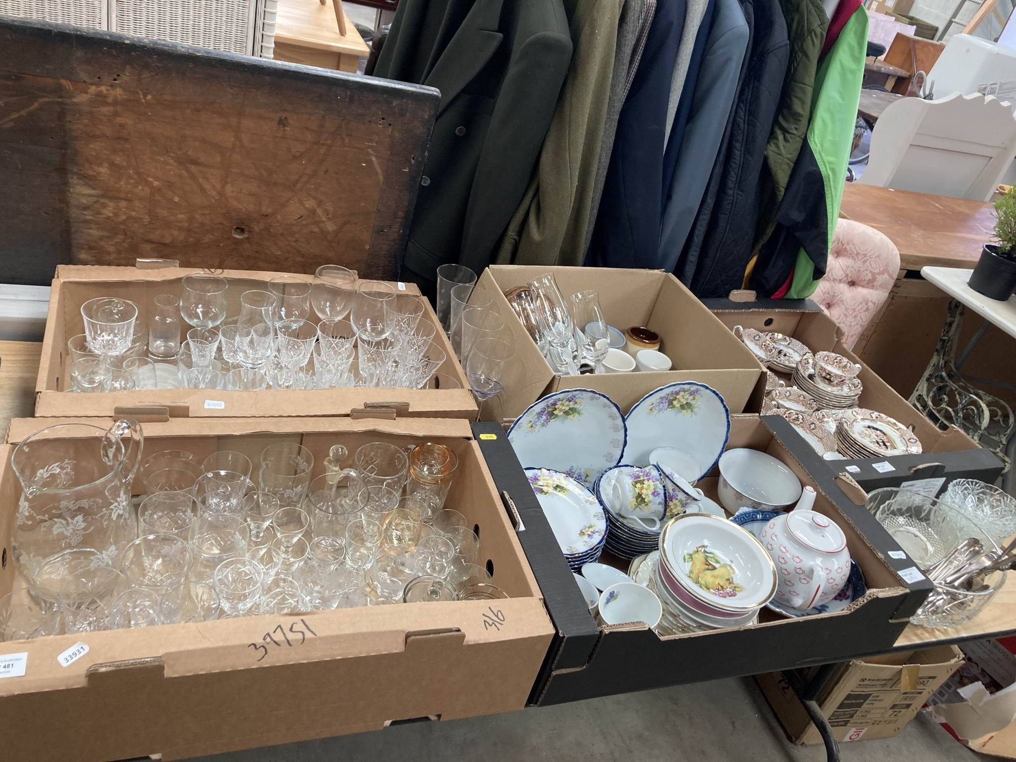 34 pieces early 20th century Chinoiserie Oriental tea wares, 28 pieces early 20th century floral decorated tea wares, assorted commemorative mugs, assorted glass ware incl cut glass etc
