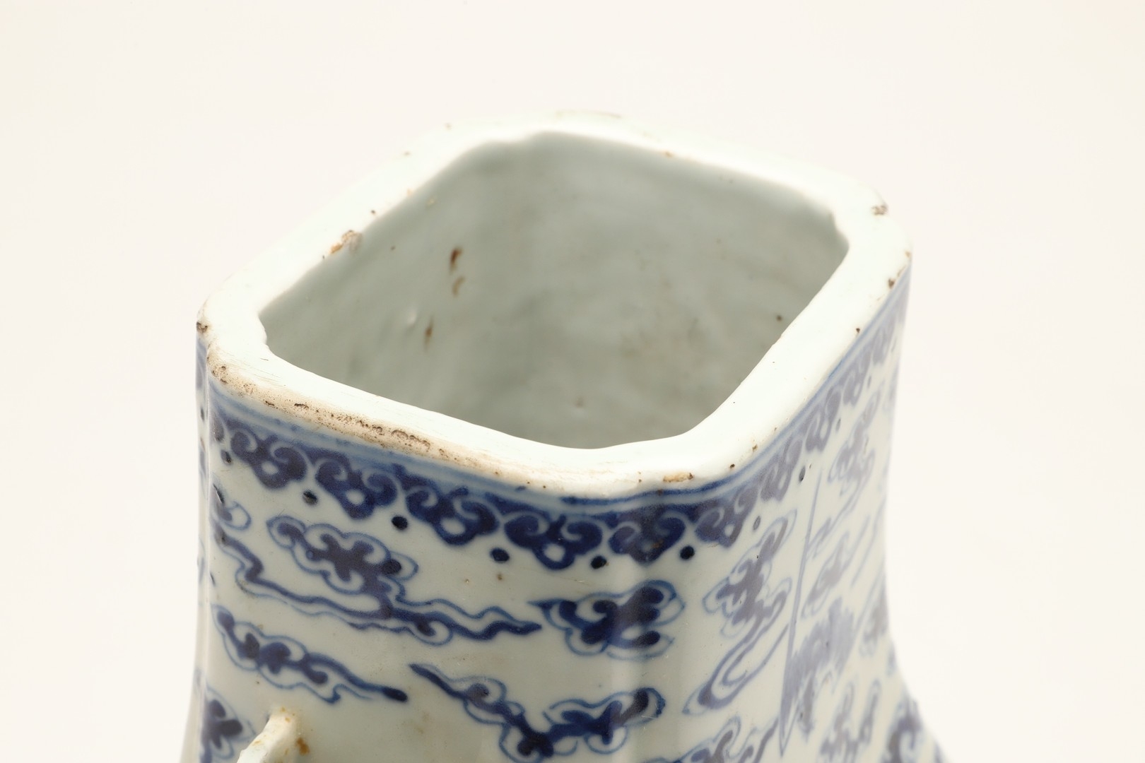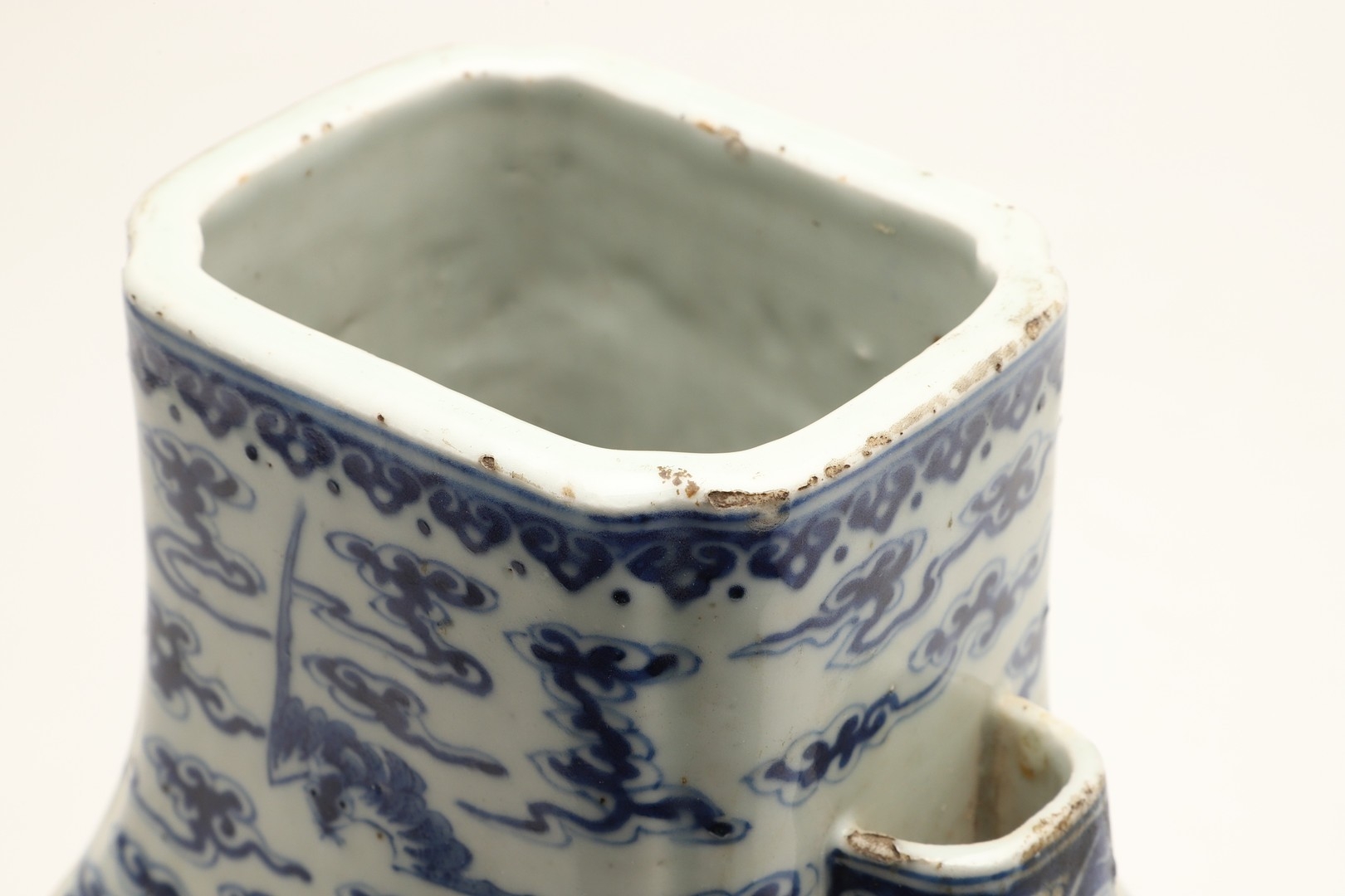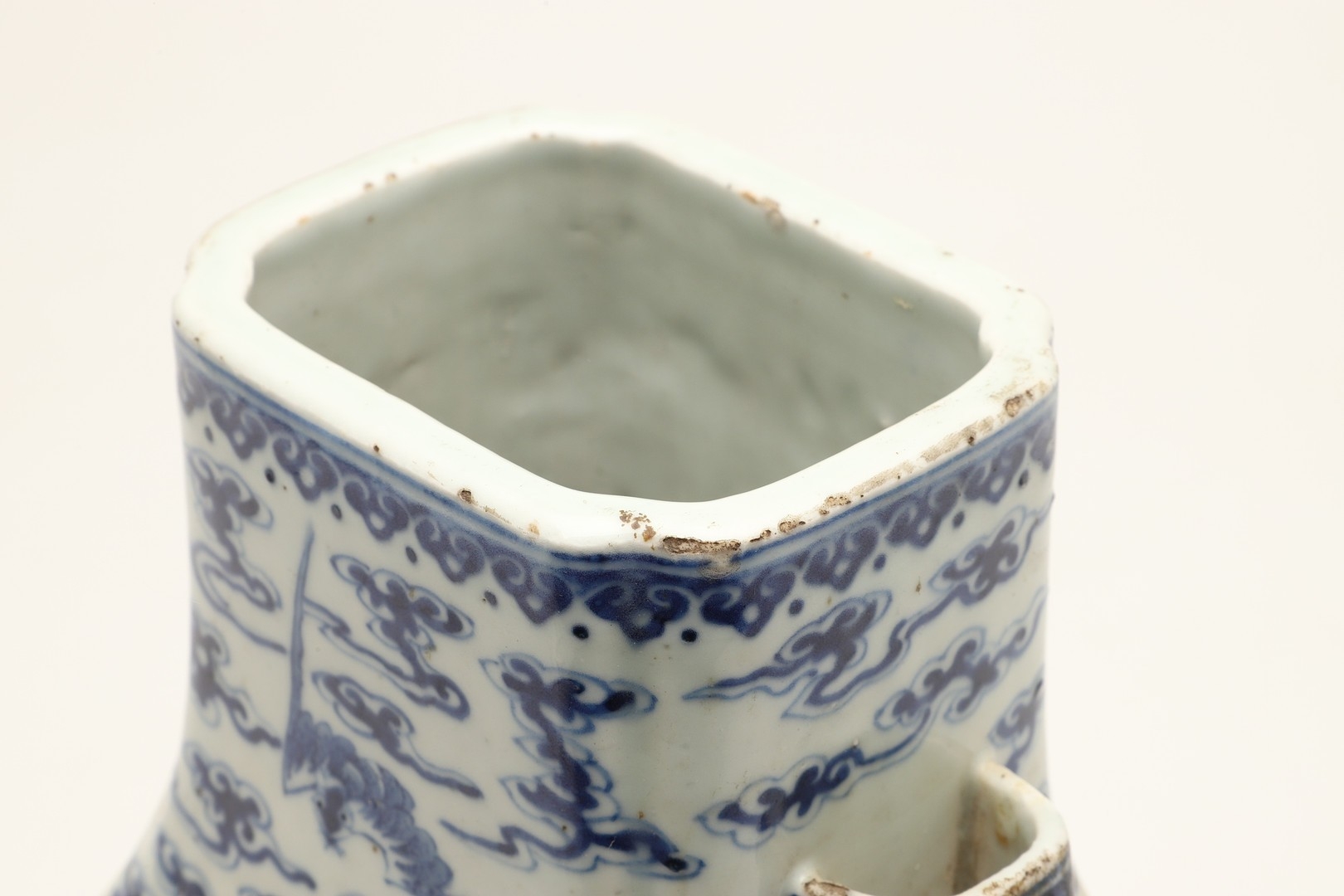 Fritting and a little glaze loss to the rim in places, fritting and small nibbles to the handles, small chip to the inside rim, otherwise seems generally fine.