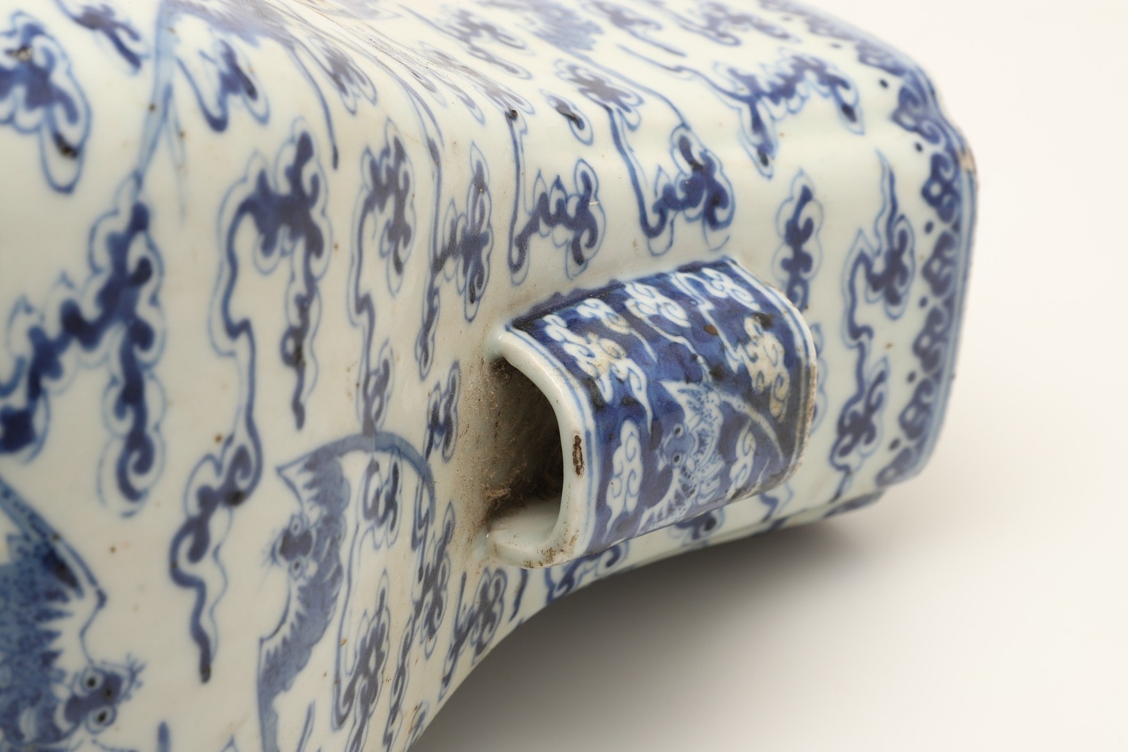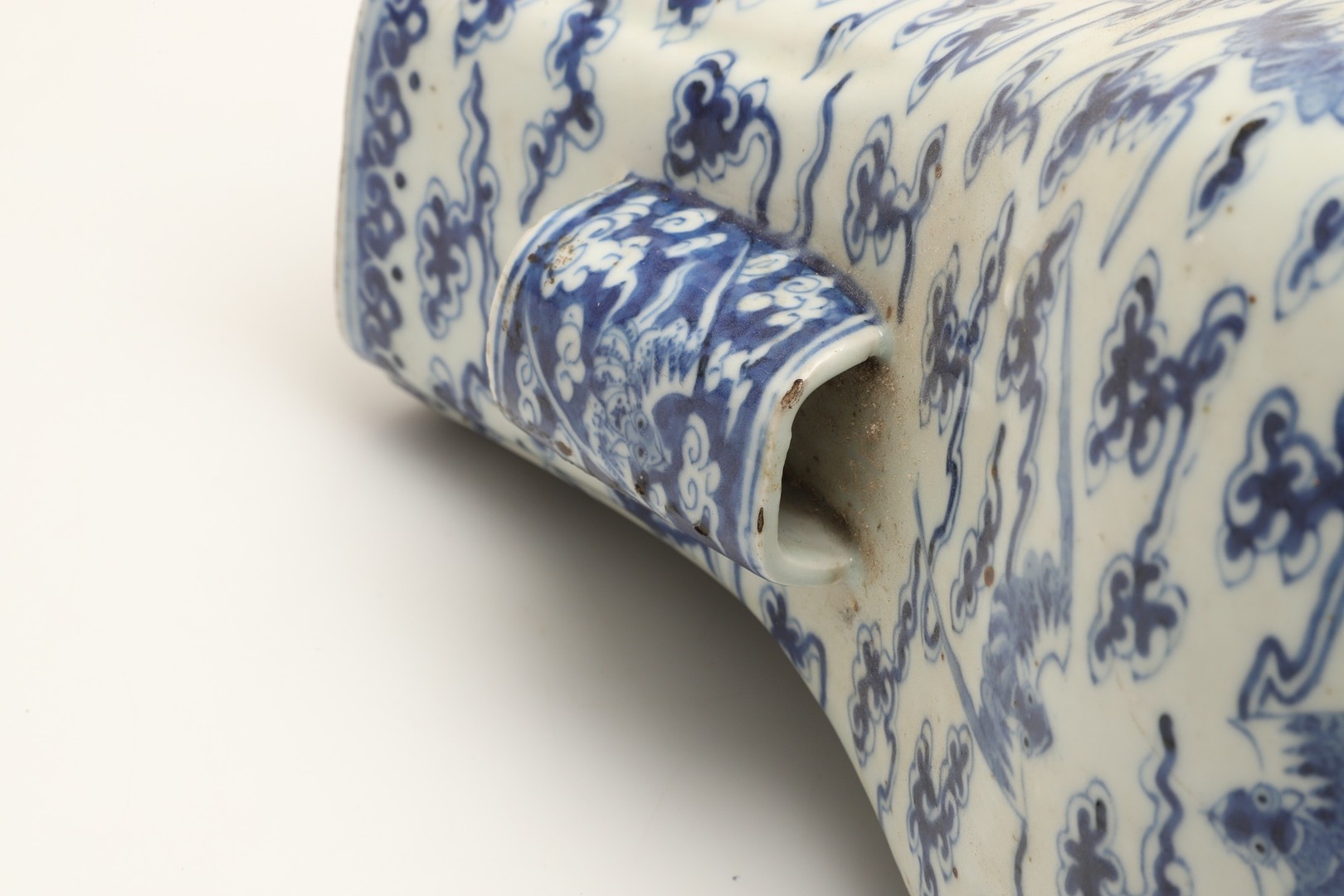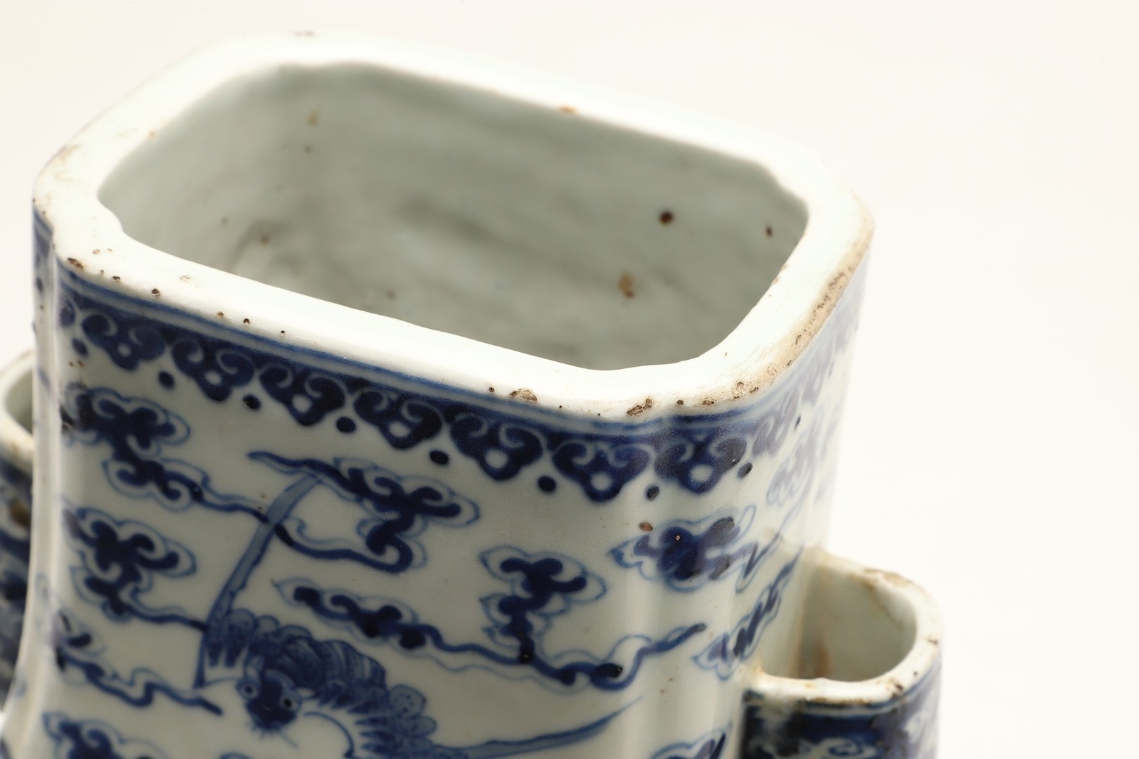Fritting and a little glaze loss to the rim in places, fritting and small nibbles to the handles, small chip to the inside rim, otherwise seems generally fine.