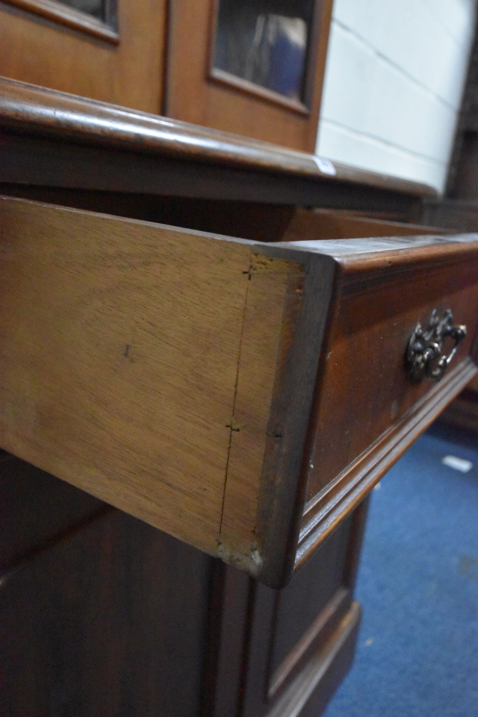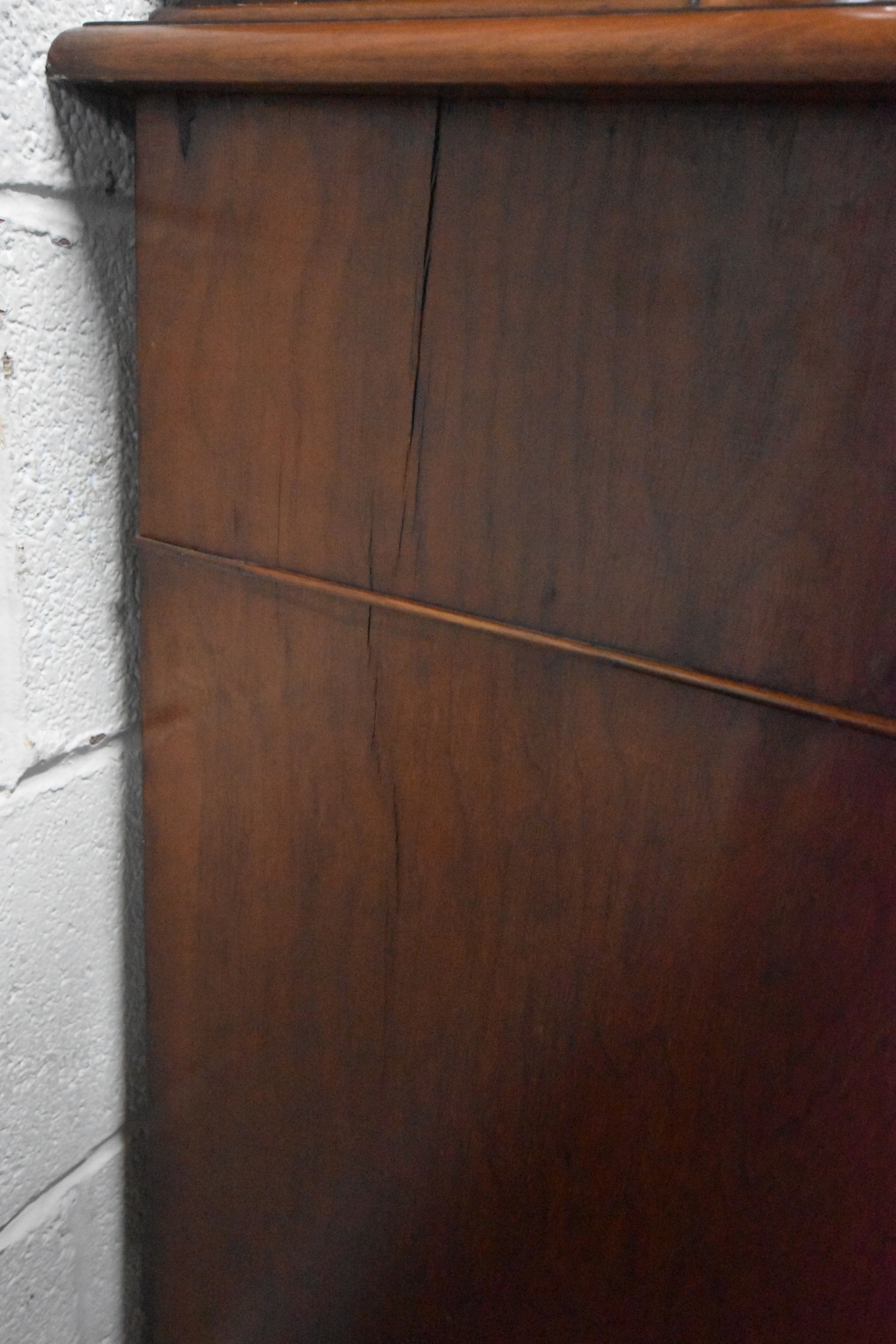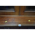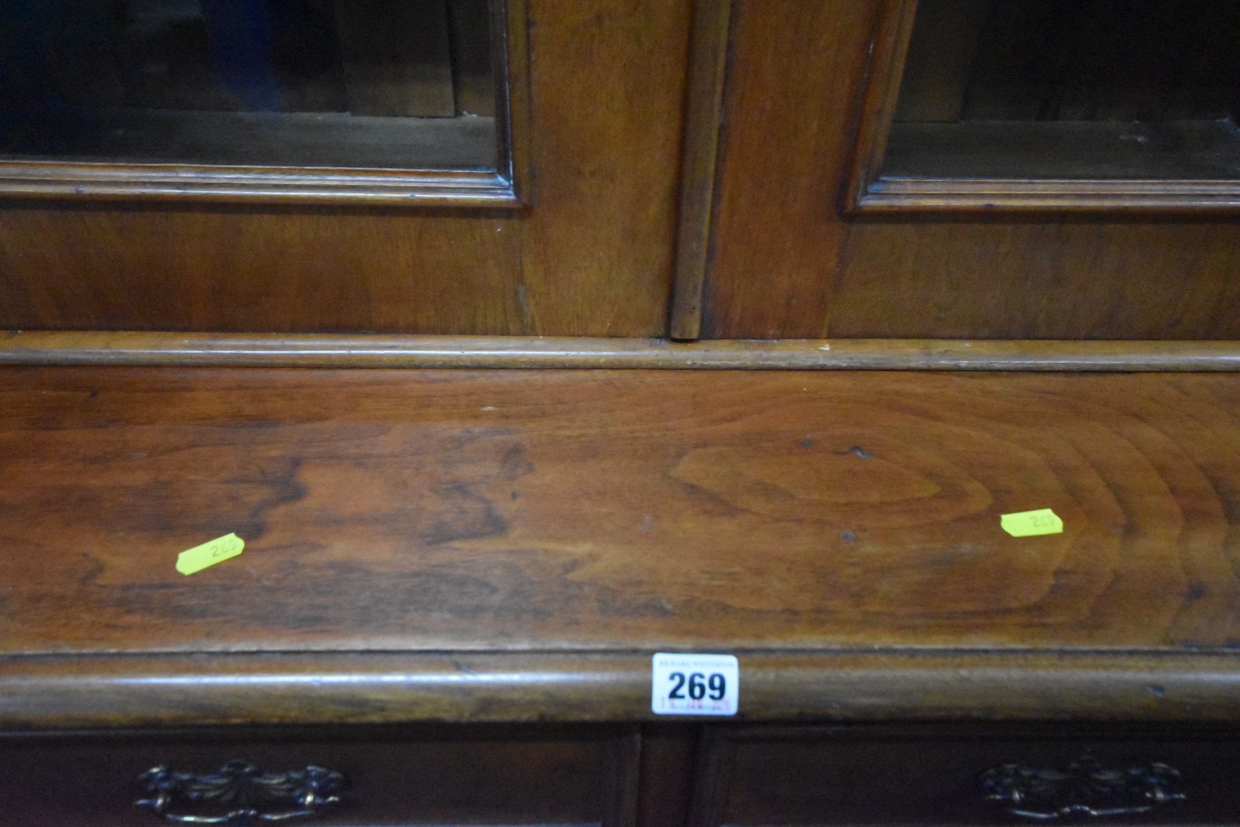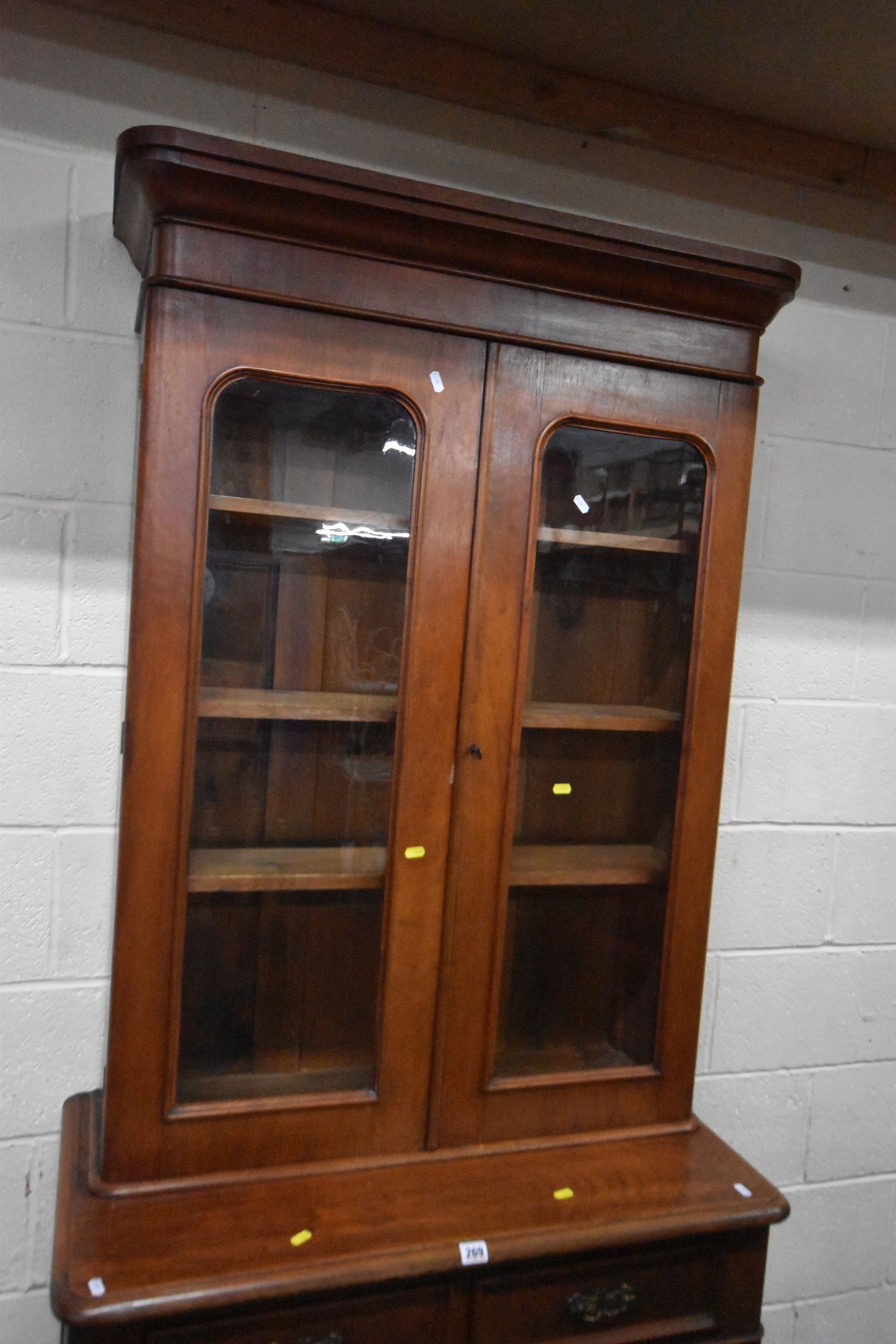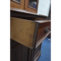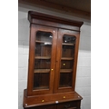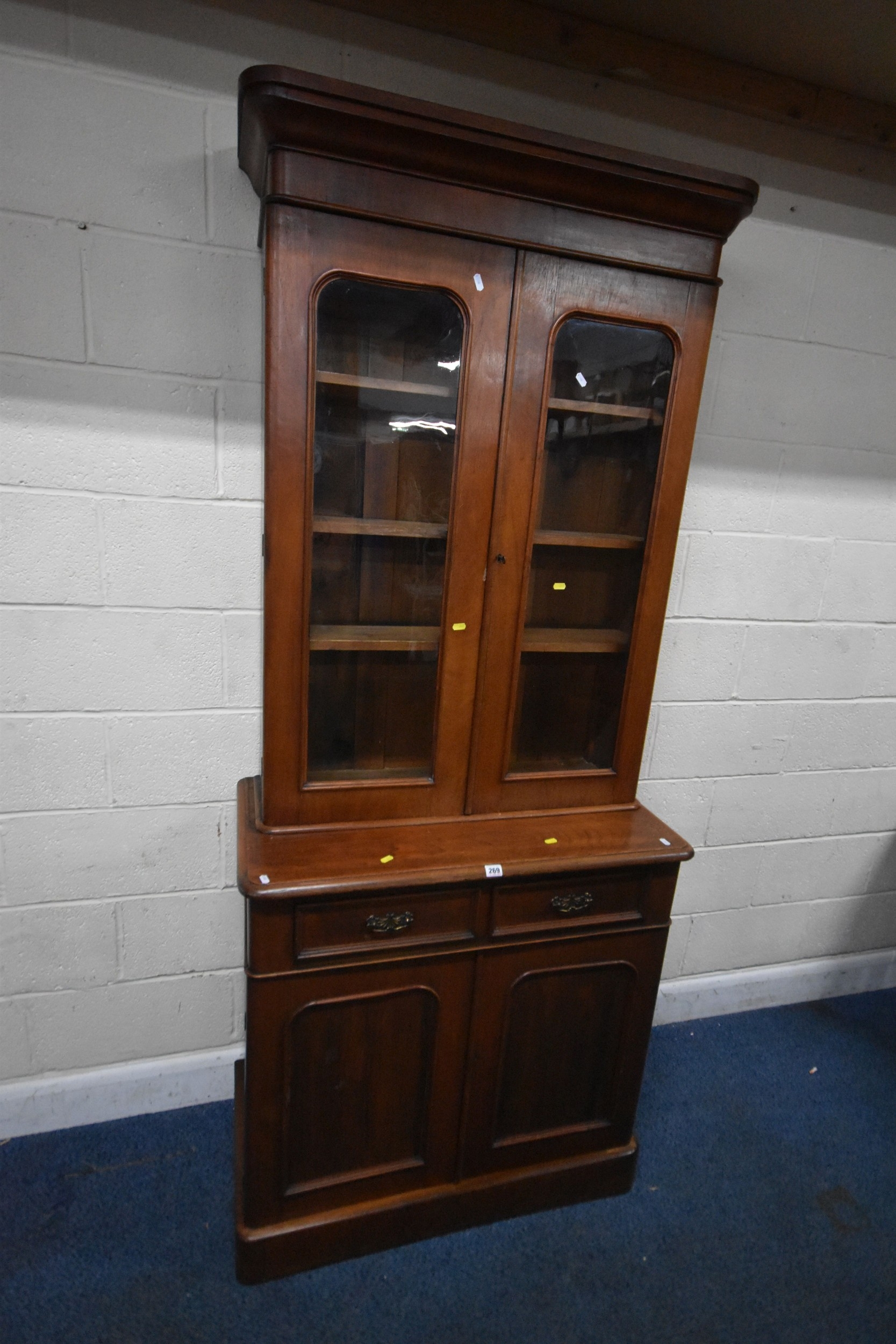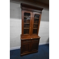 A 19TH CENTURY MAHOGANY BOOKCASE, the double glazed doors enclosing three shelves, atop a base with two drawers over double cupboard doors, condition report: historical marks, scuffs, splits, one key, other wear and usage (2 sections)
