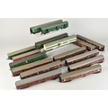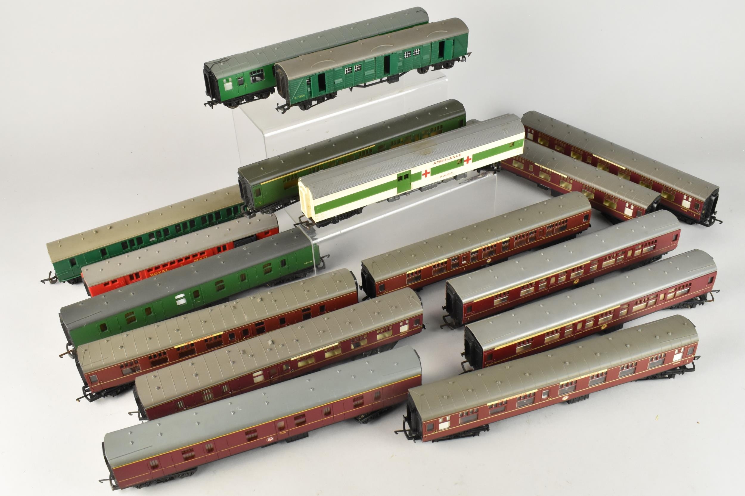 A Collection of Sixteen Various OO Gauge Coaches to include Six Hornby Caledonian, Playcraft Royal Mail Coach, Triang RAMC Ambulance Etc