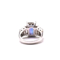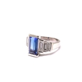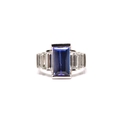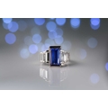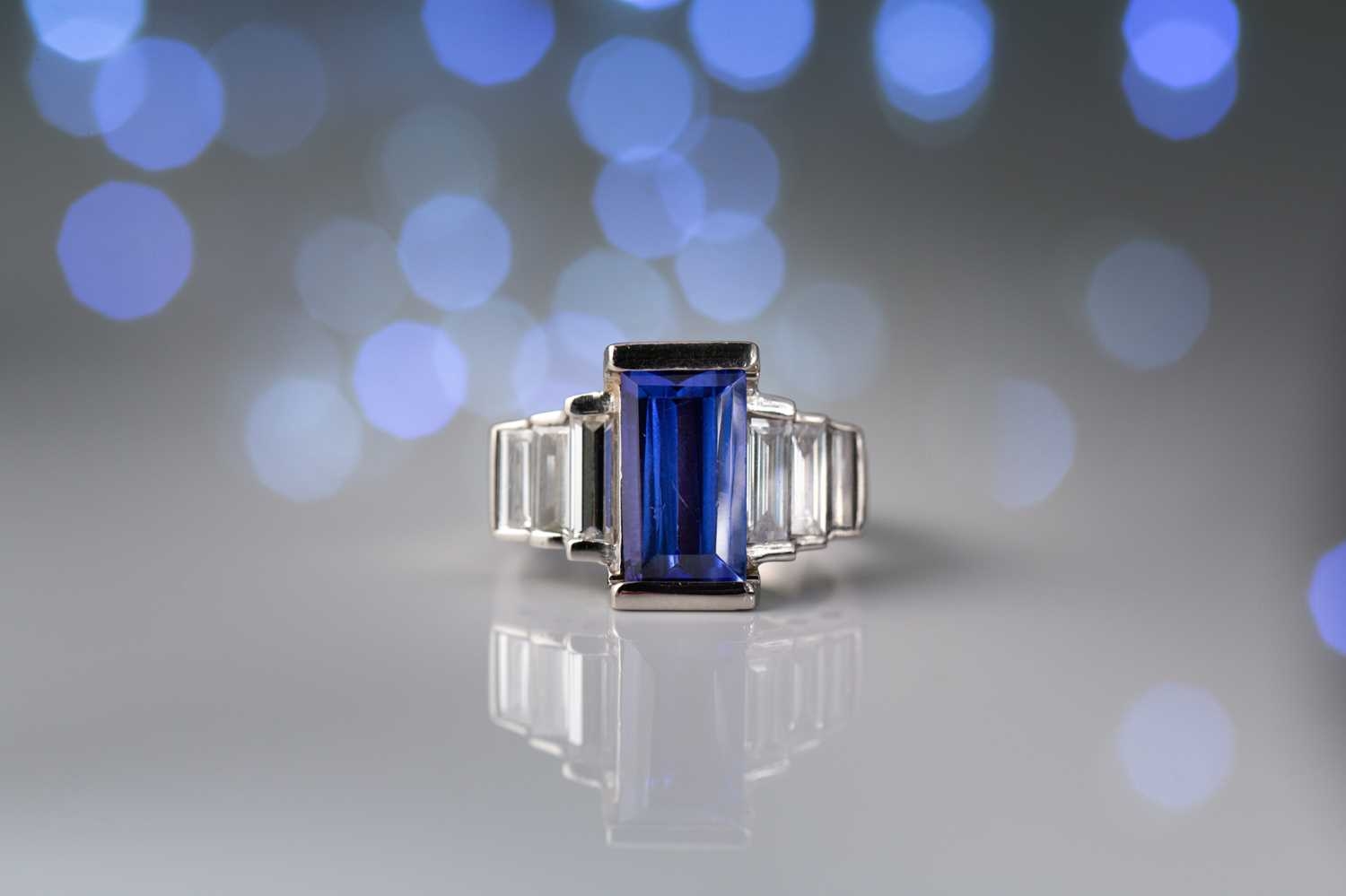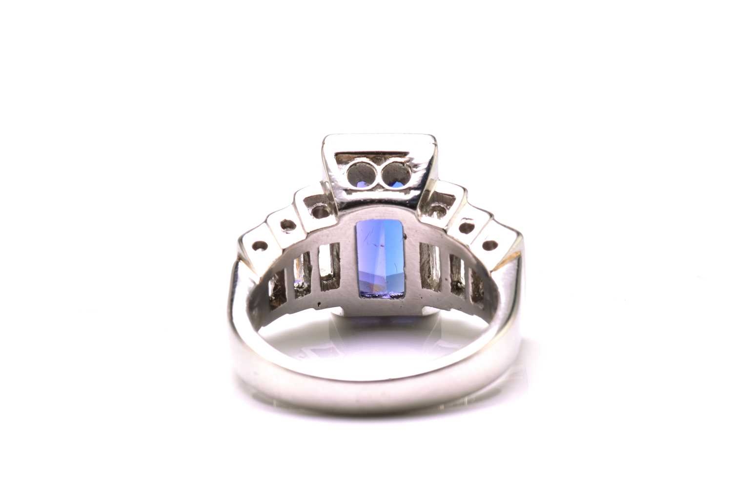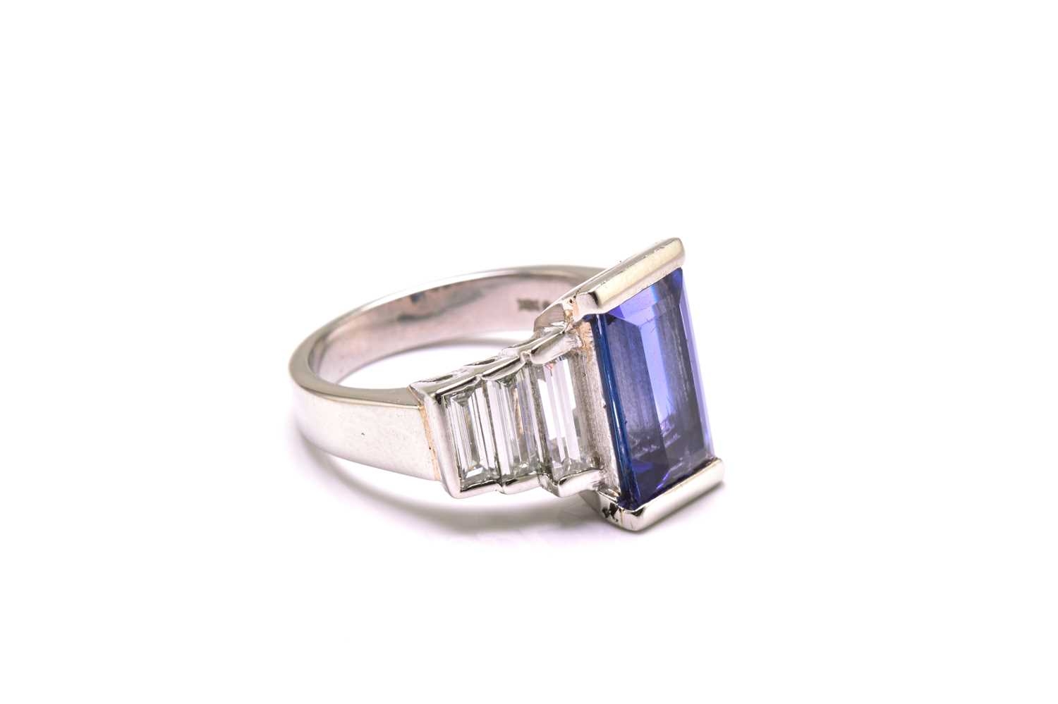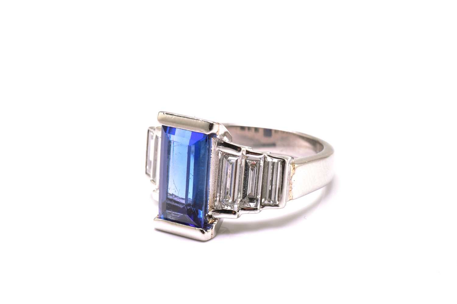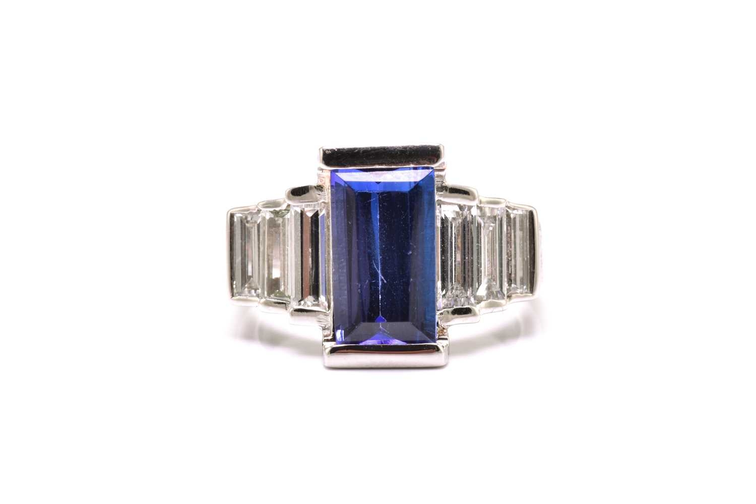 An Art Deco-style platinum tanzanite and diamond ring, featuring a tapered rectangular step-cut tanzanite, approximately measuring 10.8 x 6.5 mm, channel set in the centre, flanked by six descending baguette diamonds with an estimated total weight of 0.82ct, to a plain flat shank, London hallmarked '950' with sponsor's mark 'DJE', dated 2018, ring size M, total weight of item 13.5 grams.