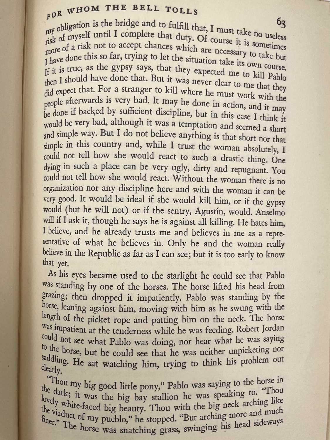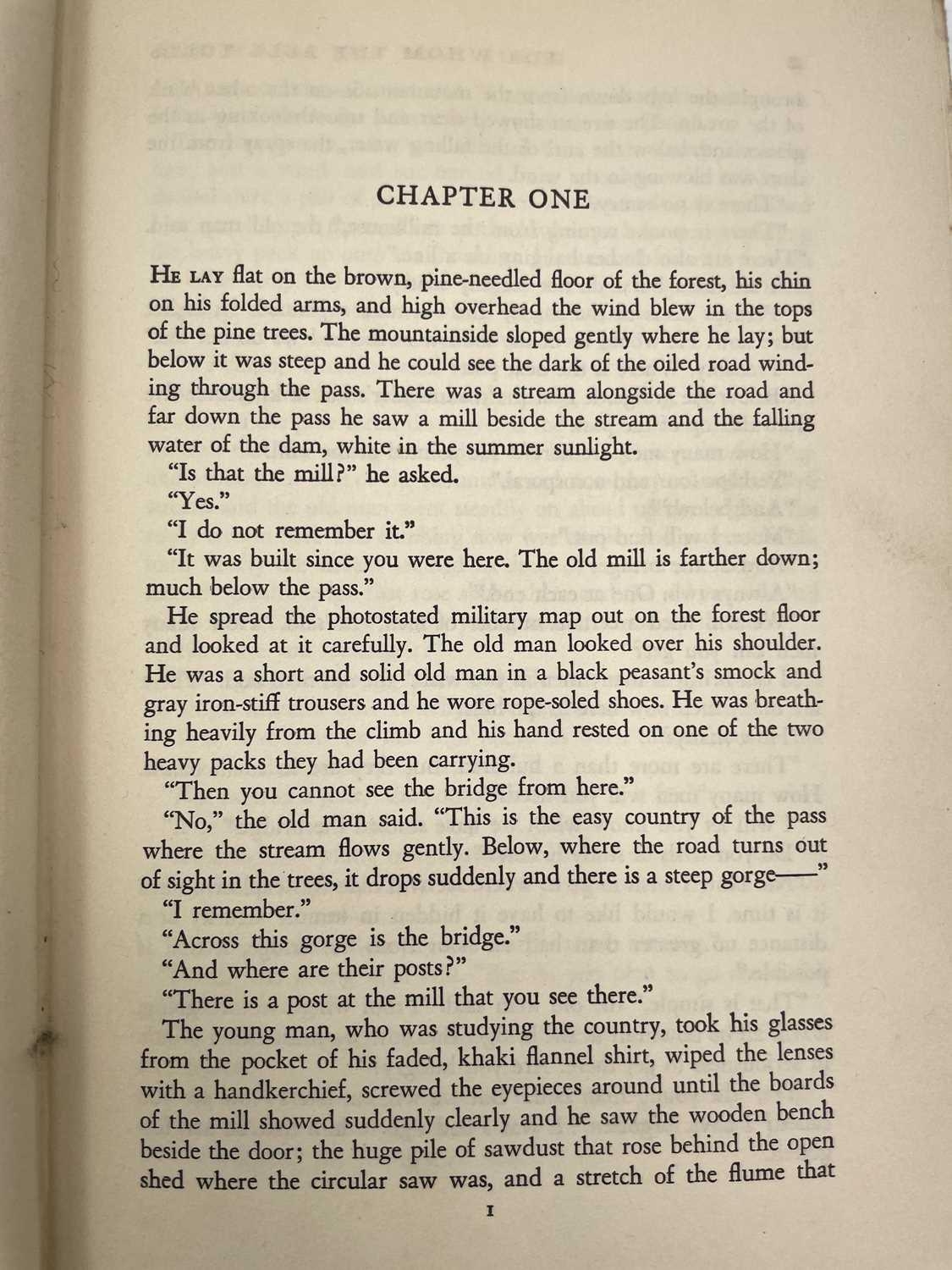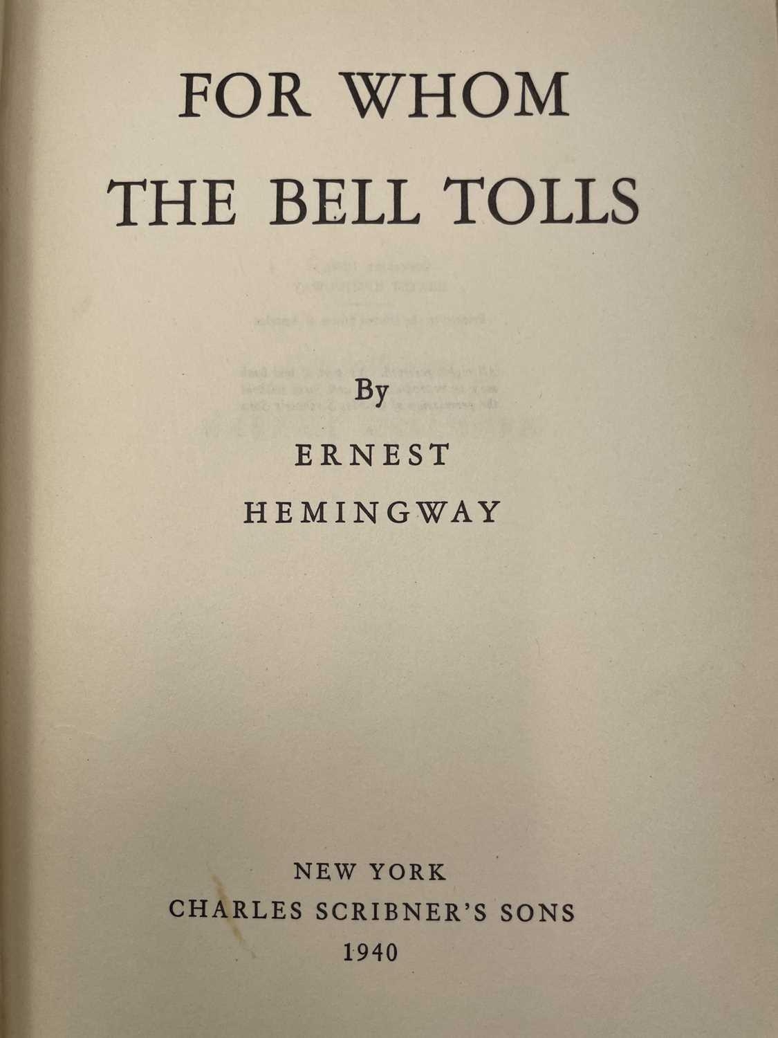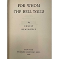 ERNEST HEMINGWAY. 'For Whom The Bell Tolls,' first edition, lacking dj, original cloth, ex libris pate for 'Pierre Gildesgame', indistinct inscription to endpaper, Charles Scribner's Sons, New York, 1940.