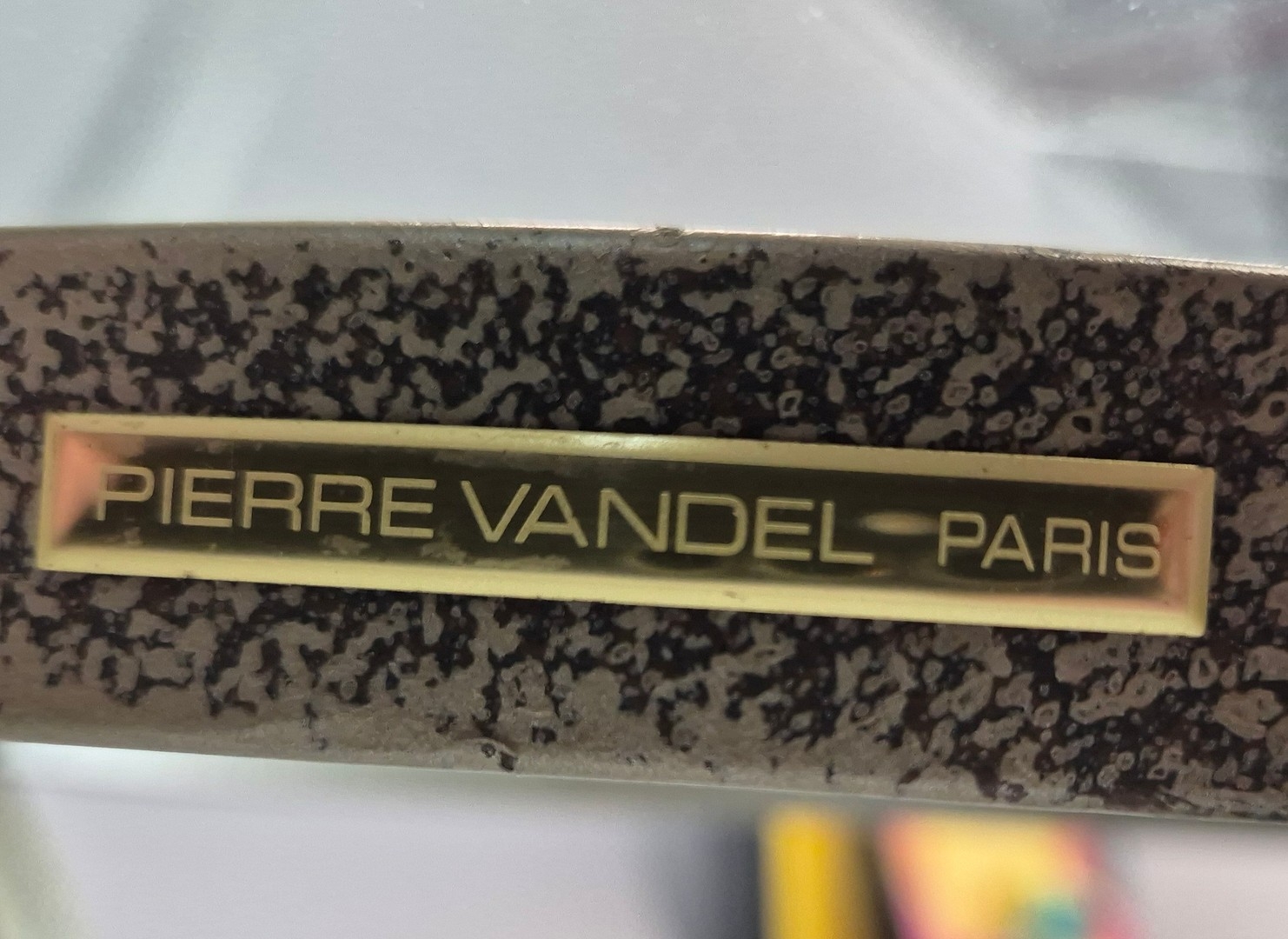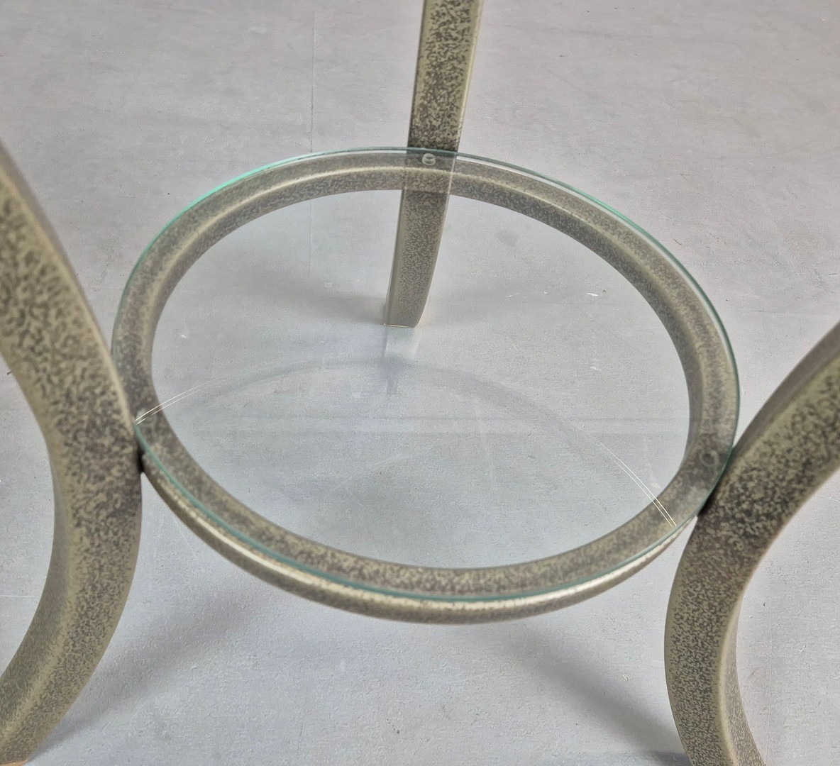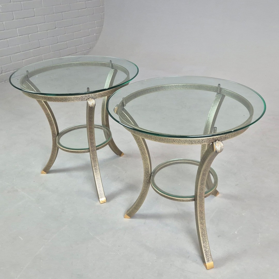 PIERRE VANDAL SIDE TABLES, A PAIR. with circular glass tops on verdigris bases each 60cm w x 62cm t.