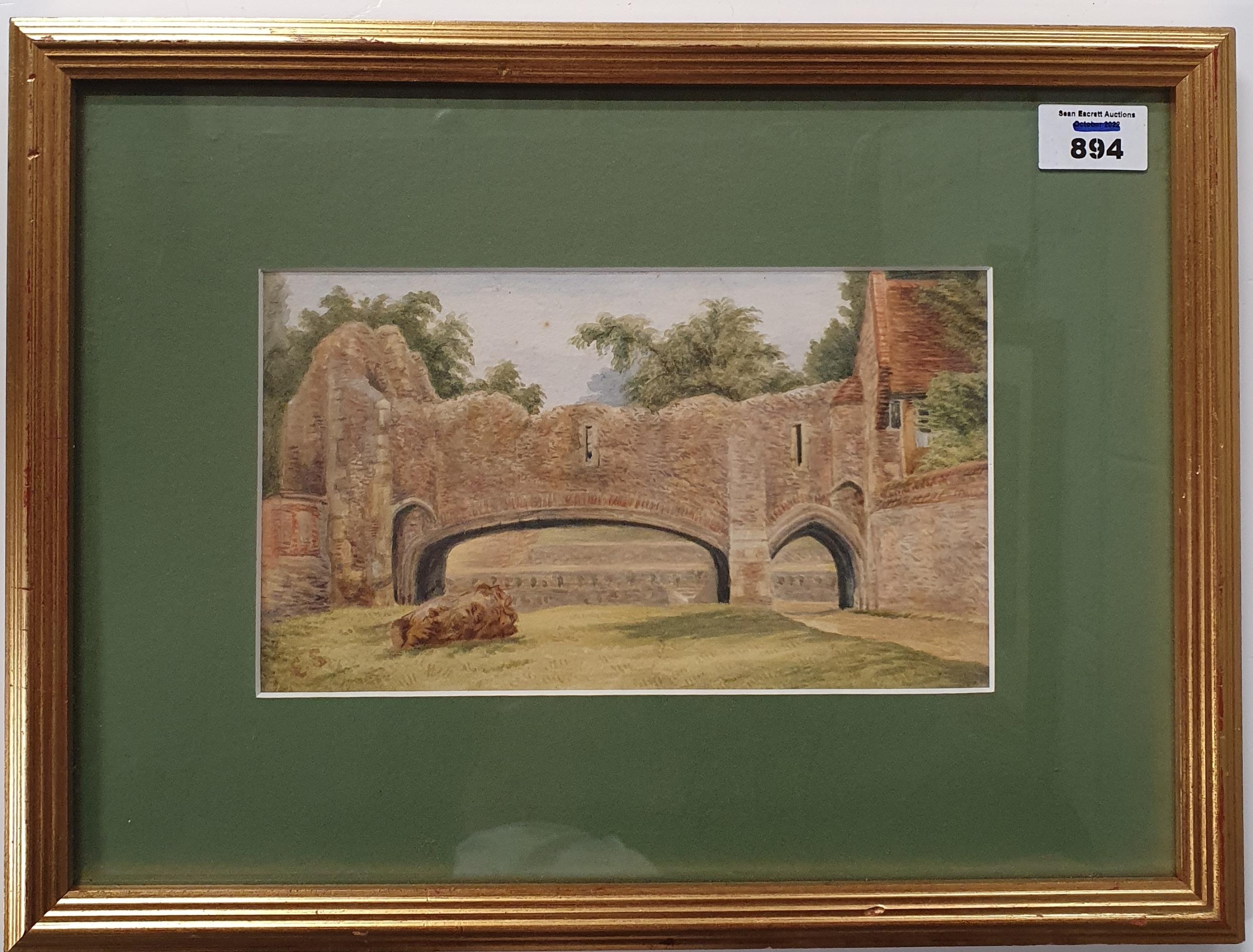 An early 20th Century Watercolour of a Castle ruin, monogramed E S lower left. 14 x 23 cm approx.