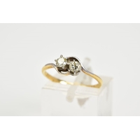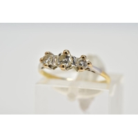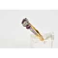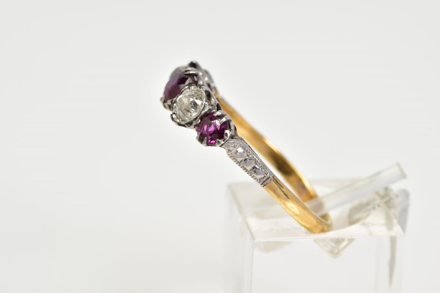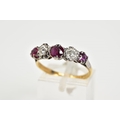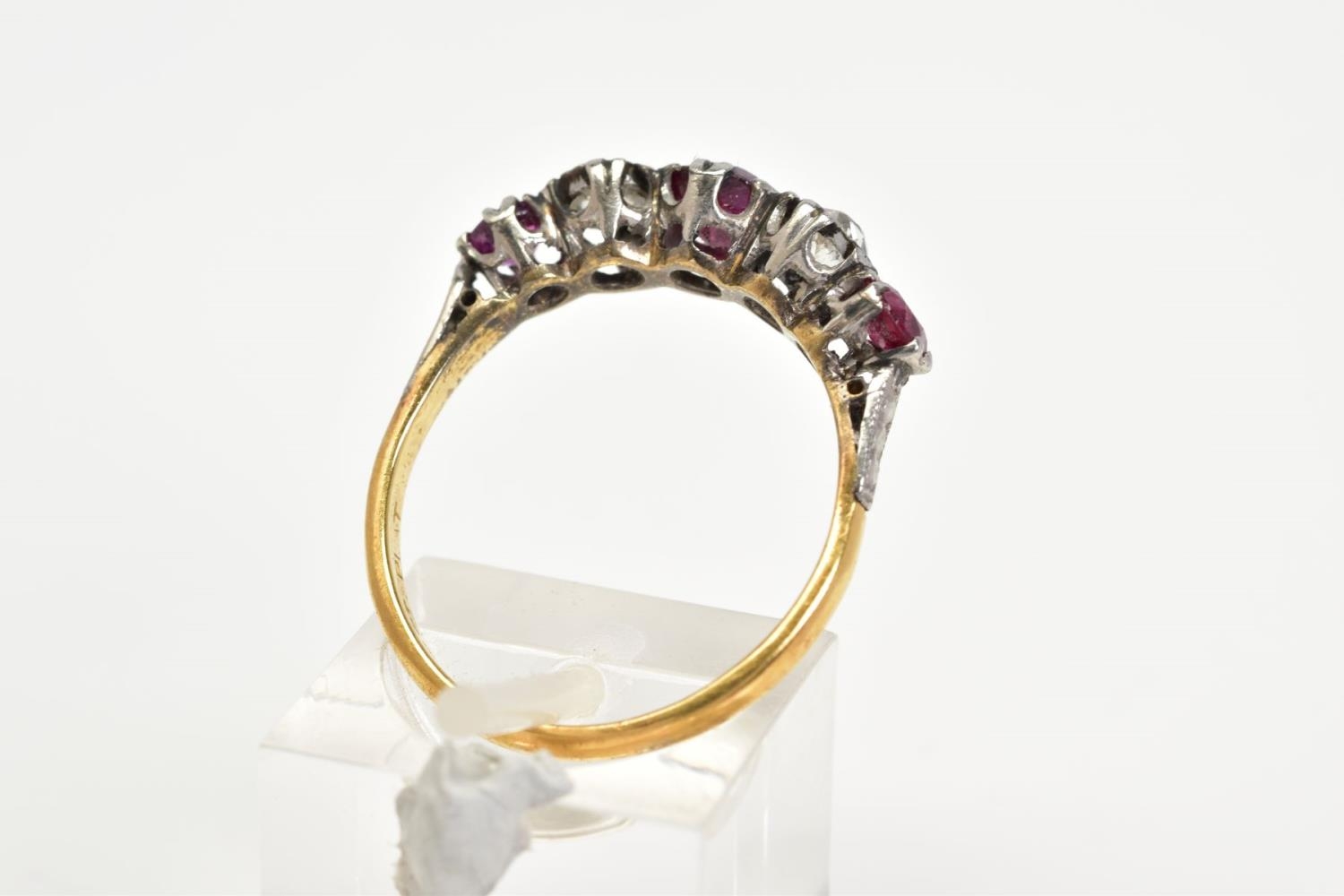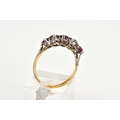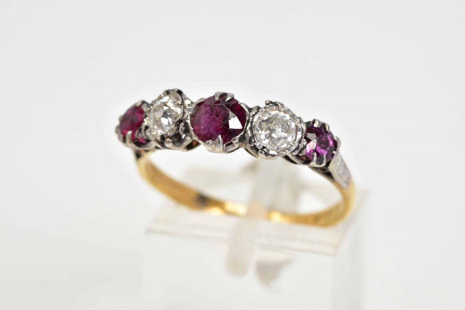 A YELLOW METAL RUBY AND DIAMOND FIVE STONE RING, designed with three circular cut rubies, interspaced with two old cut diamonds, total estimated diamond weight 0.50ct, stamped 18ct plat, ring size Q 1/2, approximate gross weight 3.6 grams