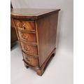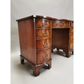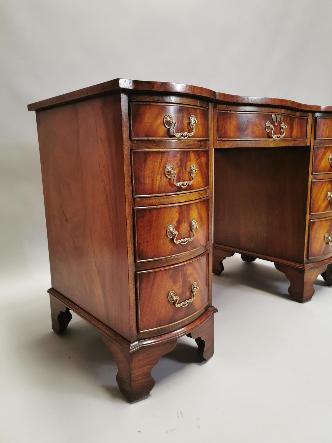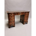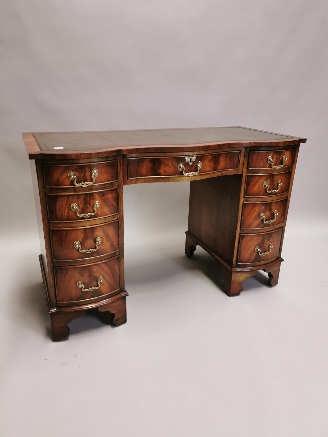 Edwardian mahogany writing desk, with inset tooled leather top above a centre drawer flanked by eight short drawers , raised on bracket feet { 76cm H X 115cm W X 53cm D }.