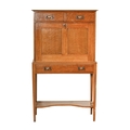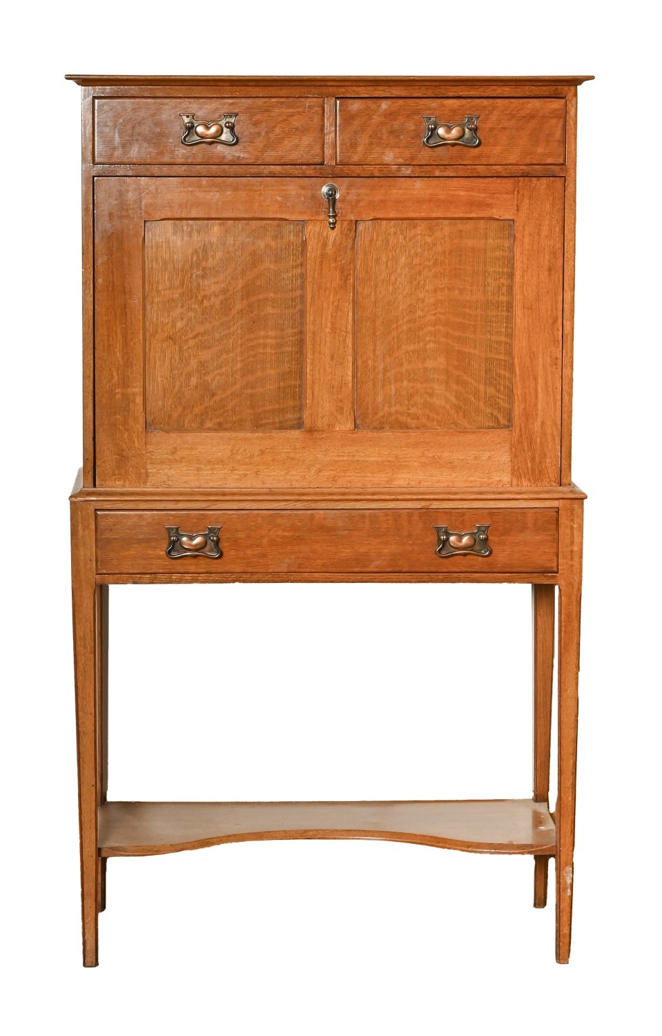 An Arts and Crafts oak secretaire, with fall front, on square tapering legs with undertier, 137cm h; 78 x 29cm