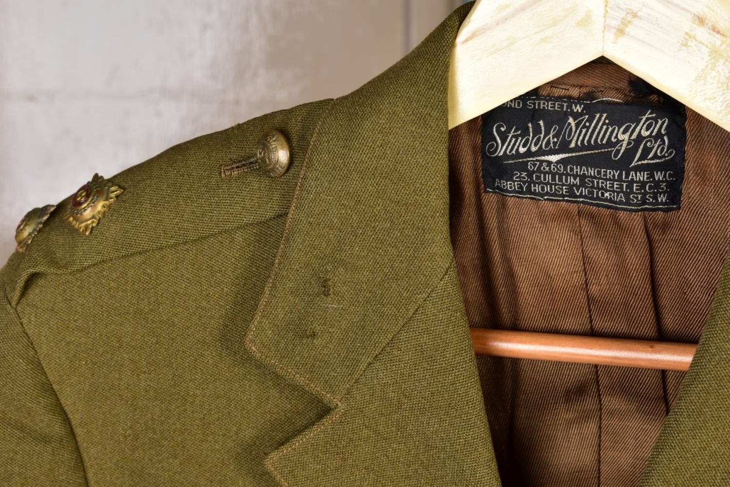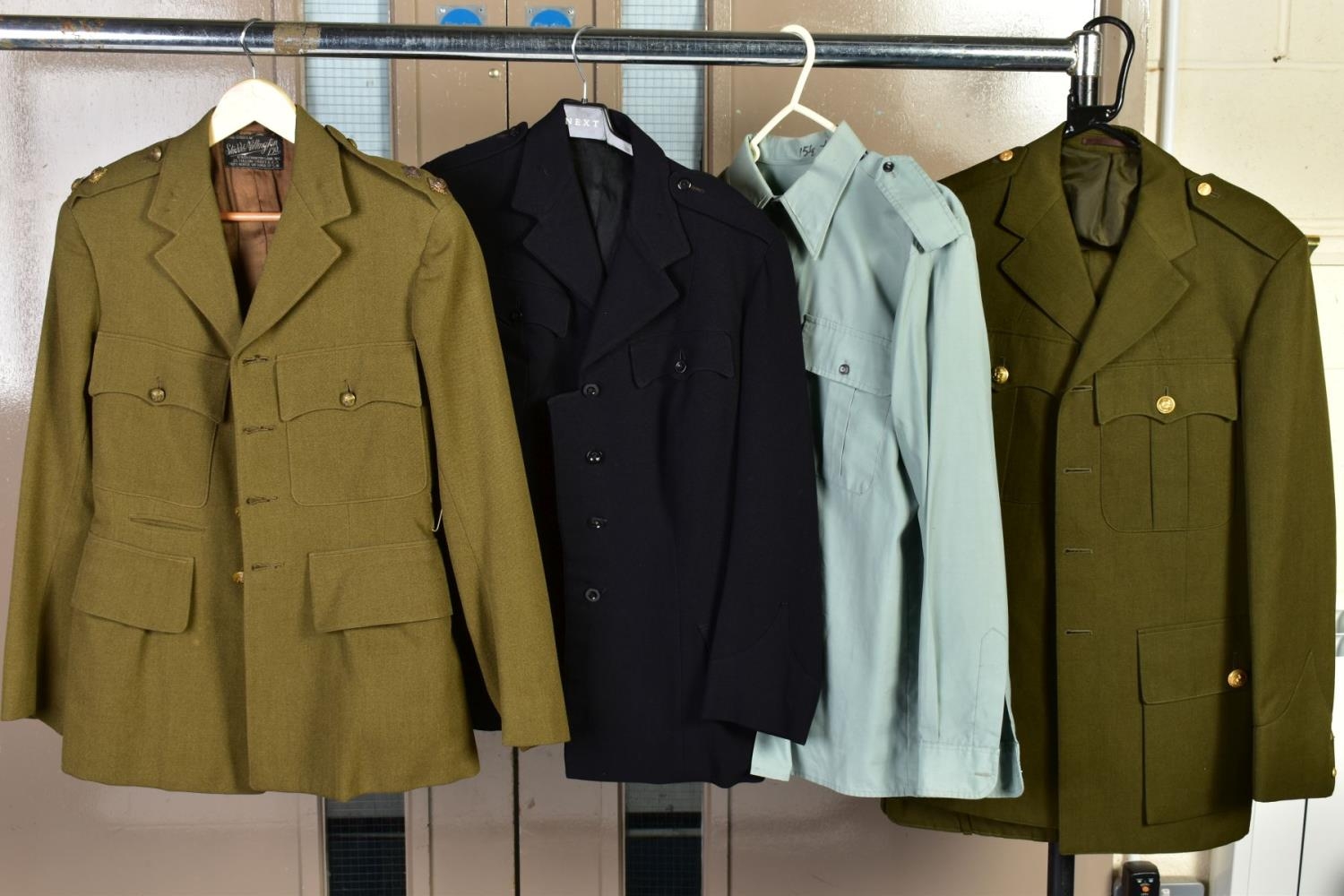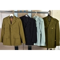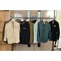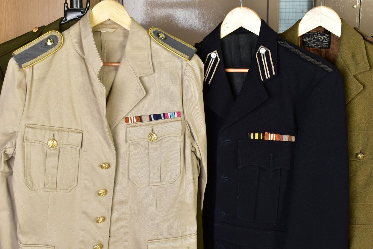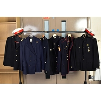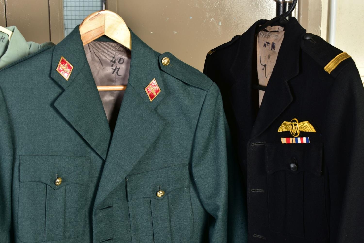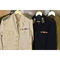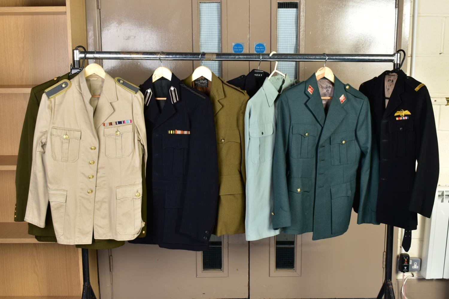 SEVEN MILITARY JACKETS, an Officers jacket with Royal Engineers buttons, etc, a black Dress jacket possibly St. John Ambulance, an Army style jacket and trousers, no labels and a cross mixture of buttons, a Dress jacket with ribbon bar and ATA wings badge (Air Transport Auxilliary), a Spanish made green uniform jacket shirt and trousers, but with Italian metal fascist insignia to collars, a black Dress jacket, no markings, a German lightweight sand coloured jacket with ribbon bar by Bucking Alsfeld
