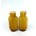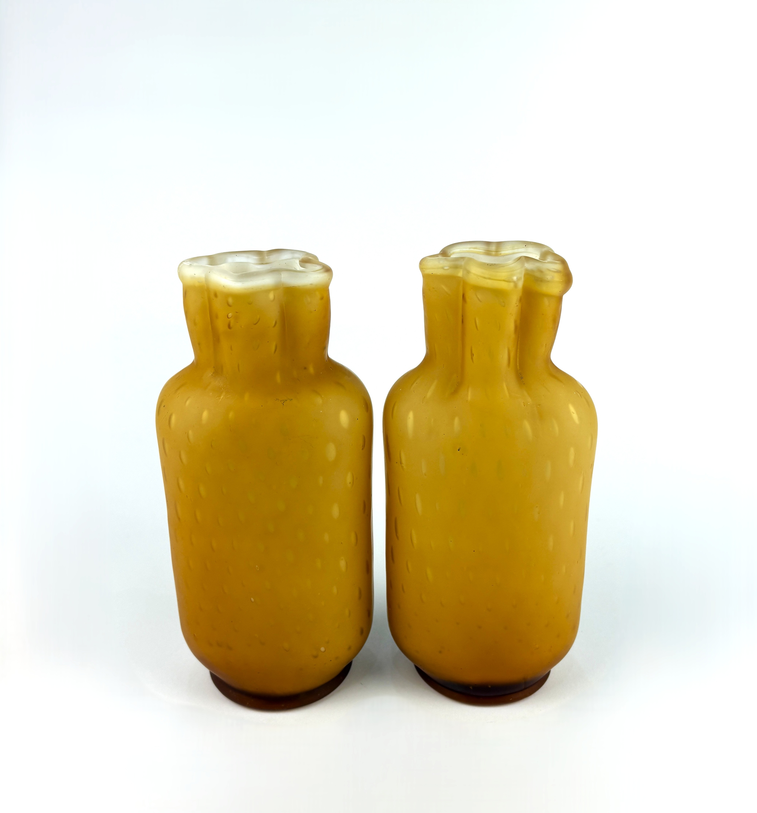 A pair of late 19th century golden yellow glass air trap vases of compressed shouldered ovoid form with pleated neck with air trap bubbles over a white interior, height 18cm