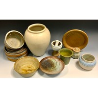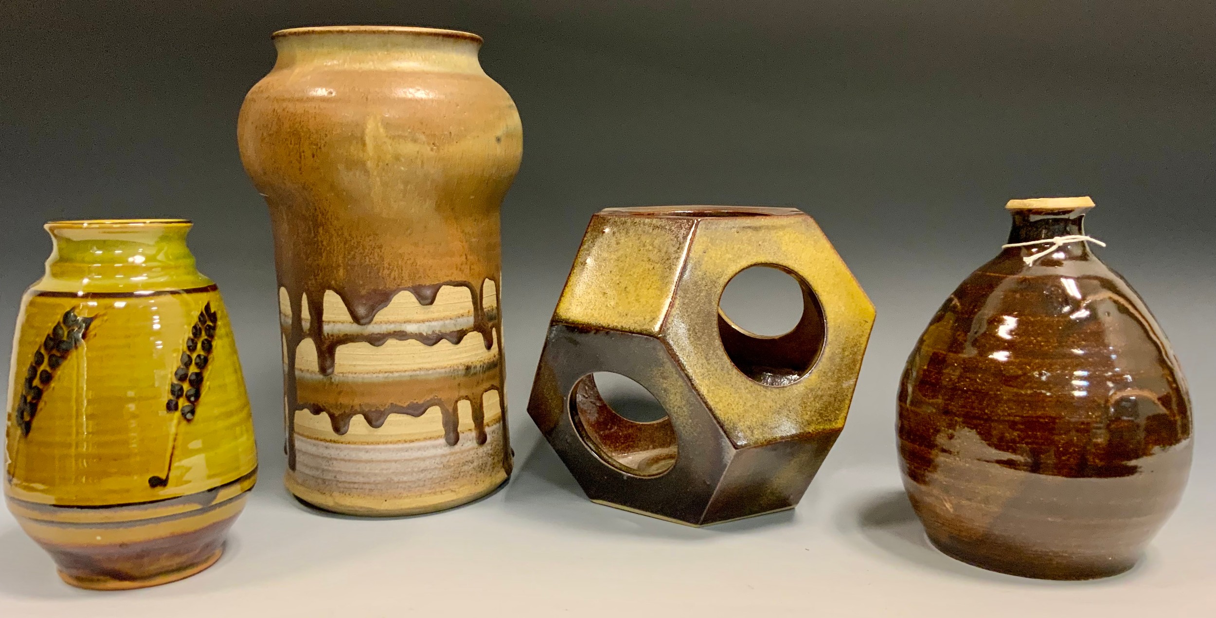 Studio Pottery - Chris Harris for Coldstone pottery stoneware vase, 17cm tall; tenmoku glaze stoneware bottle vase, potter's mark HP to base, 17cm tall; Jill Wilkinson, geometric form lantern; stoneware 'onion' vase.