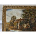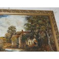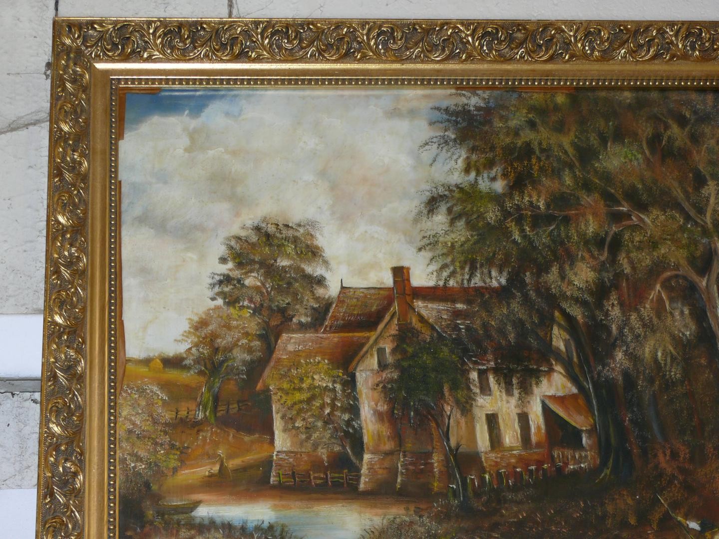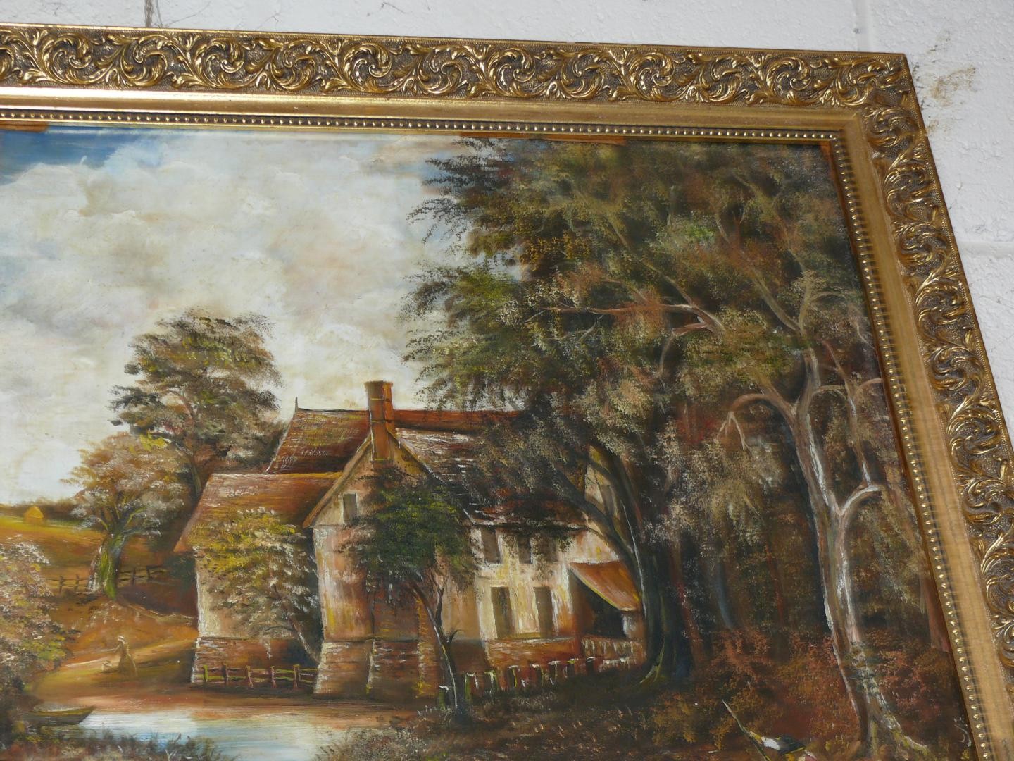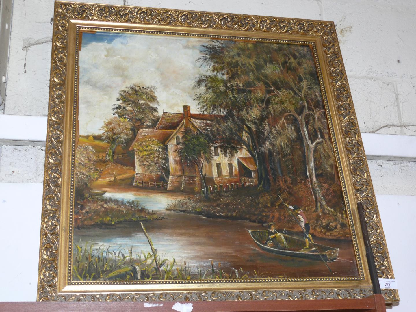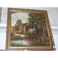 Large oil painting on board of a mill house scene with boat & figures. Ornate gilt frame. 75cm x 70cm