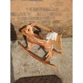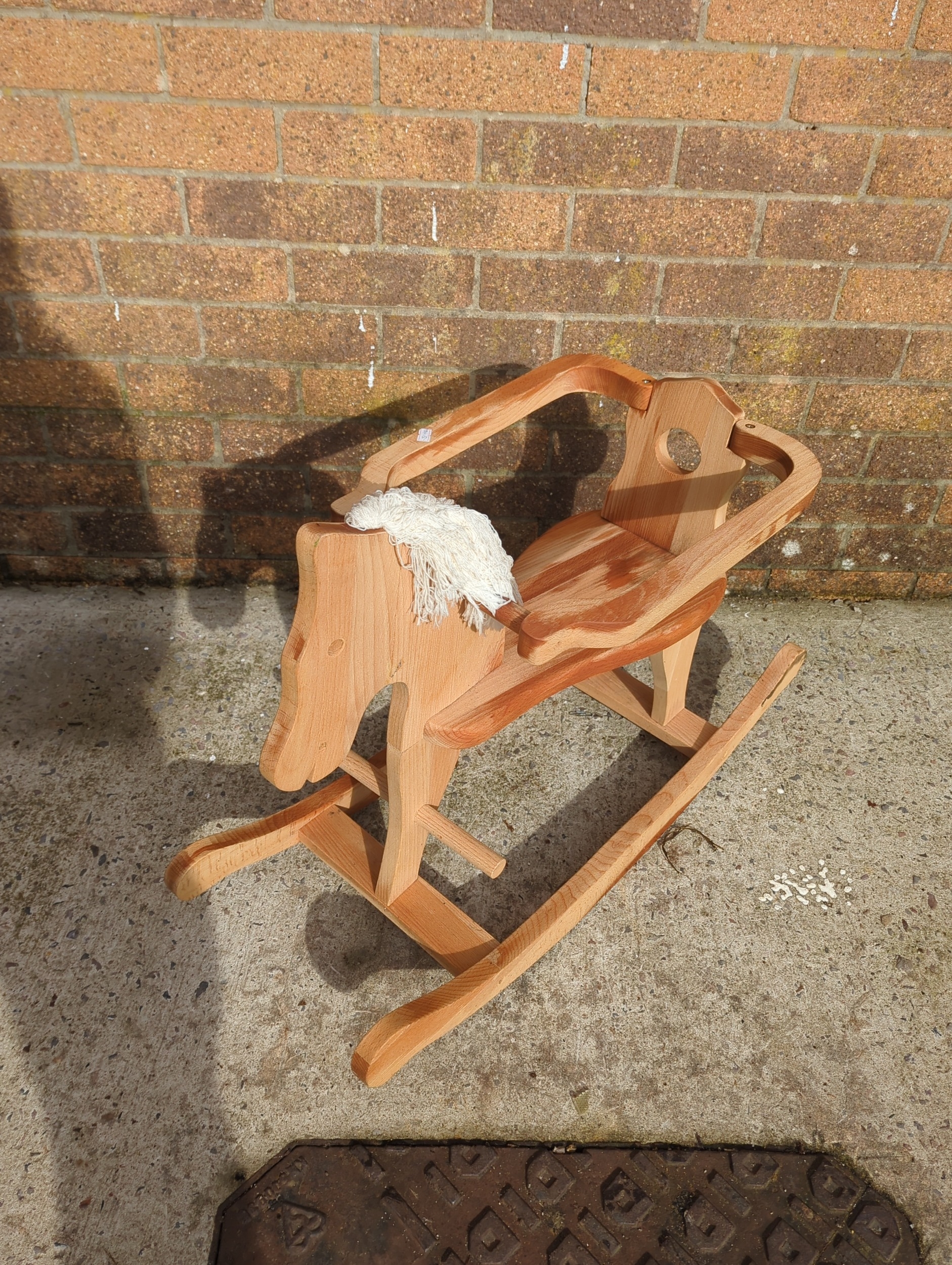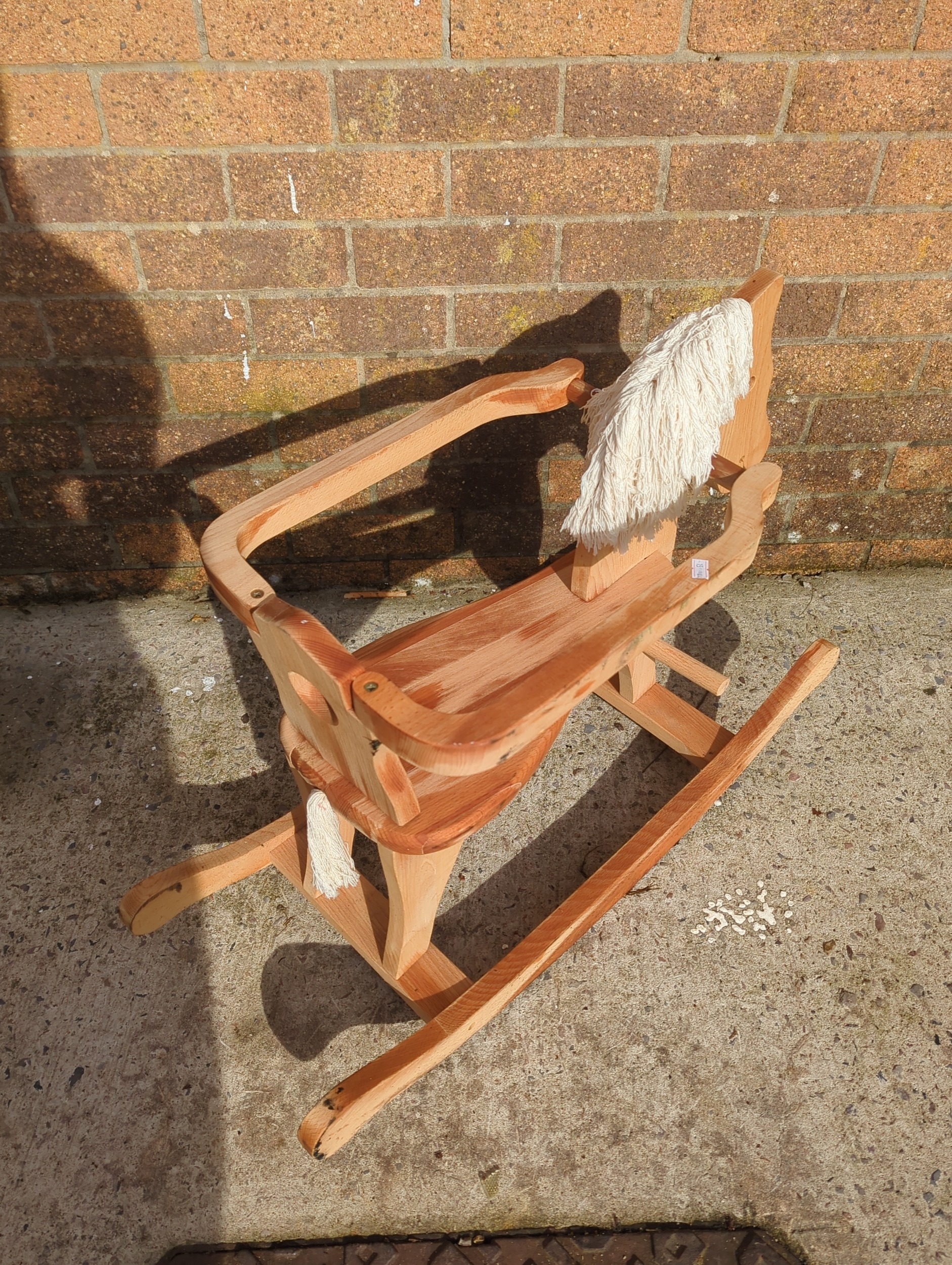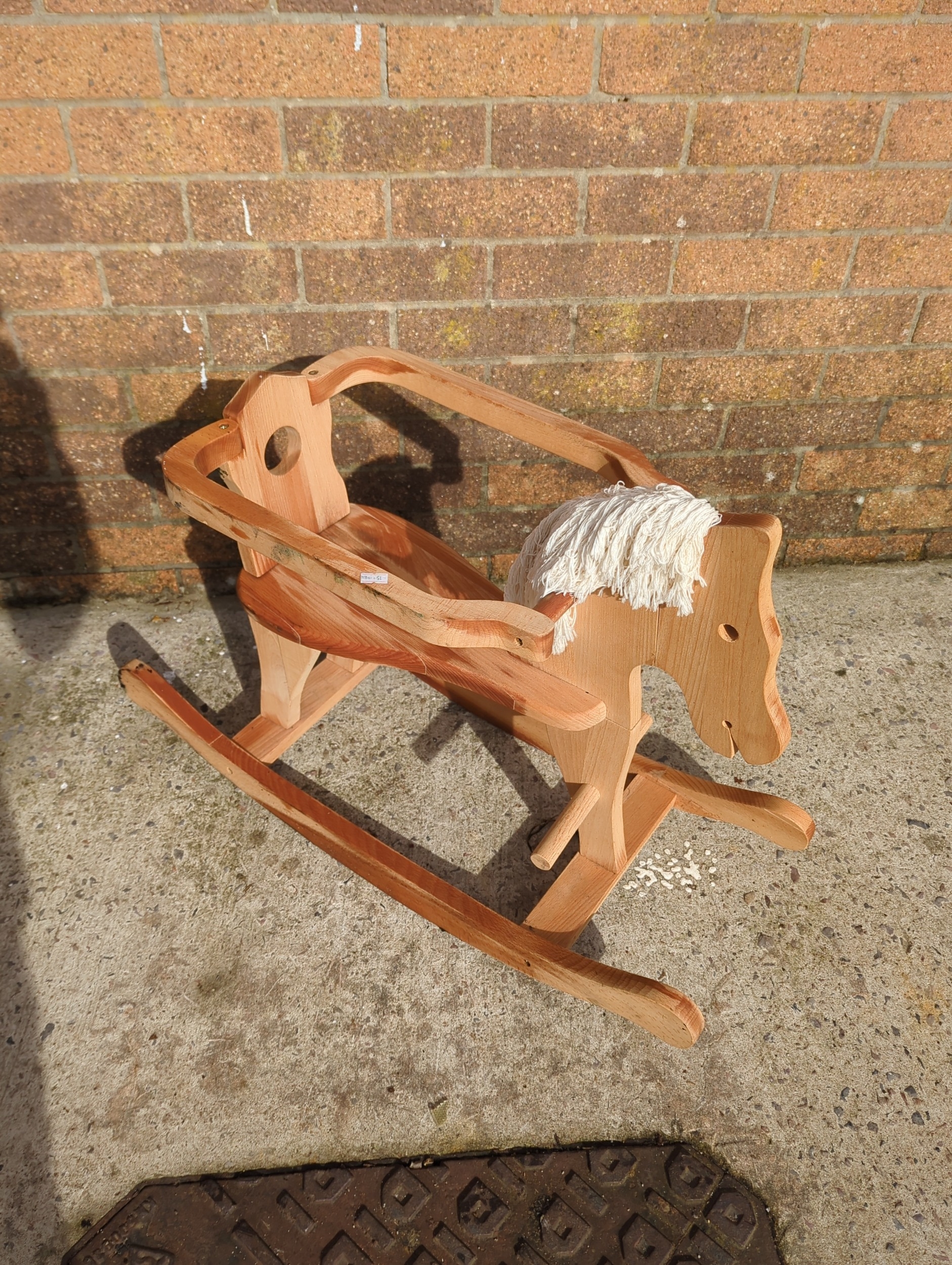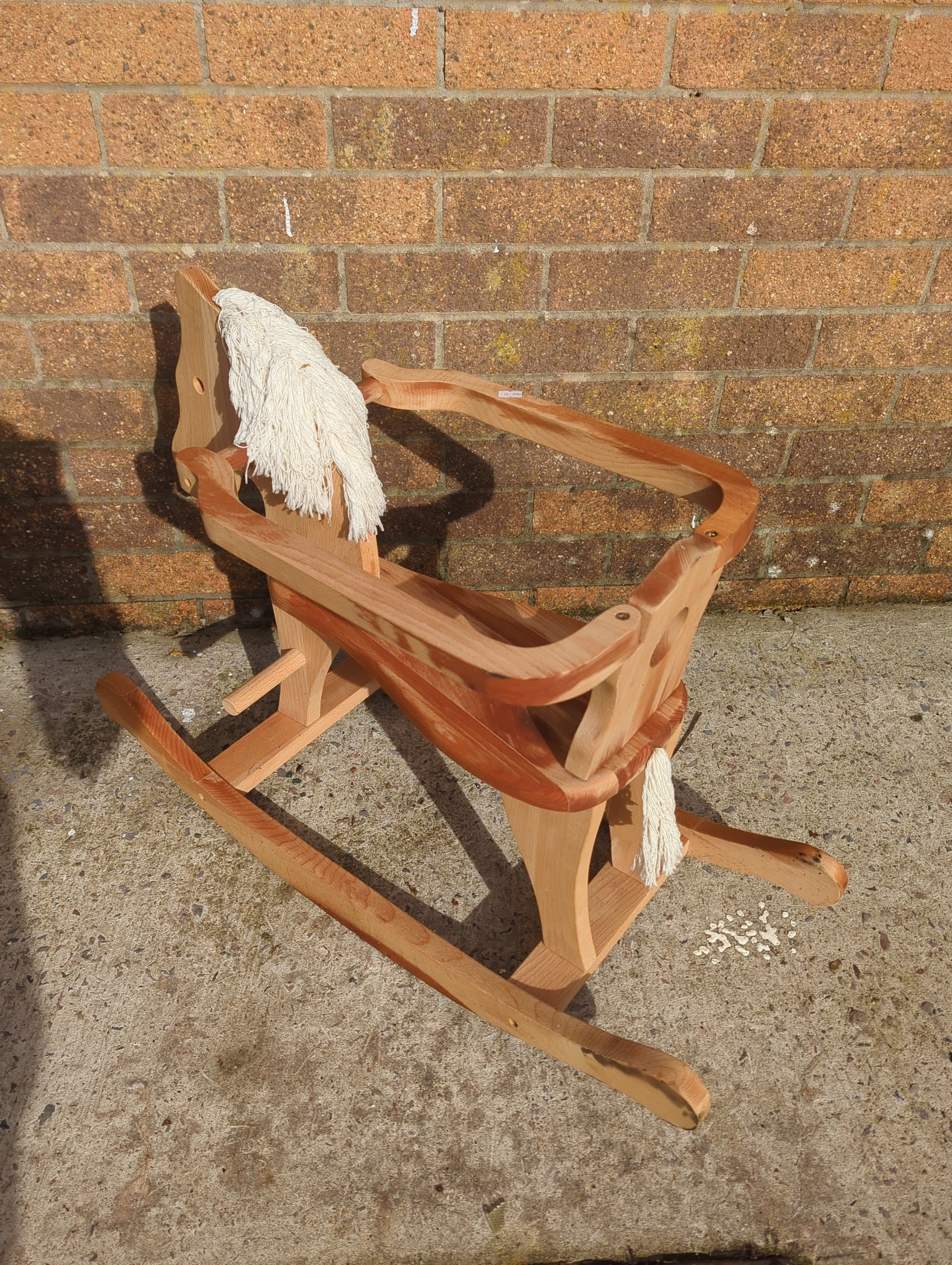 A charming wooden rocking horse featuring a natural wood finish and a playful design. The horse has a rope mane for added texture and character. Suitable for small children, this classic piece makes for an engaging playtime accessory.