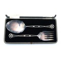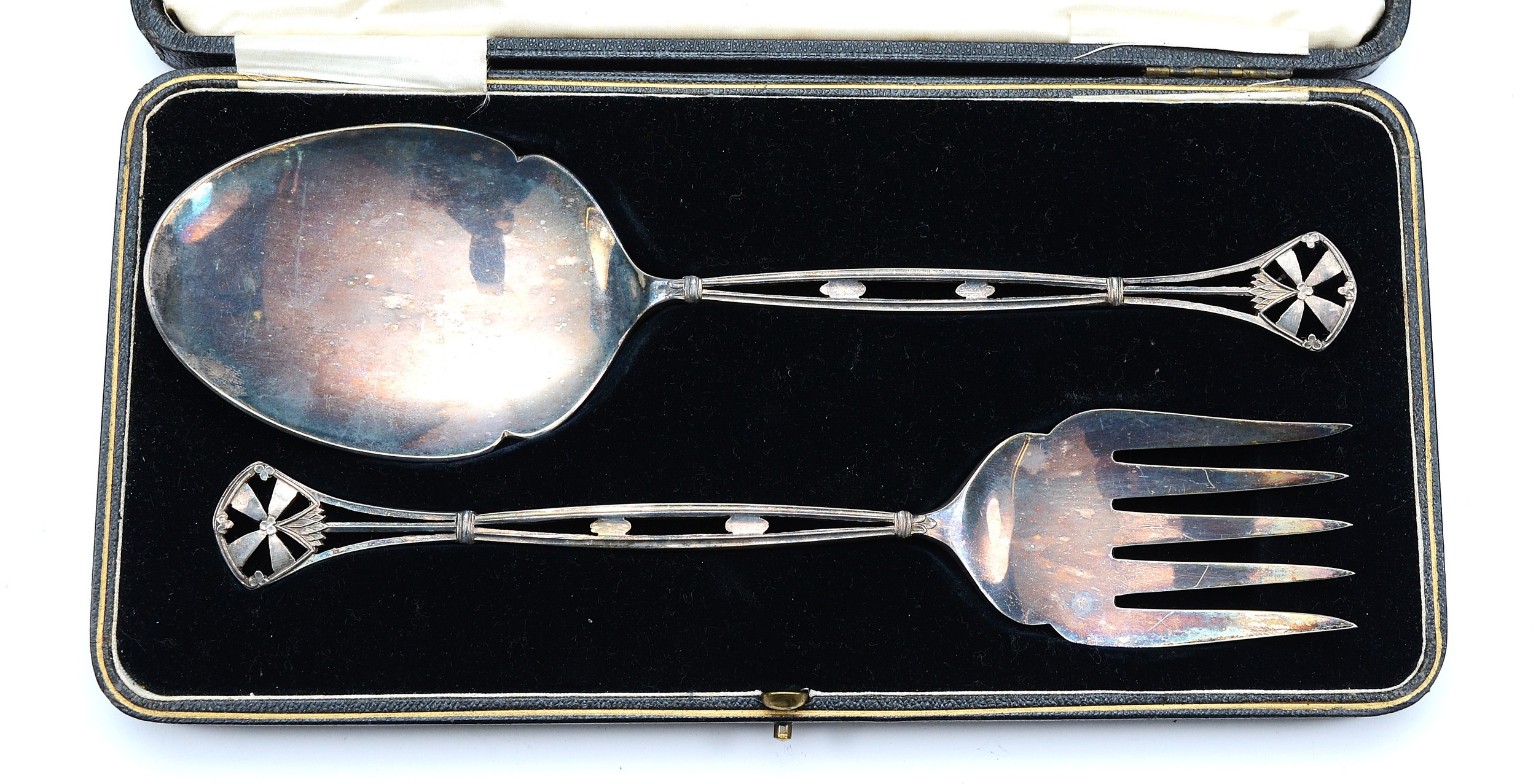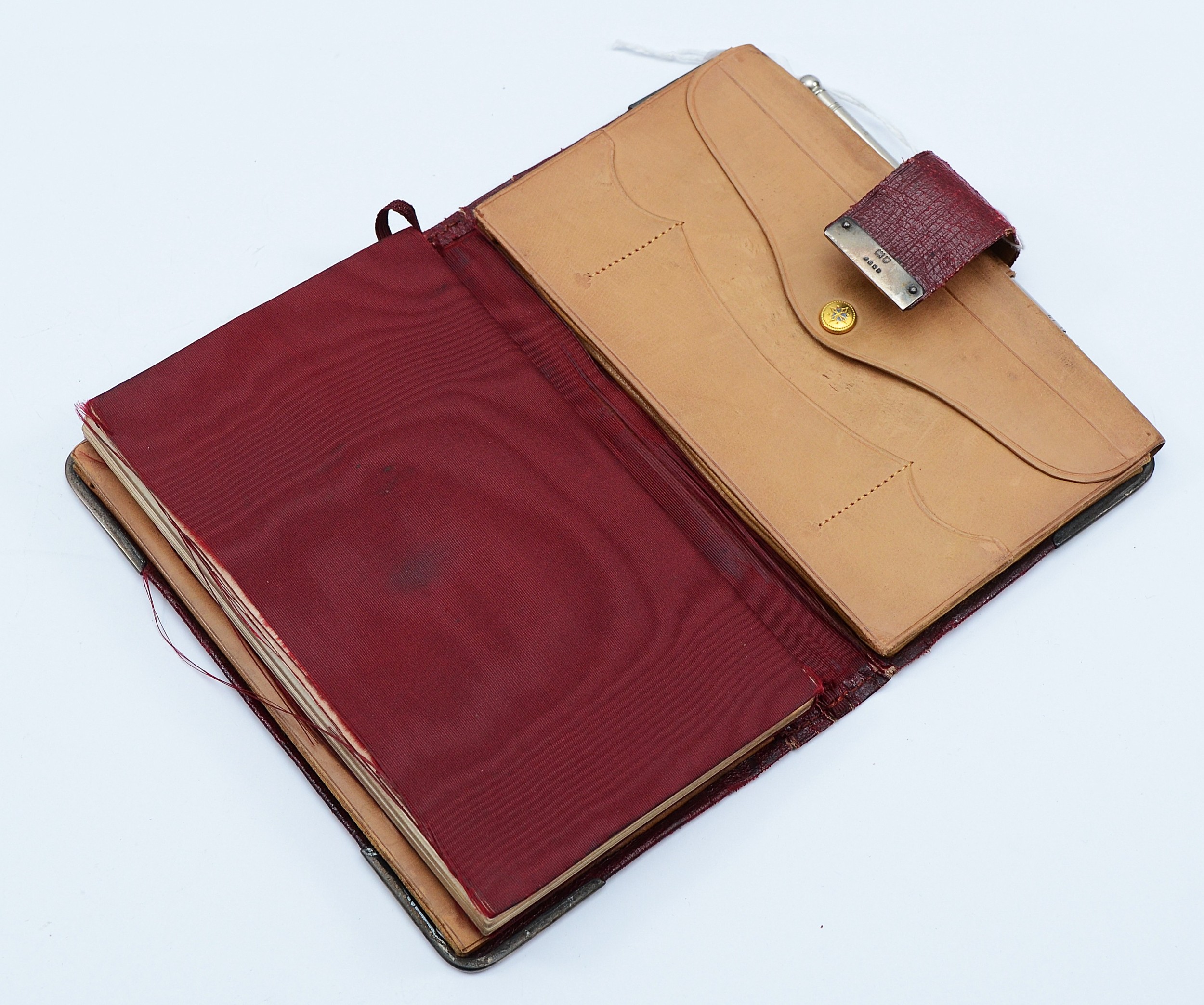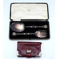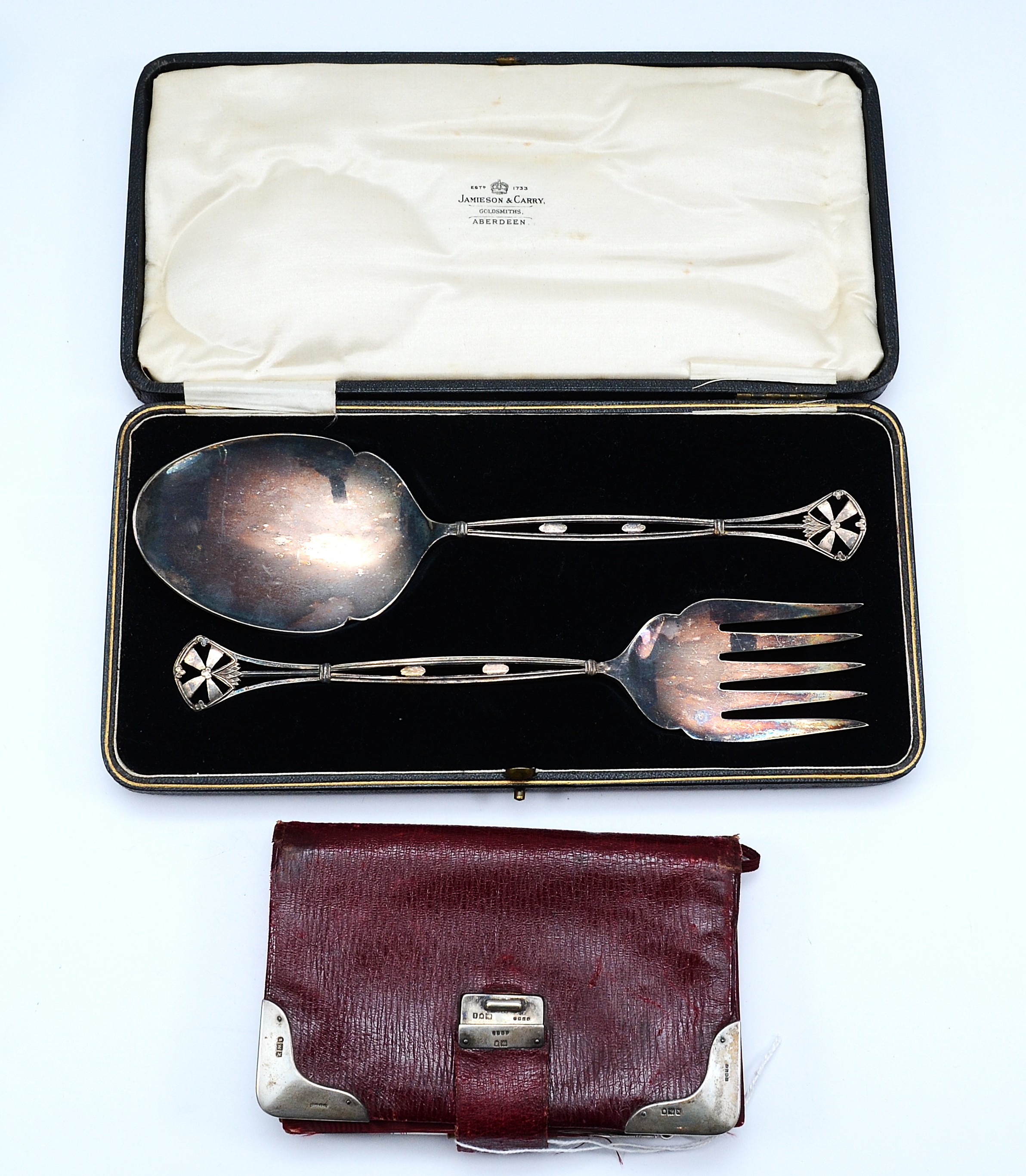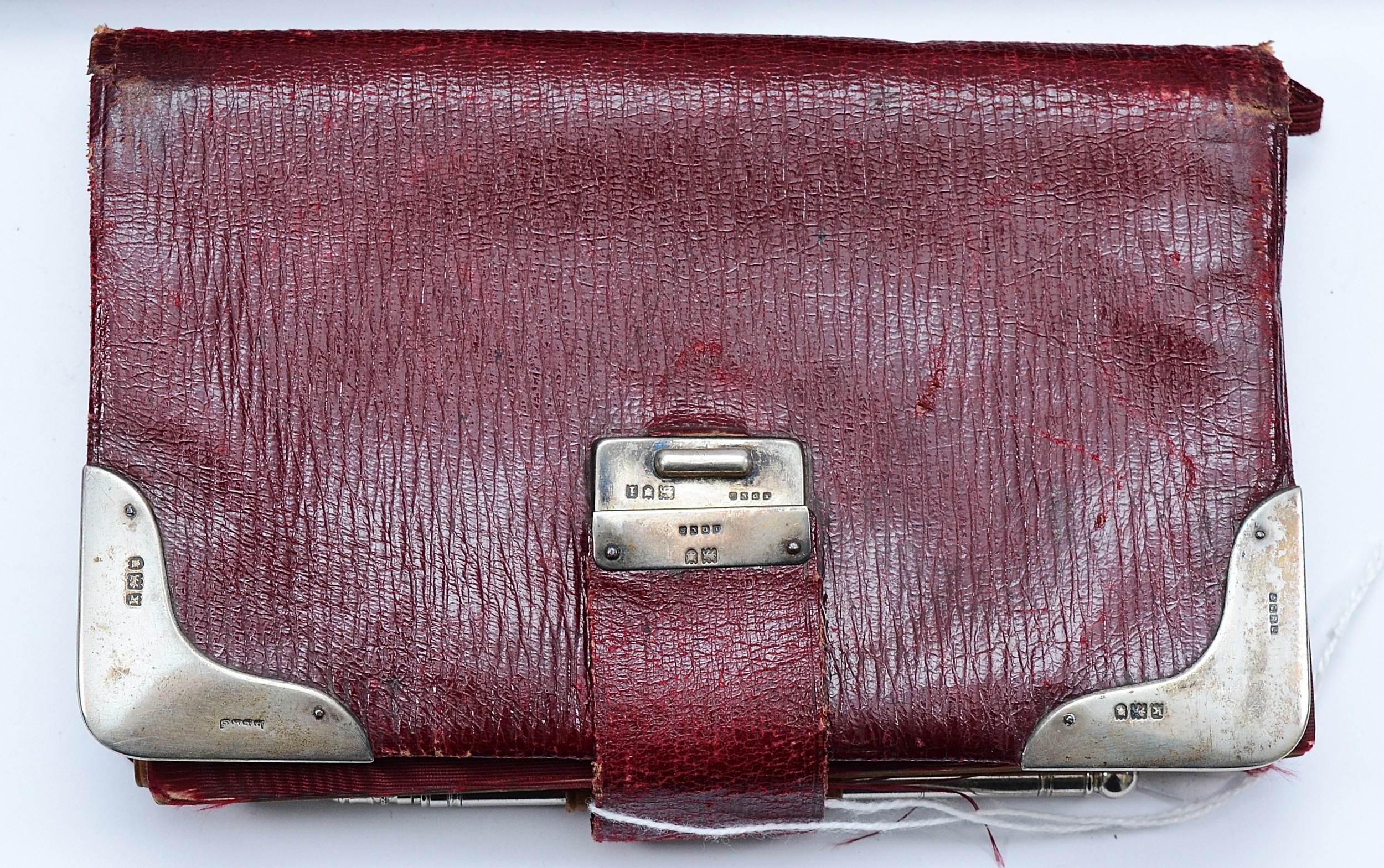 A leather bound note book, having a silver fastening clasp, London 1904, and corners, London 1905, 15x10cm, together with a silverplate serving spoon and fork, both having pierced handles, cased.