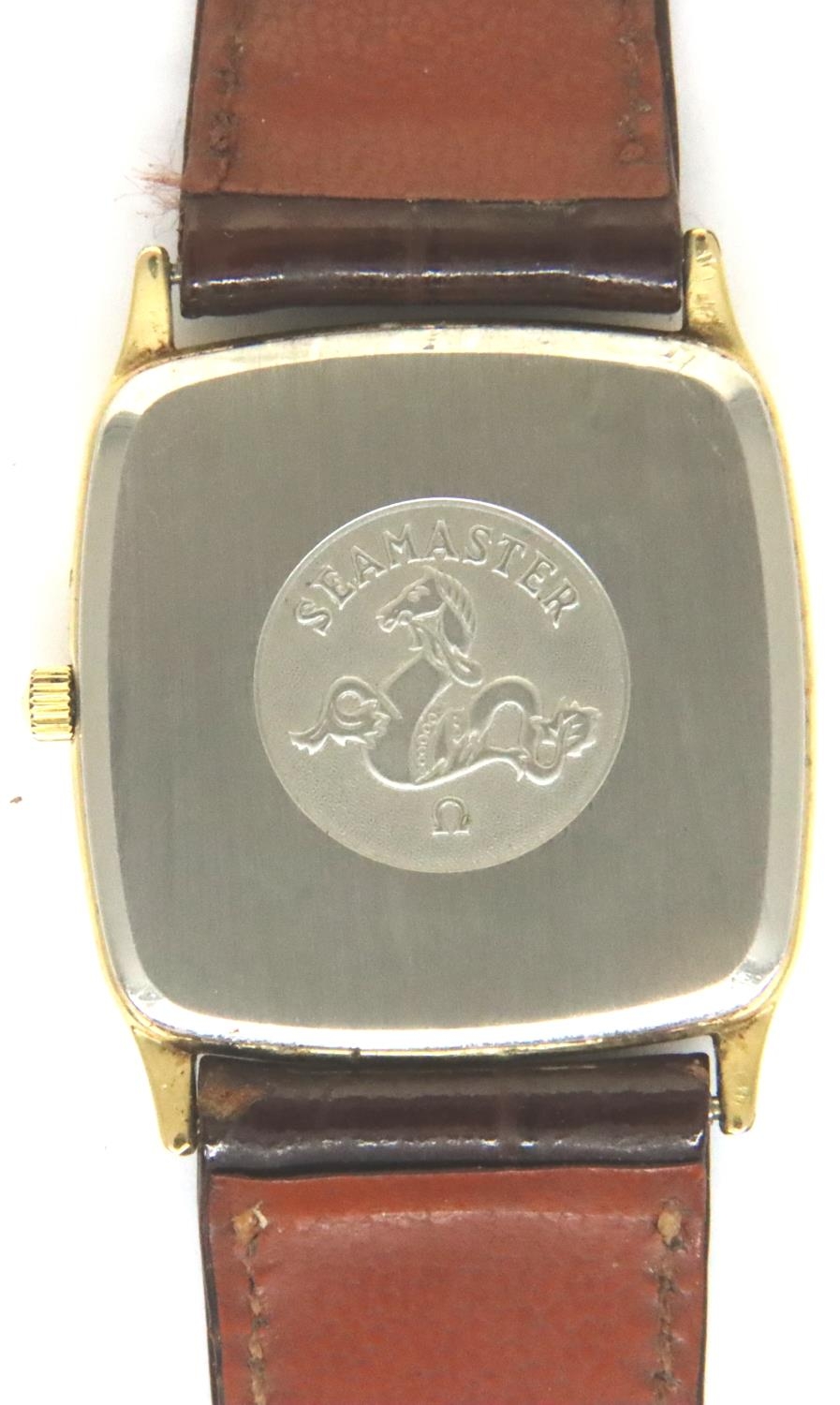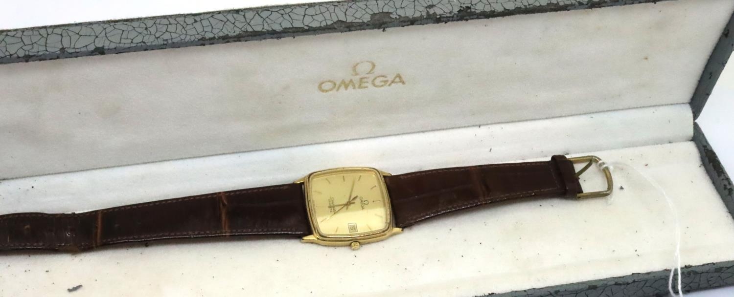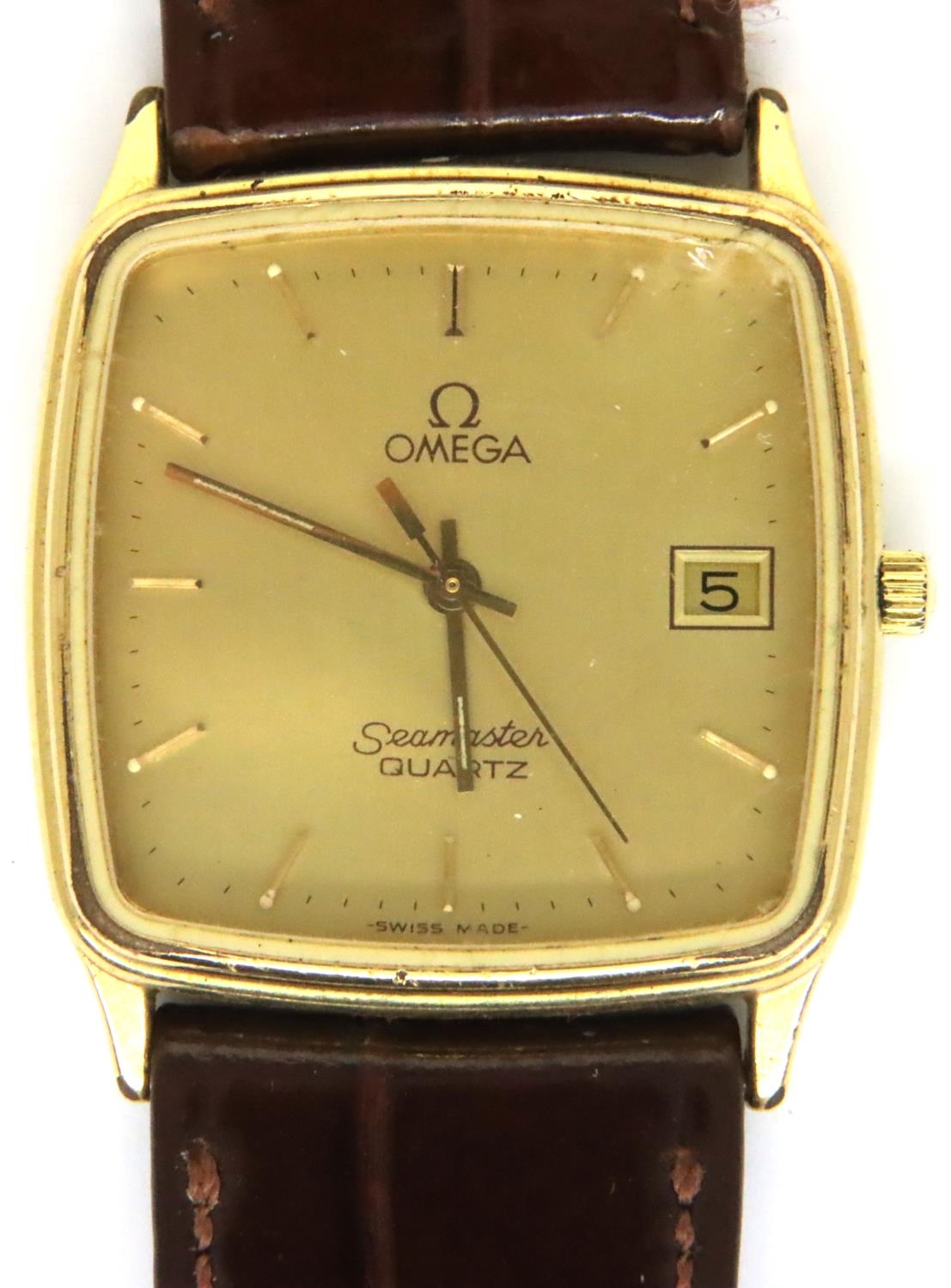 Omega; Seamaster quartz gents wristwatch on a brown leather strap, boxed, not working, wear to leather strap, scratch to corner of glass. P&P Group 1 (£14+VAT for the first lot and £1+VAT for subsequent lots)