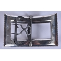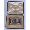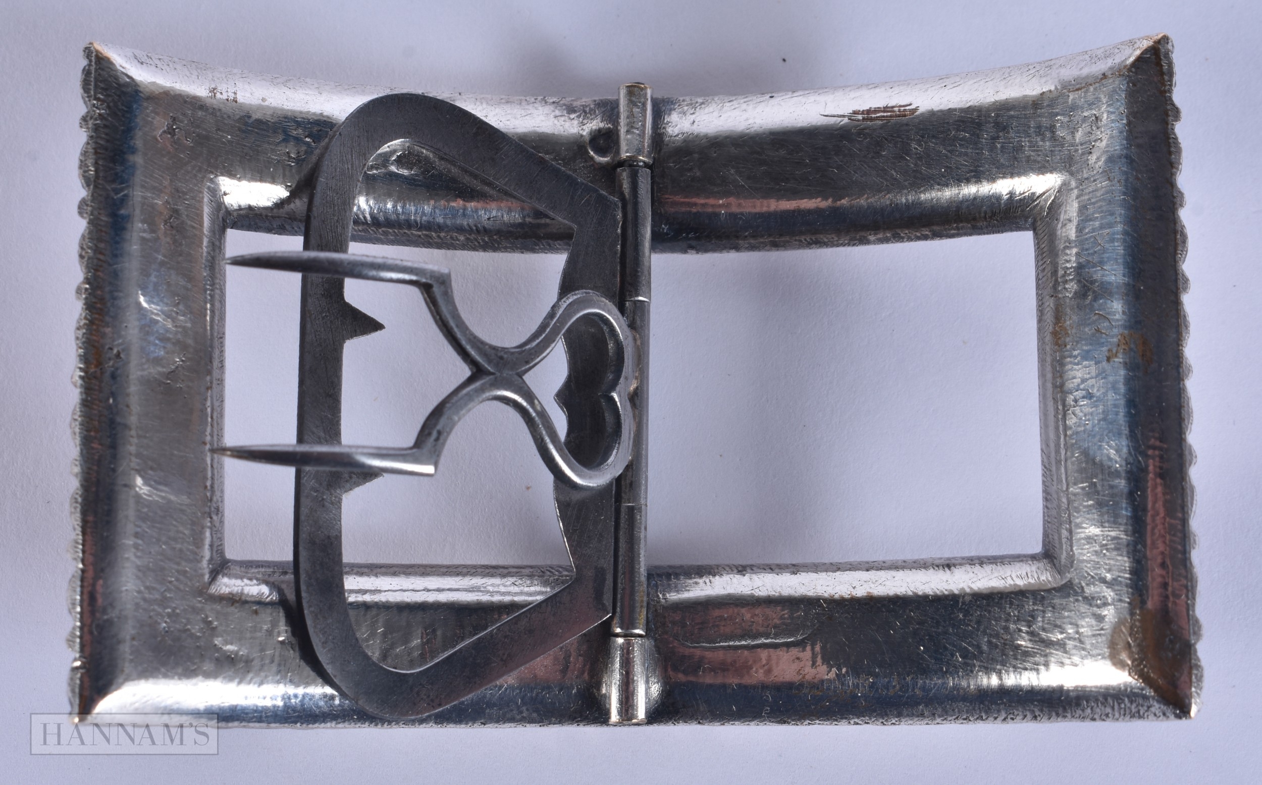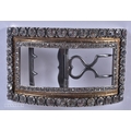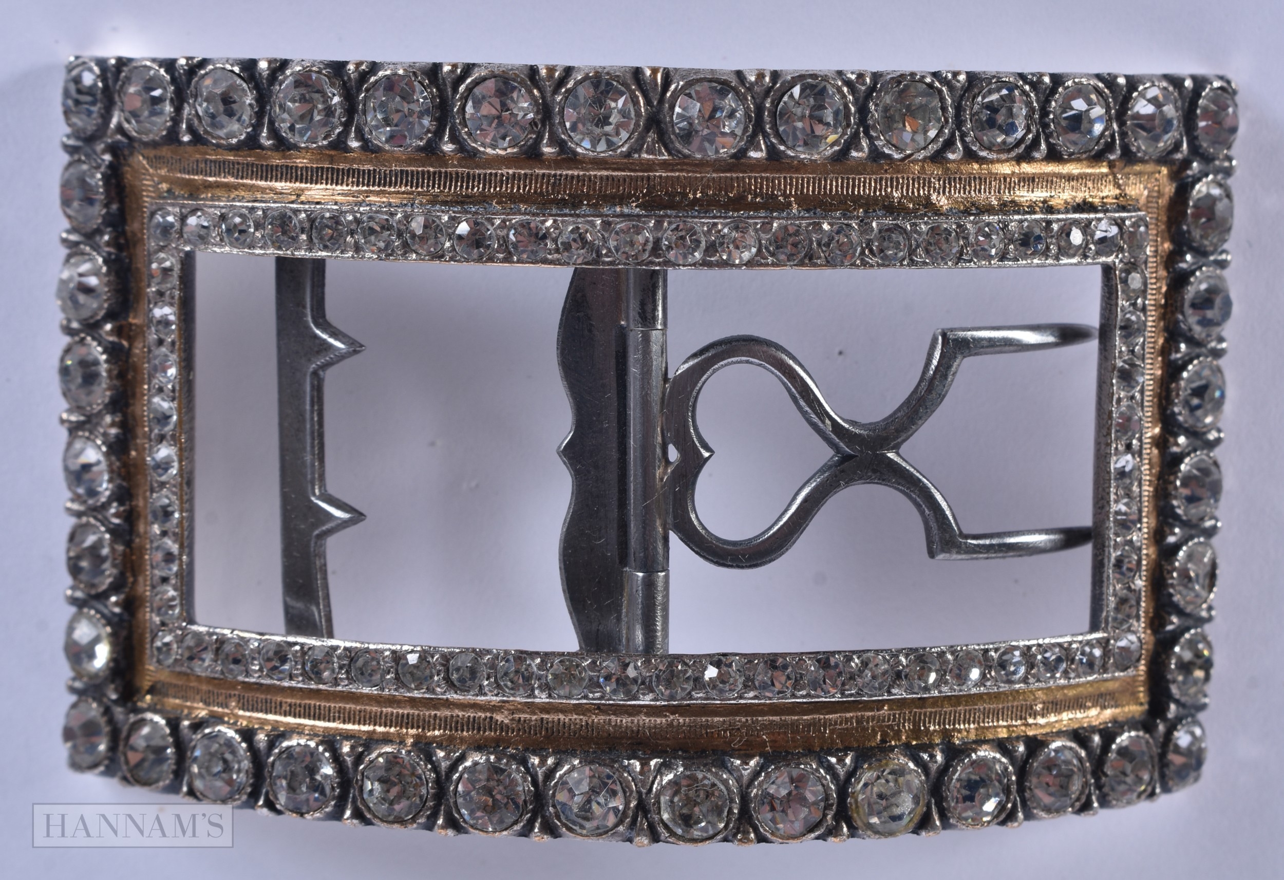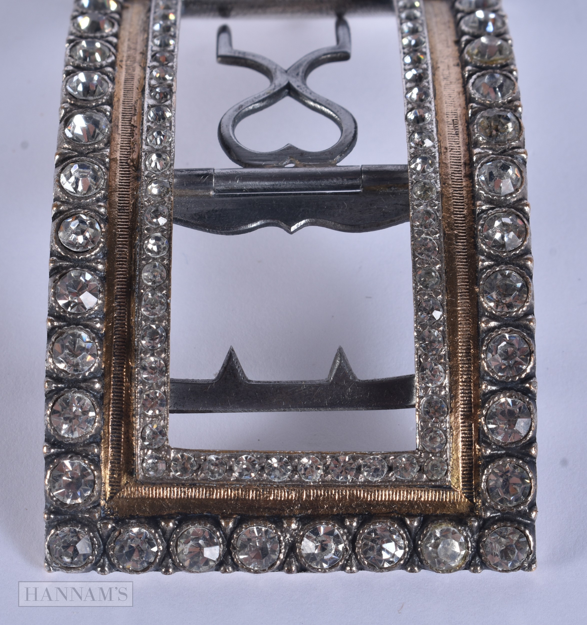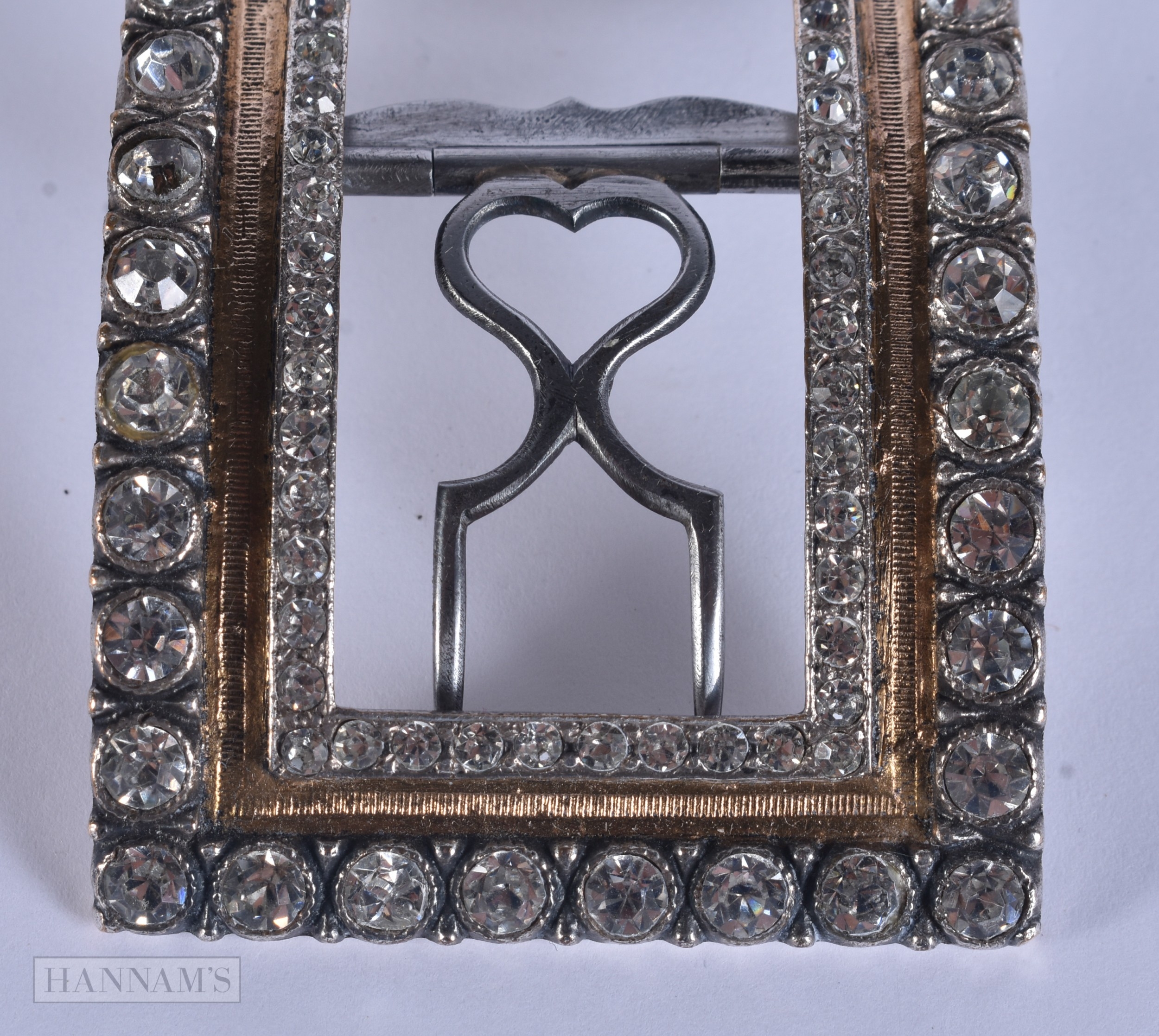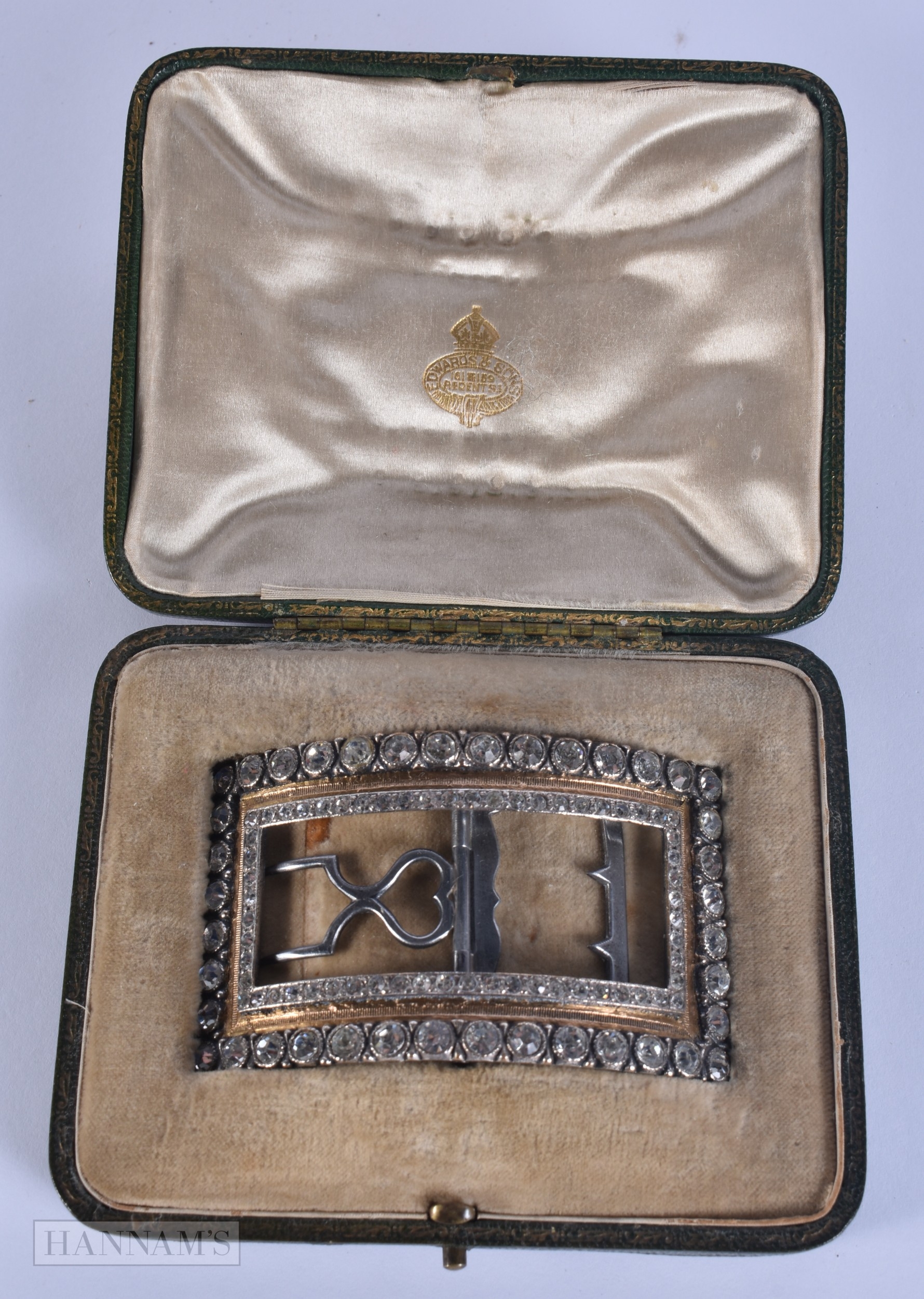 A LOVELY EARLY 19TH CENTURY PASTE SET BELT BUCKLE within fitted leather case. 8.5 cm x 5.25 cm.