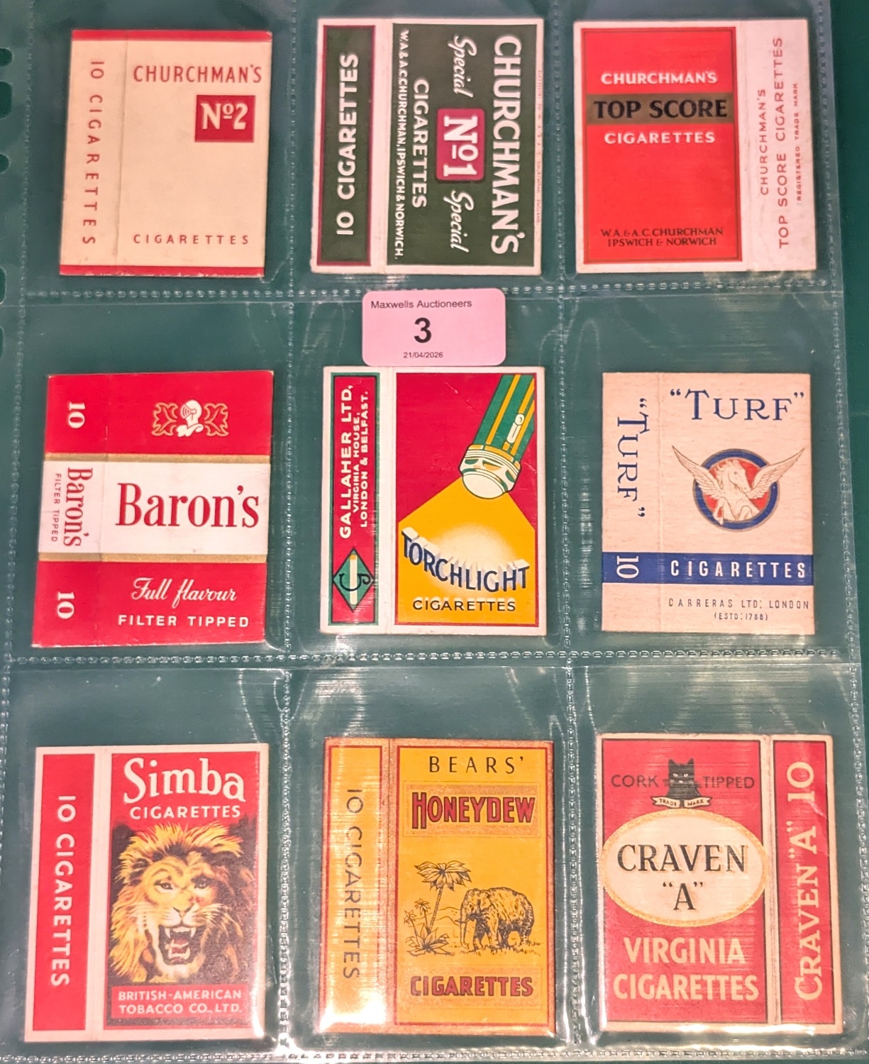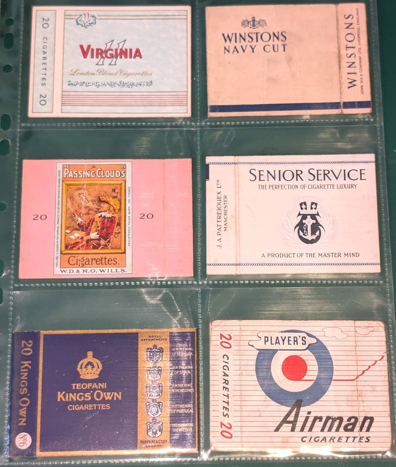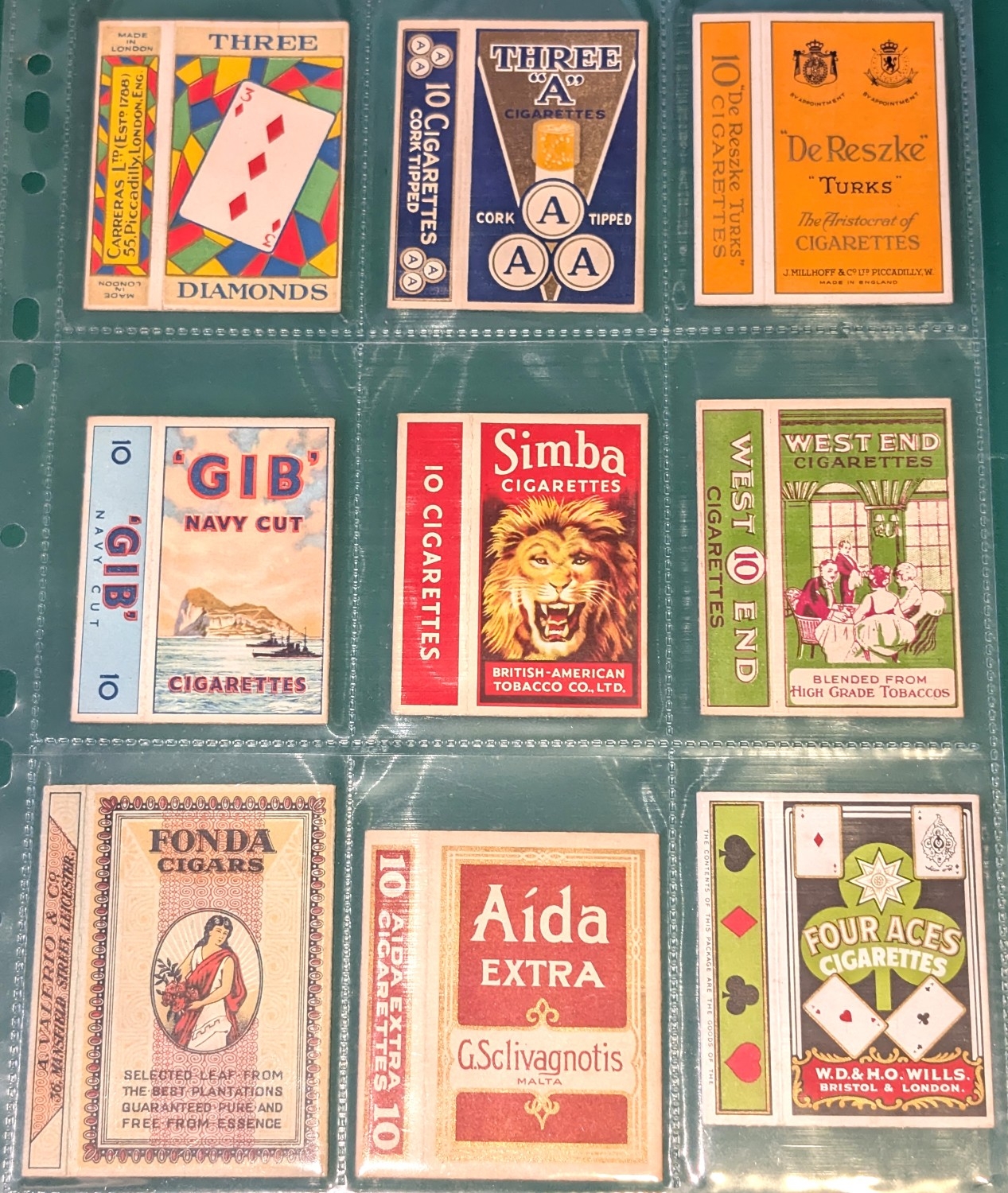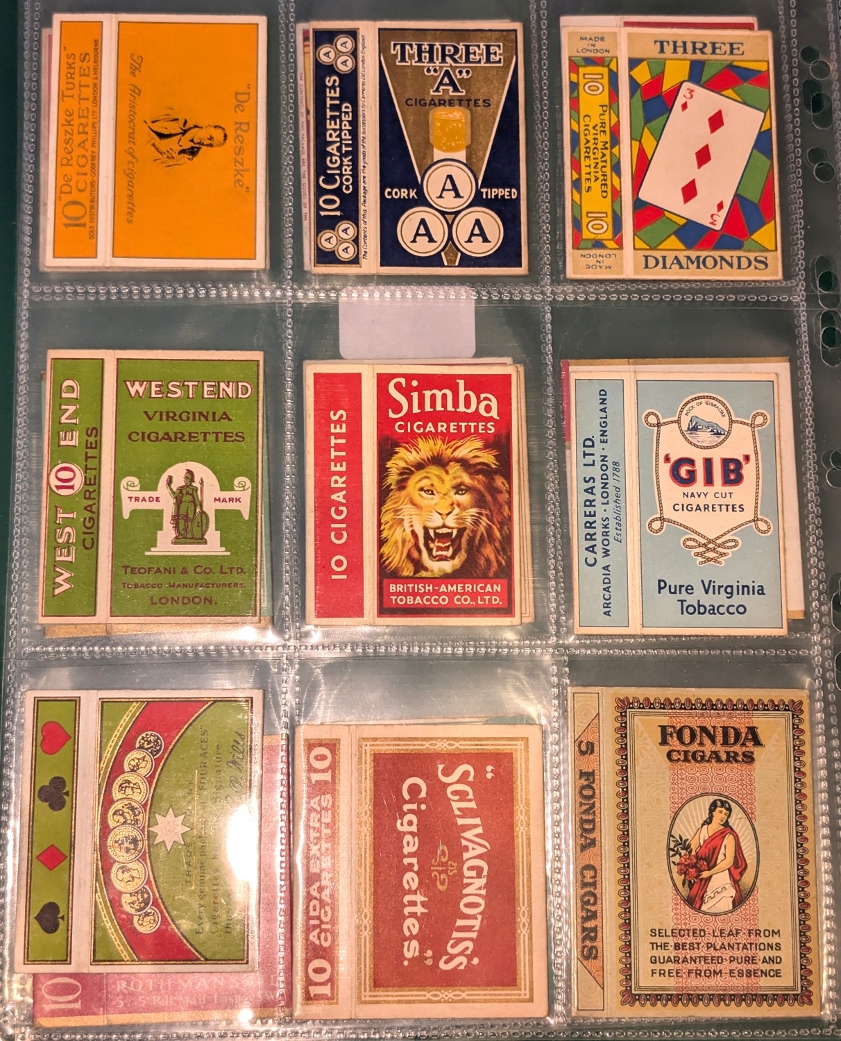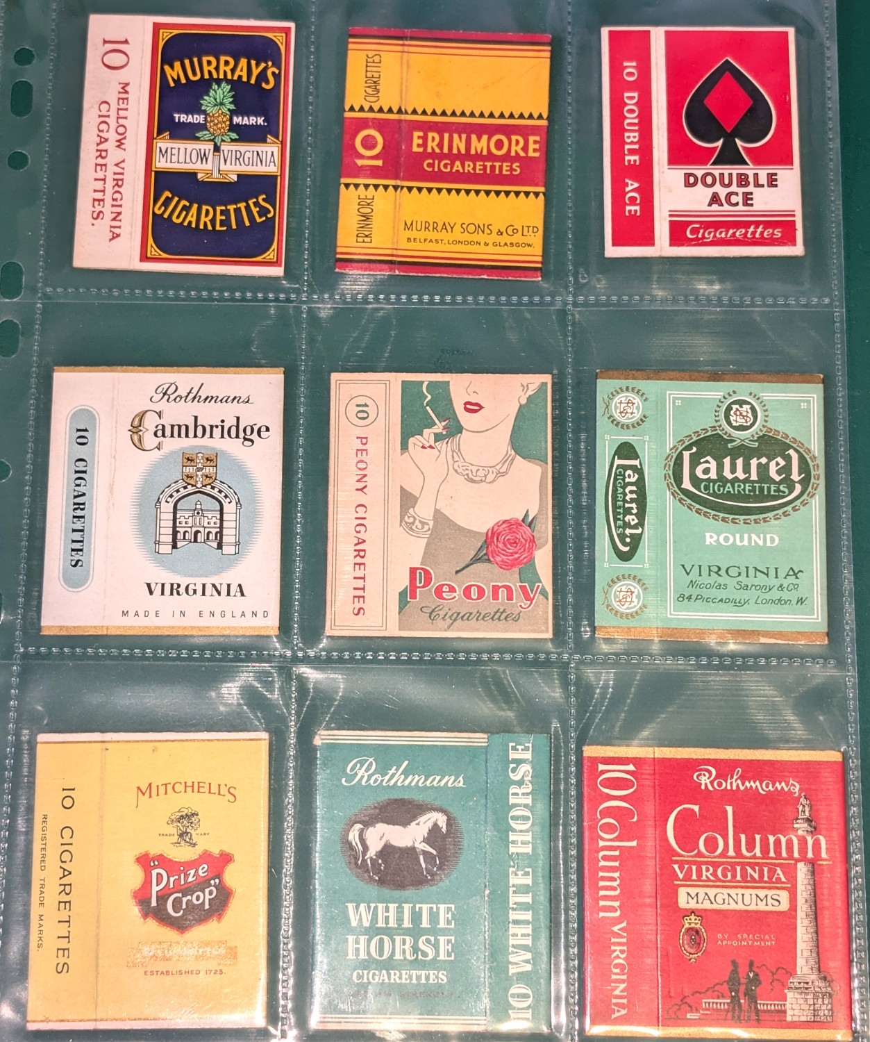 Cigarette packet hulls of mainly British/advertising interest, to include:- Churchman's No. 1, No. 2 and Top Score, Baron's, Torchlight, "Turf", Simba, Bears' Honeydew, Craven "A", Murray's, Erinmore, Double Ace, Rothmans Cambridge Virginia, Peony, Laurel, "Prize Crop", Rothmans White Horse and Column Virginia Magnums, Three Diamonds, Three "A", De Reszke", 'Gib' Navy Cut, Simba, West End, Fonda, Aida, Four Aces, Virginia 11, Winstons Navy Cut, "Passing Clouds", Senior Service, Teofani King's Own, Player's Airman, mainly excellent condition (33).