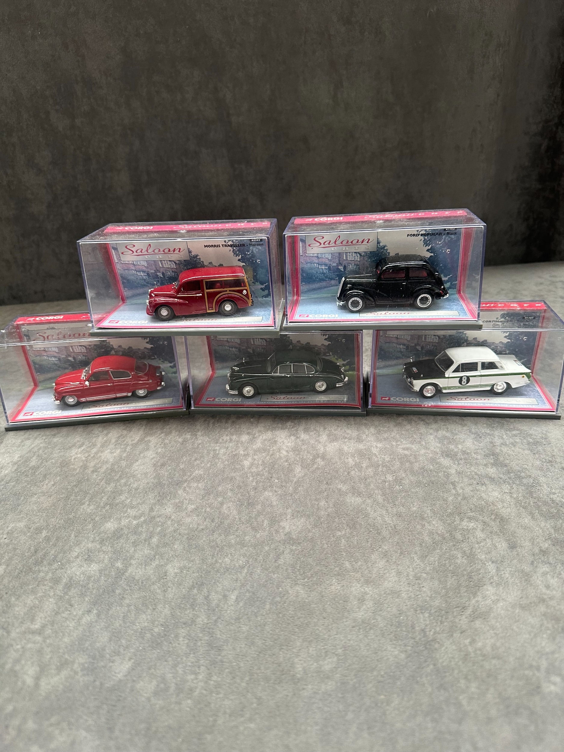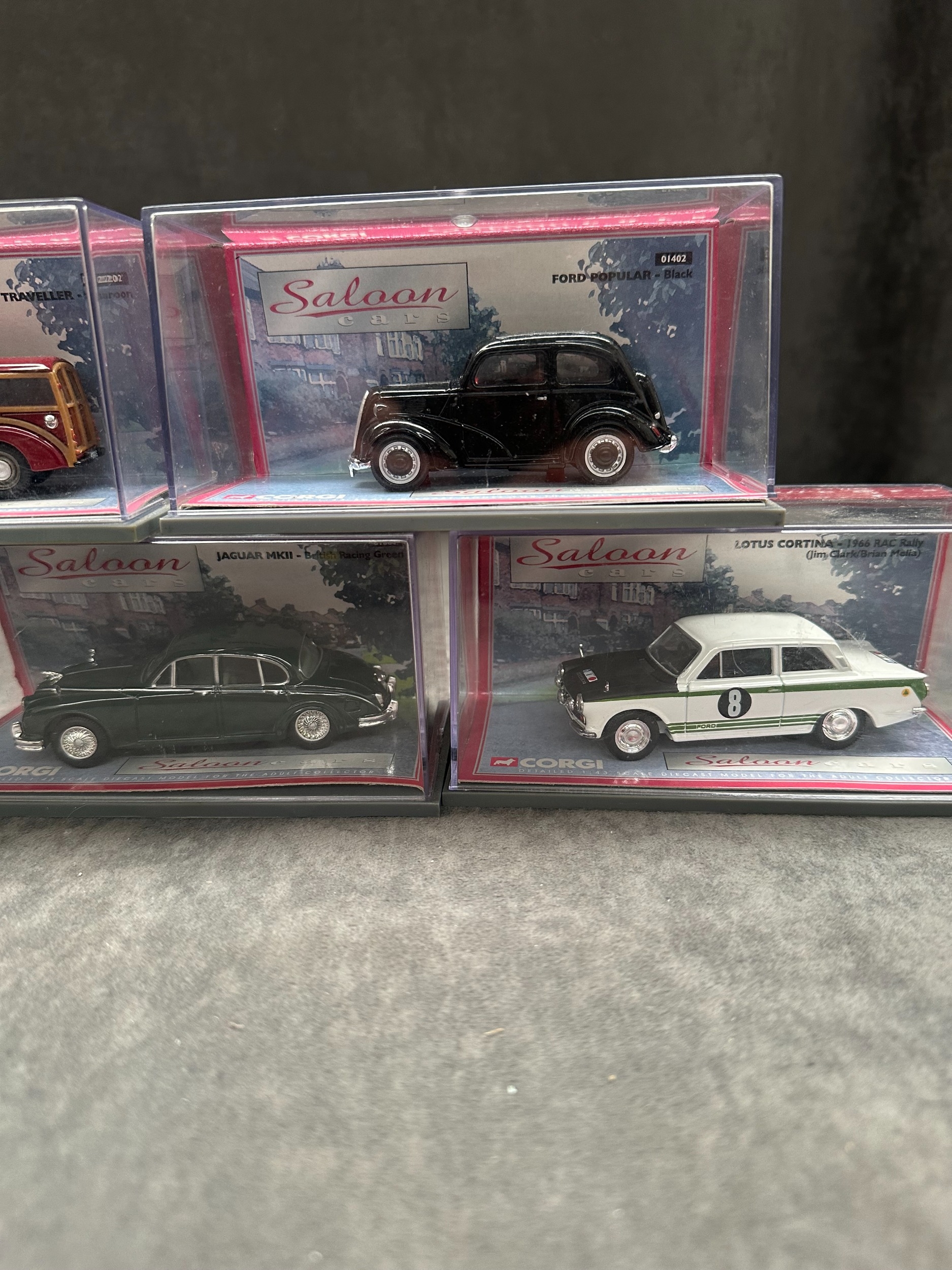 5 x Corgi Saloon cars this lot includes 01302 Lotus Cortina (RARE) 01402 Ford Popular, 01804 Jaguar MKII, 02202 Morris Traveller, 01701