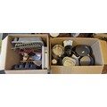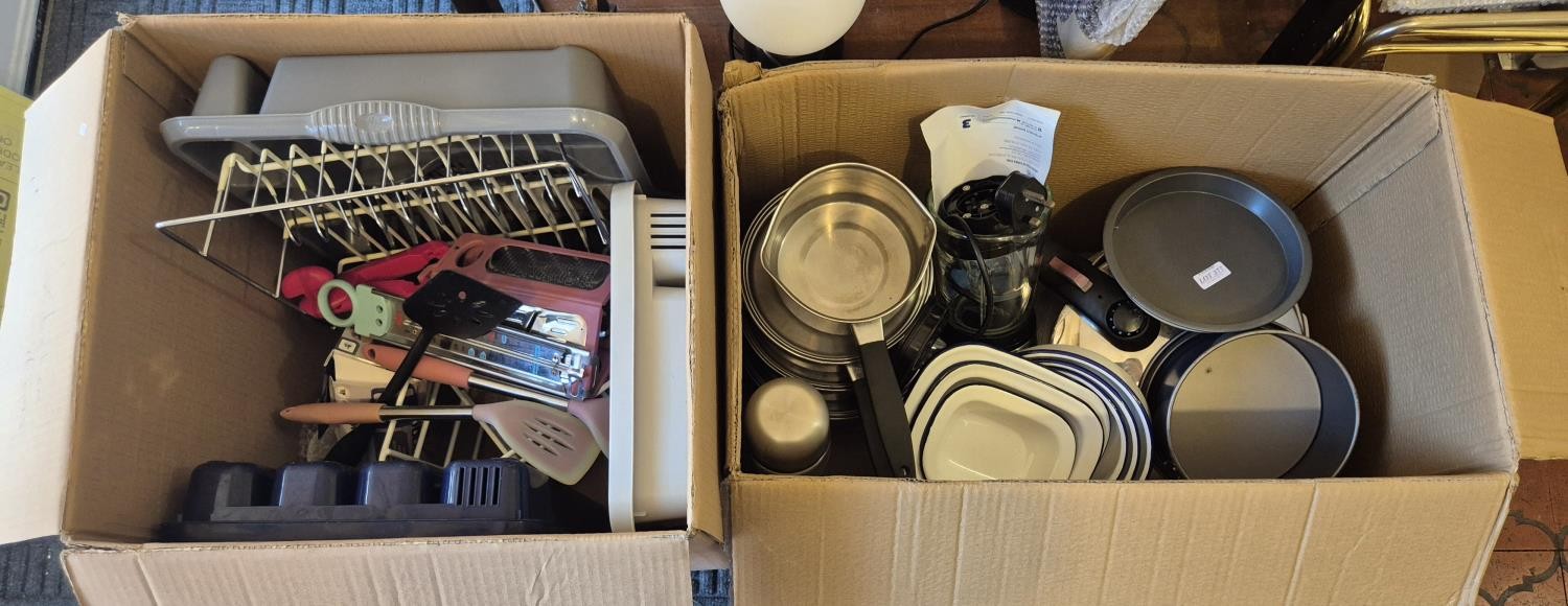 2 X BOXES OF KITCHENALIA INC. PANS, PRESSURE COOKER, ENAMELLED DISHES, CAKE TIN, DISH DRAINING RACK, UTENSILS ETC.