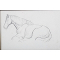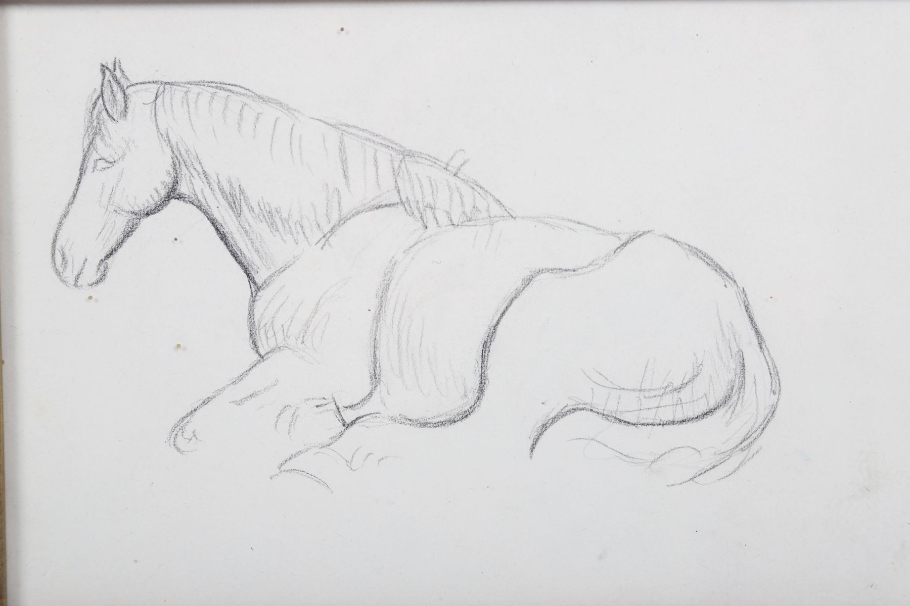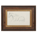 A finely observed pencil drawing depicting a horse lying down, displaying the artist’s understanding of anatomy and form. Presented in a gilt-lined walnut frame. Image: 14 x 22 cm. Framed: 24 x 32 cm. PICTURES AND PRINTS Thursday 11th December 2025 19:04:24