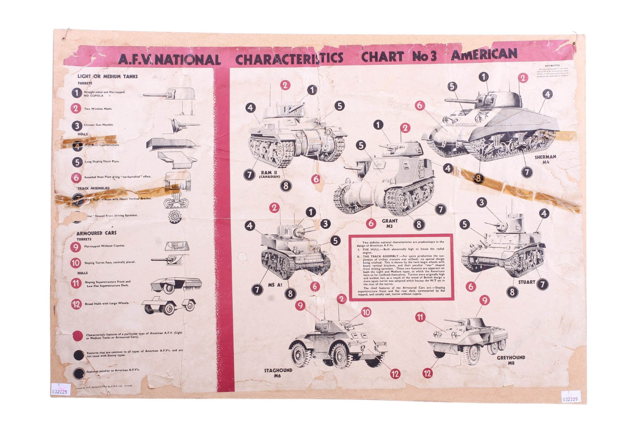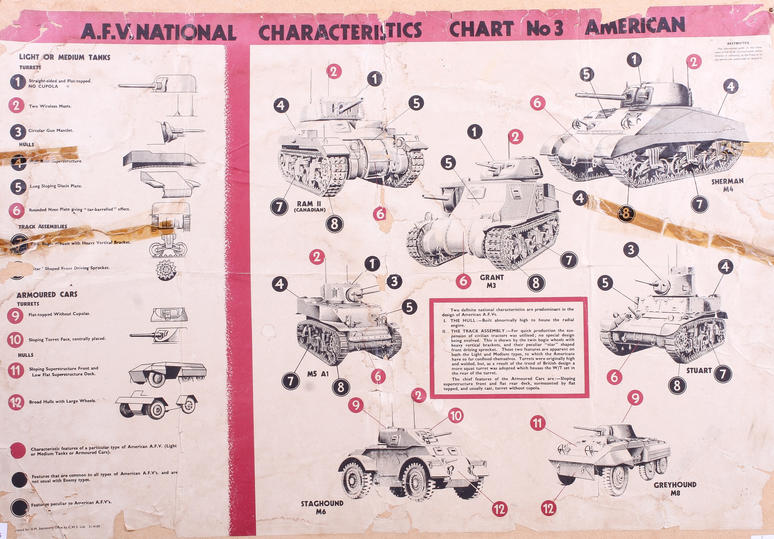 A WWII American armoured vehicle chart. 'A.F.V. National Characteristics Chart No3 American', mounted on card, 51cm x 70cm.