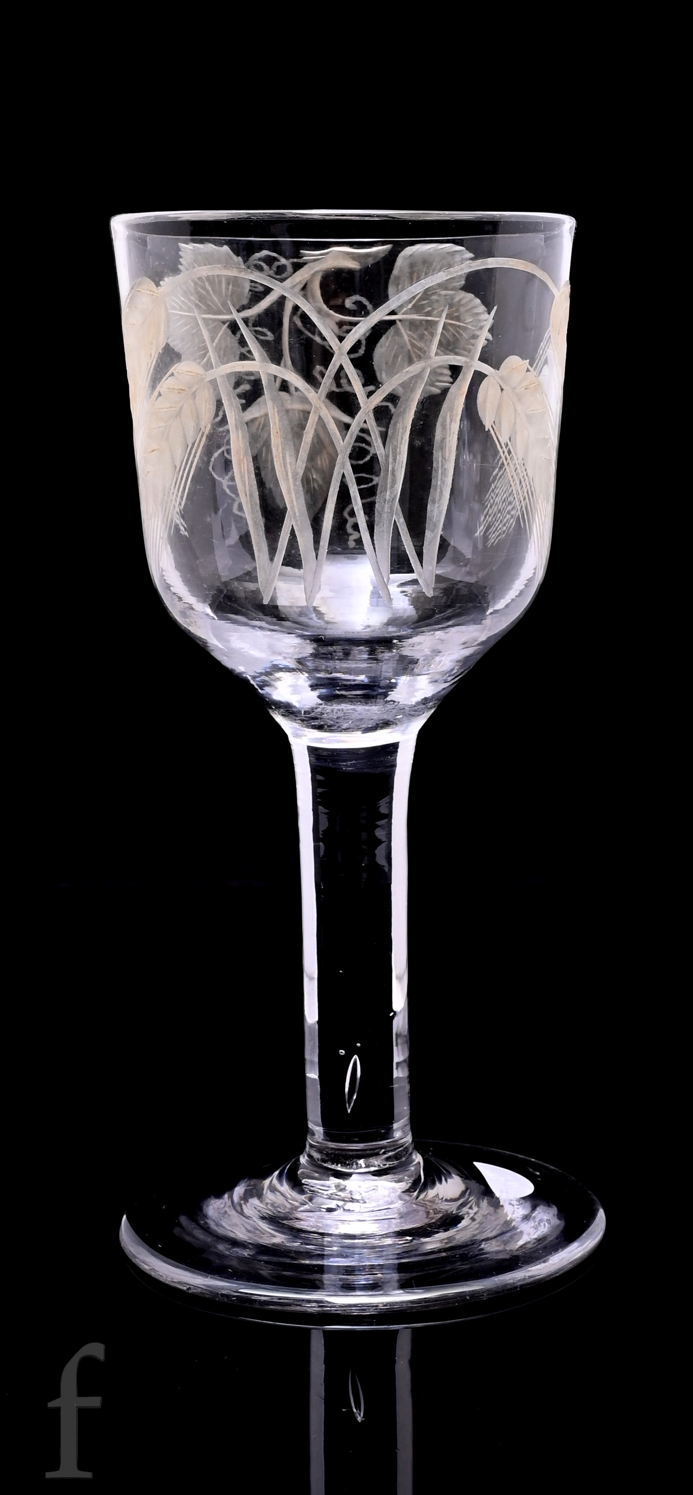 A large 18th Century goblet circa 1740, the ogee bowl engraved with hops and barley above a plain stem, raised to a shallow conical foot, height 19cm.