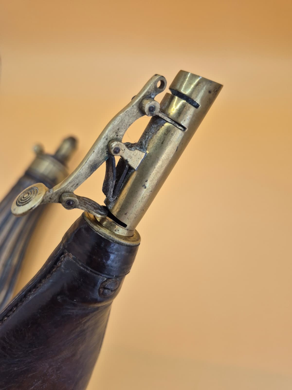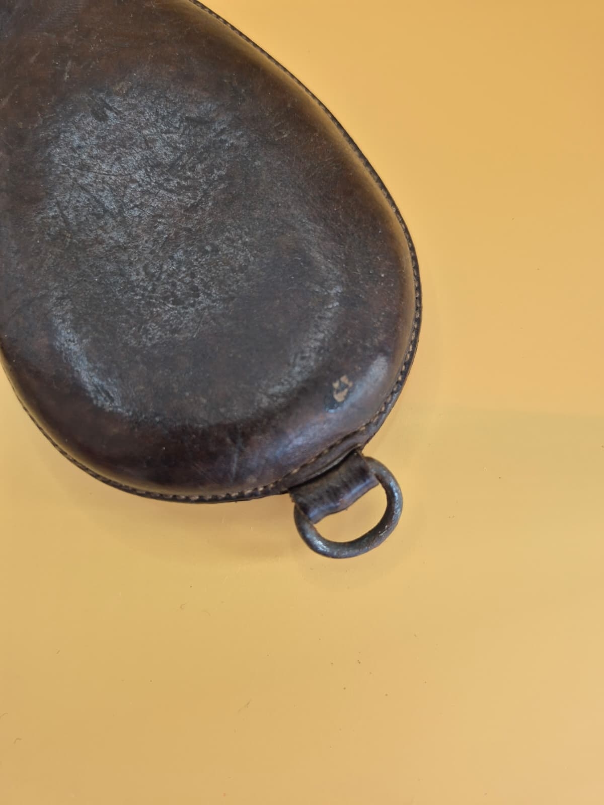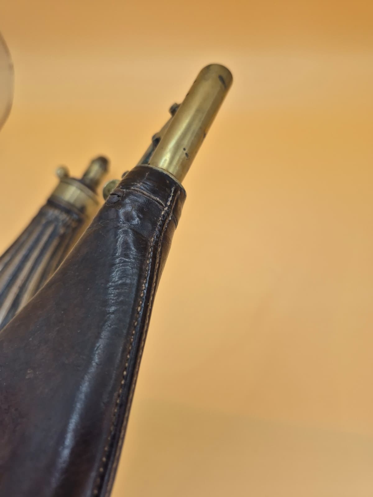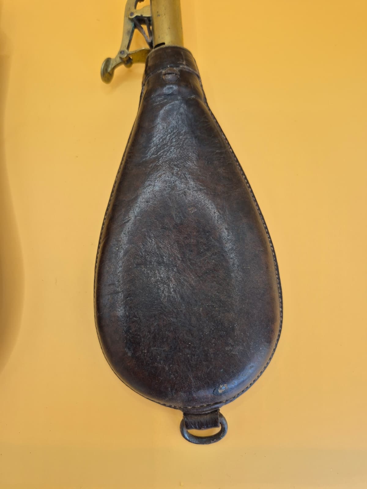 Two Vintage Gun Powder Flask Includes a Copper Dixon & Sons One along with a Unmarked Leather One Both in Reasonable Nice Condition