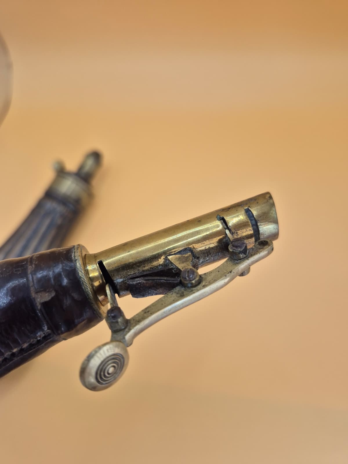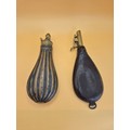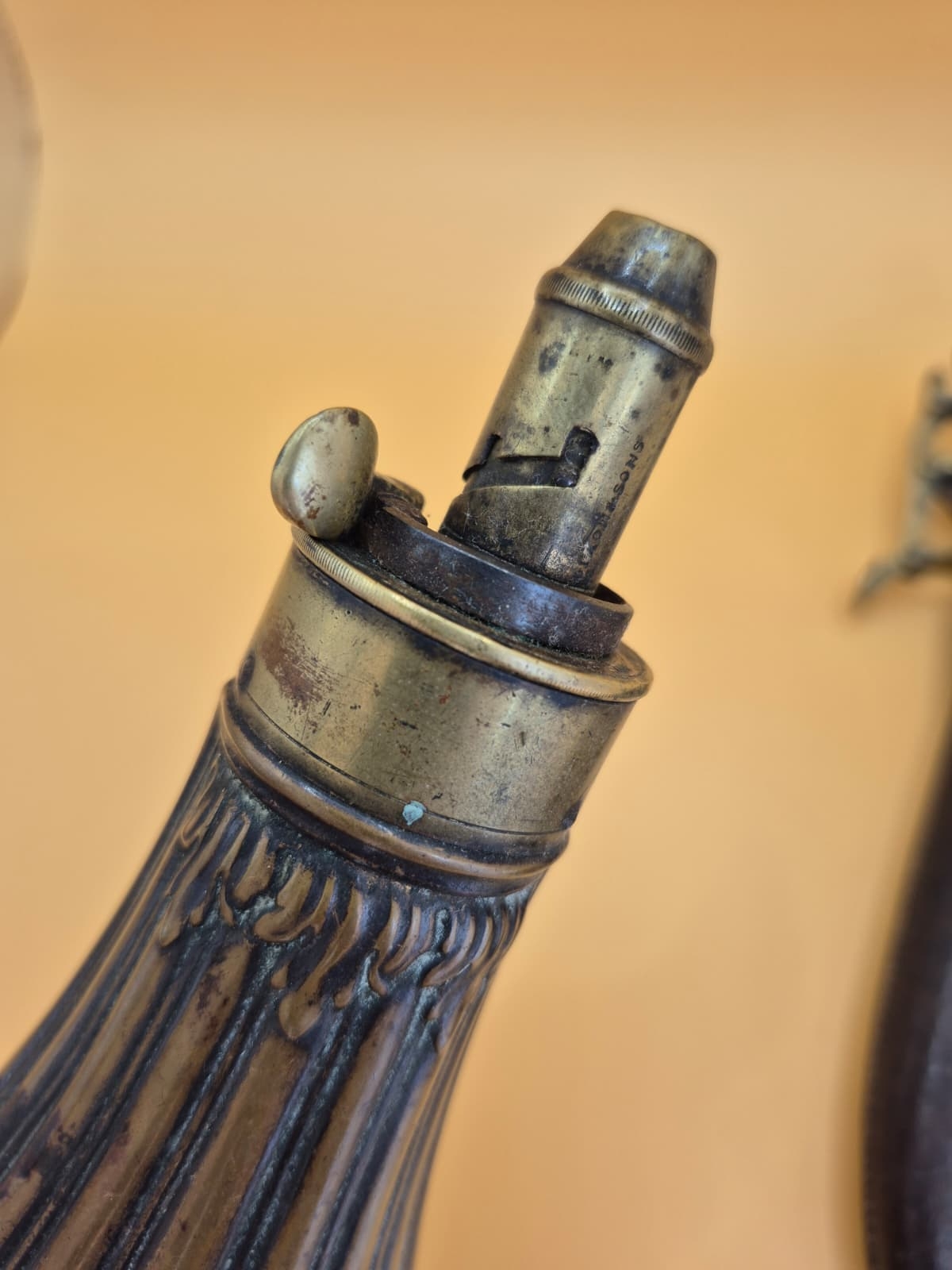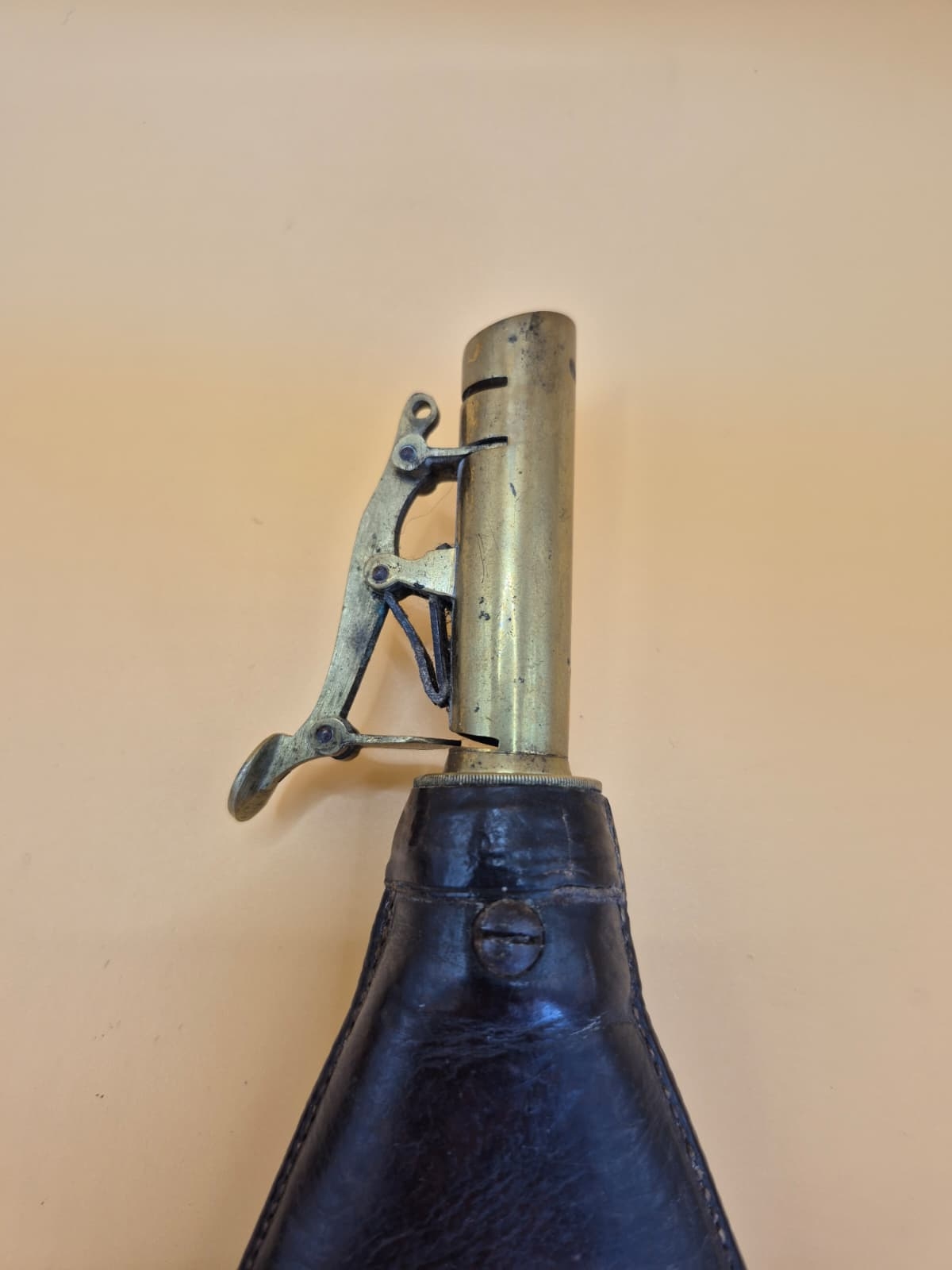 Two Vintage Gun Powder Flask Includes a Copper Dixon & Sons One along with a Unmarked Leather One Both in Reasonable Nice Condition
