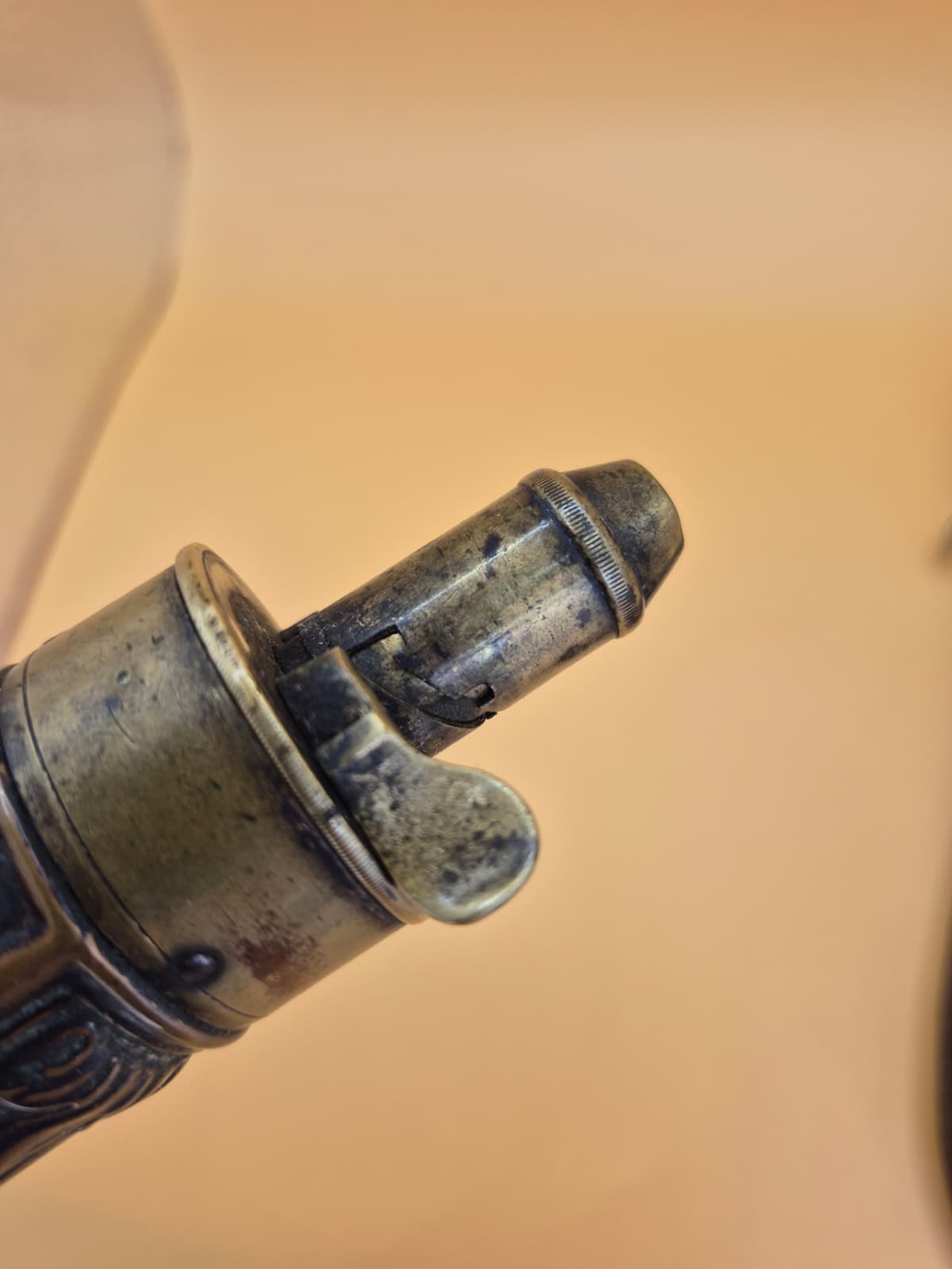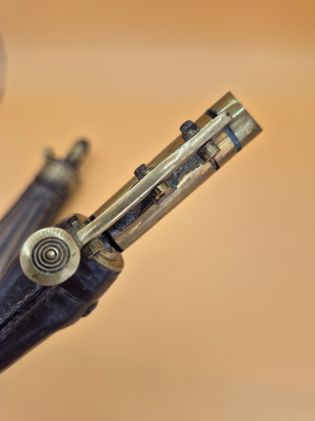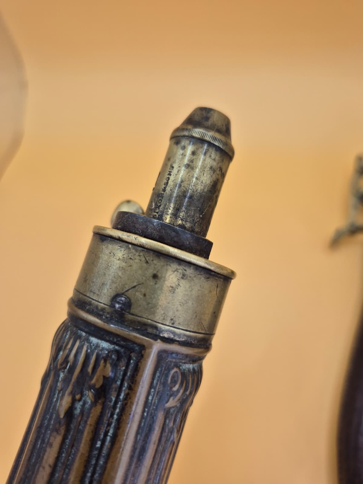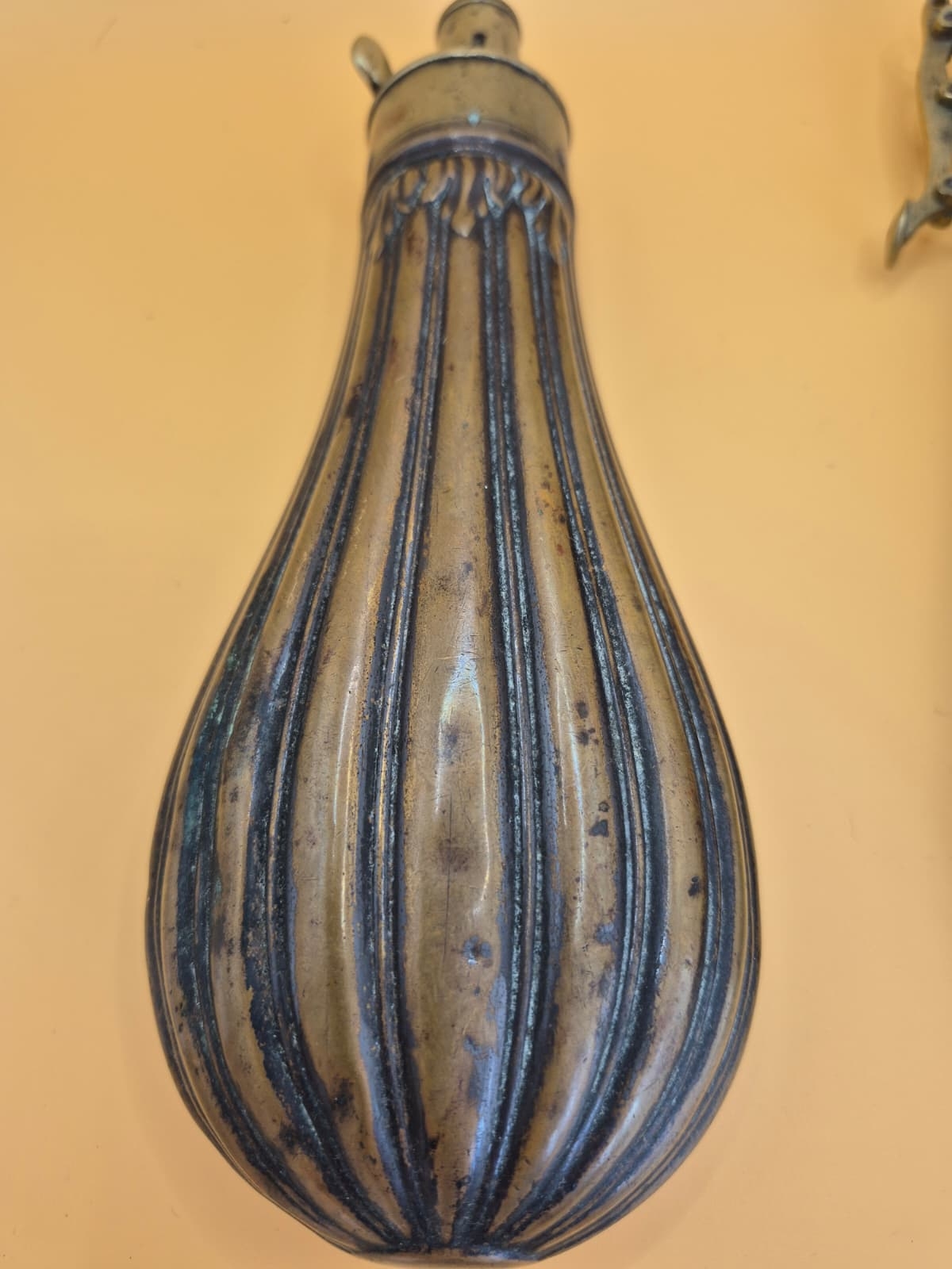 Two Vintage Gun Powder Flask Includes a Copper Dixon & Sons One along with a Unmarked Leather One Both in Reasonable Nice Condition