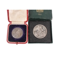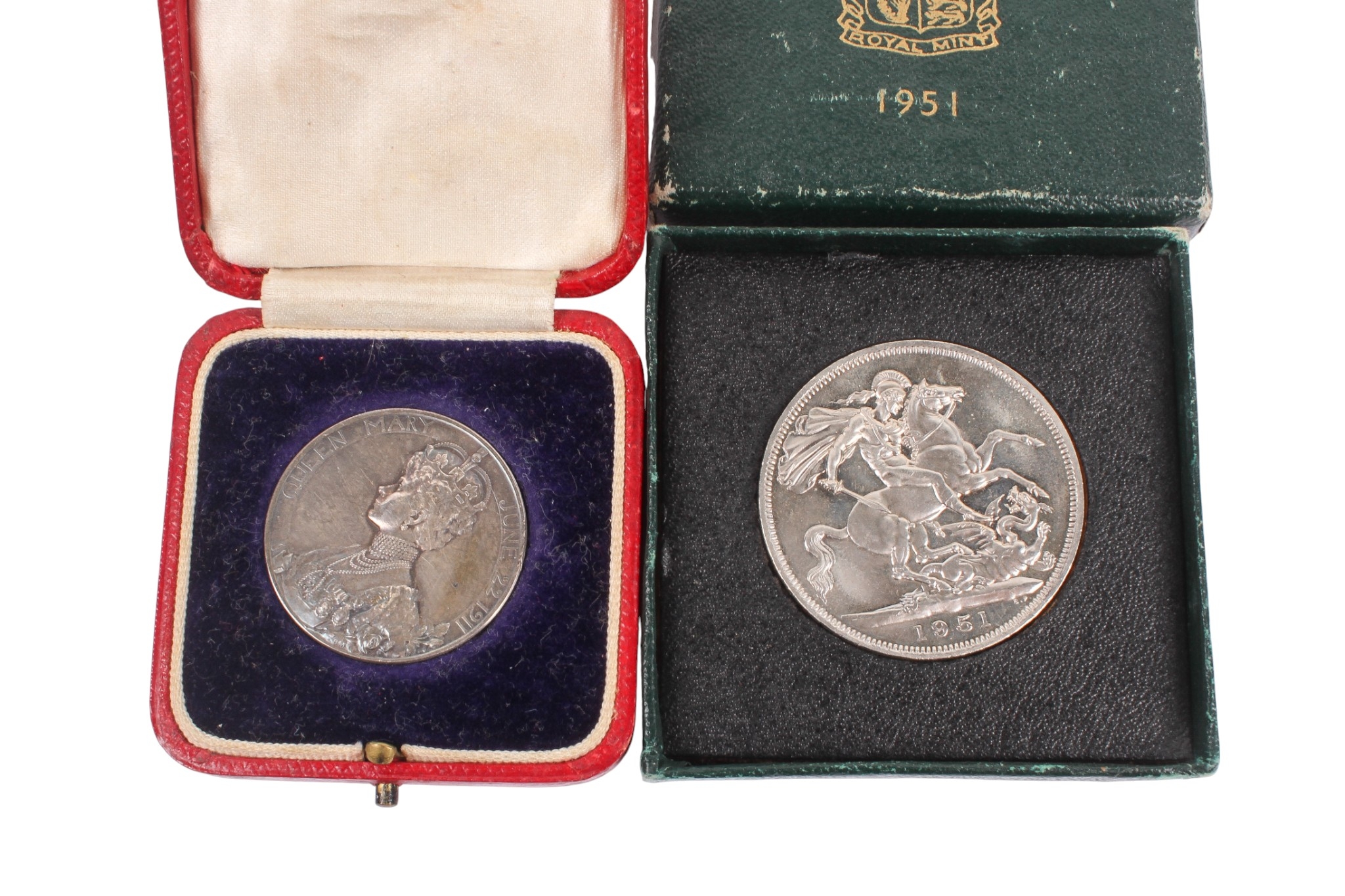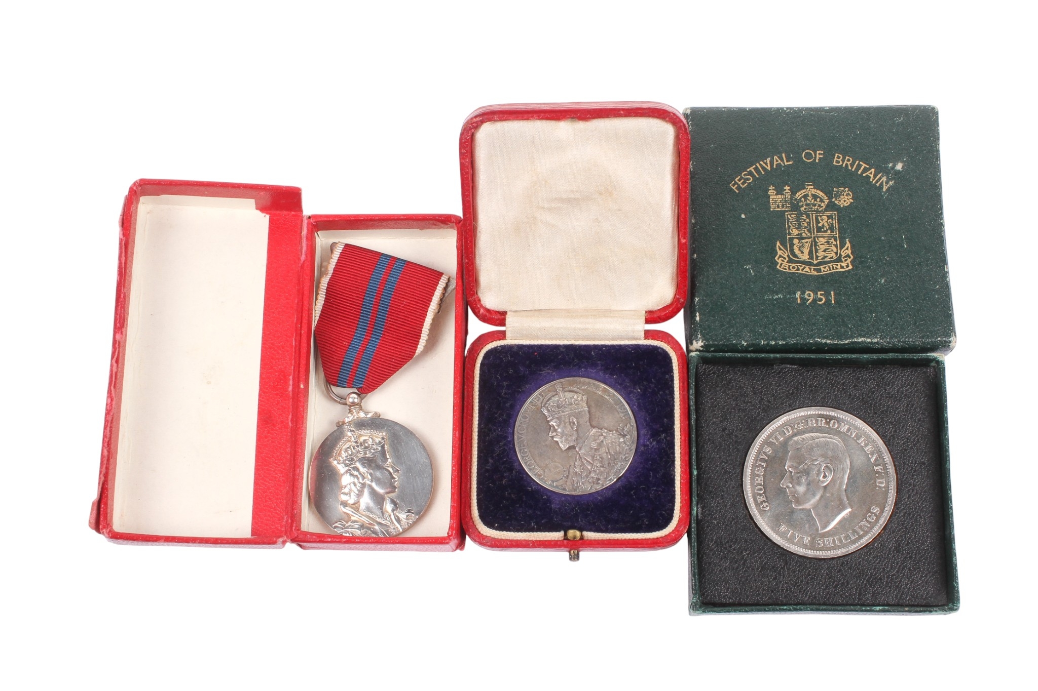 1911 silver medallion boxed, 1953 silver Coronation medal and a 1951 crown boxed.