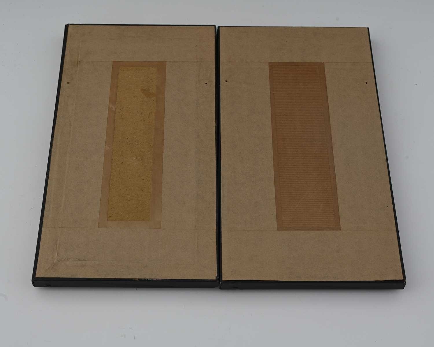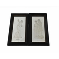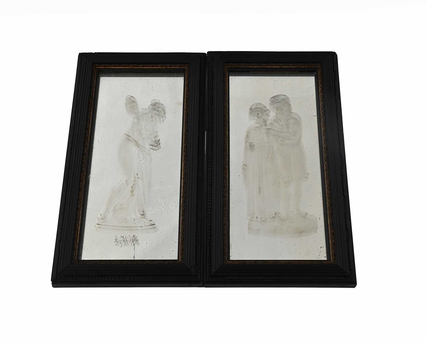 A pair of Victorian Stourbridge engraved glass mirror panels, one with peasant children, the other with Classical winged figure, 24.5cm x 10cm, framed (2)