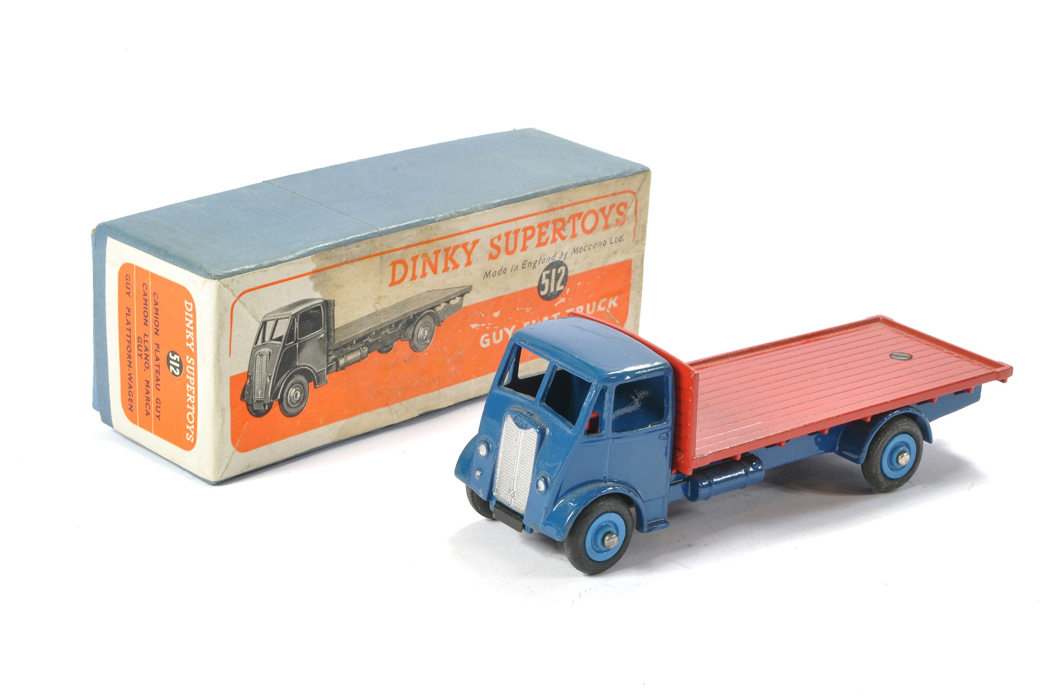 Dinky No. 512 Guy Flat Truck. Blue with mid blue hubs, red back. Very good with some more notable marks inc rub to roof. In good original box.