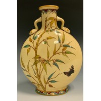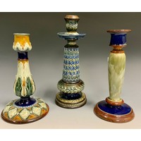 A Troika cylinder vase, designed by Avril Bennet, decorated with bands of circles and striped motifs, blue ground, 37cm high, 11cm diam, signed with initials, painted marks