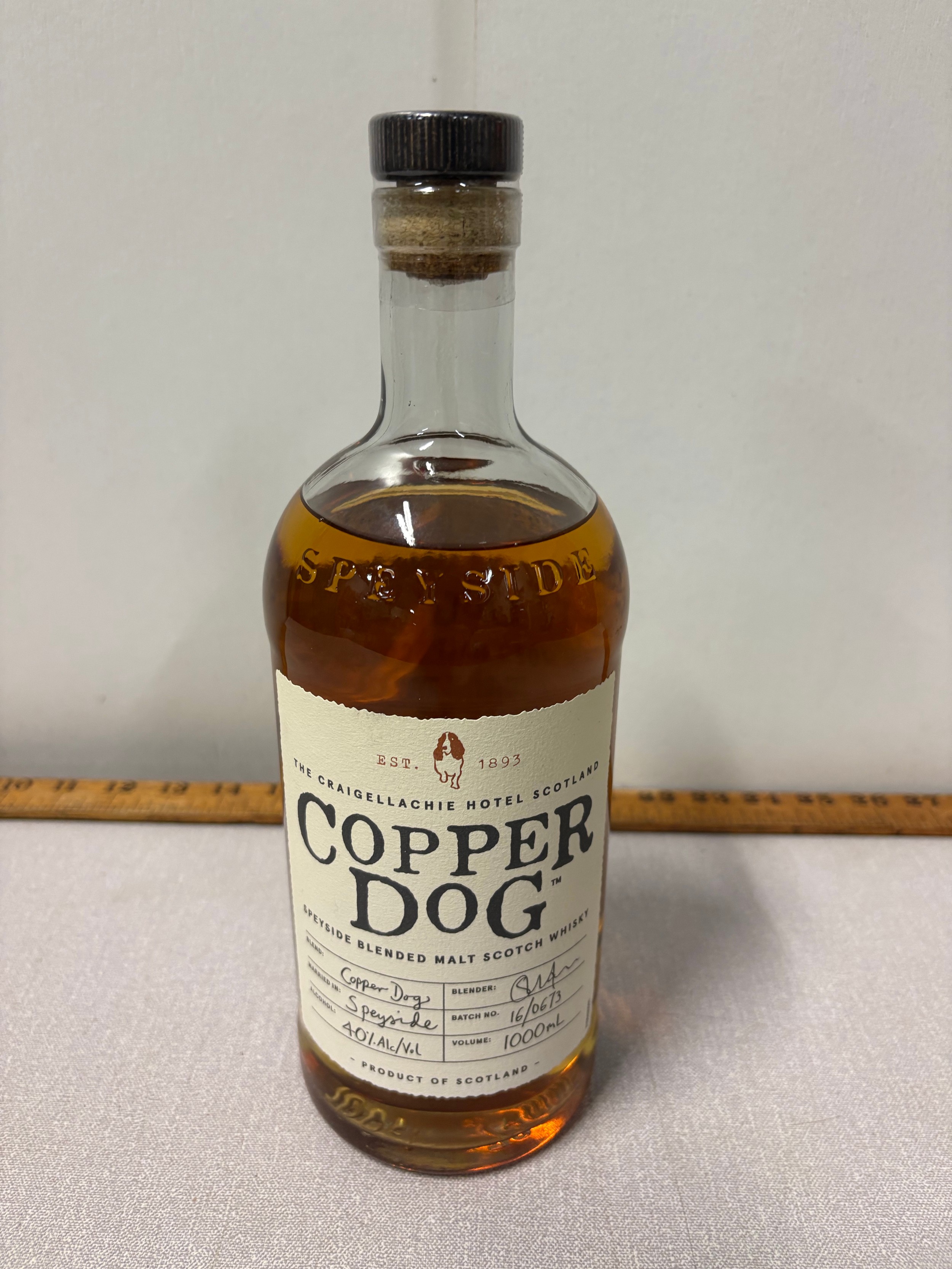 A litre bottle of copper dog Speyside blended malt scotch whisky