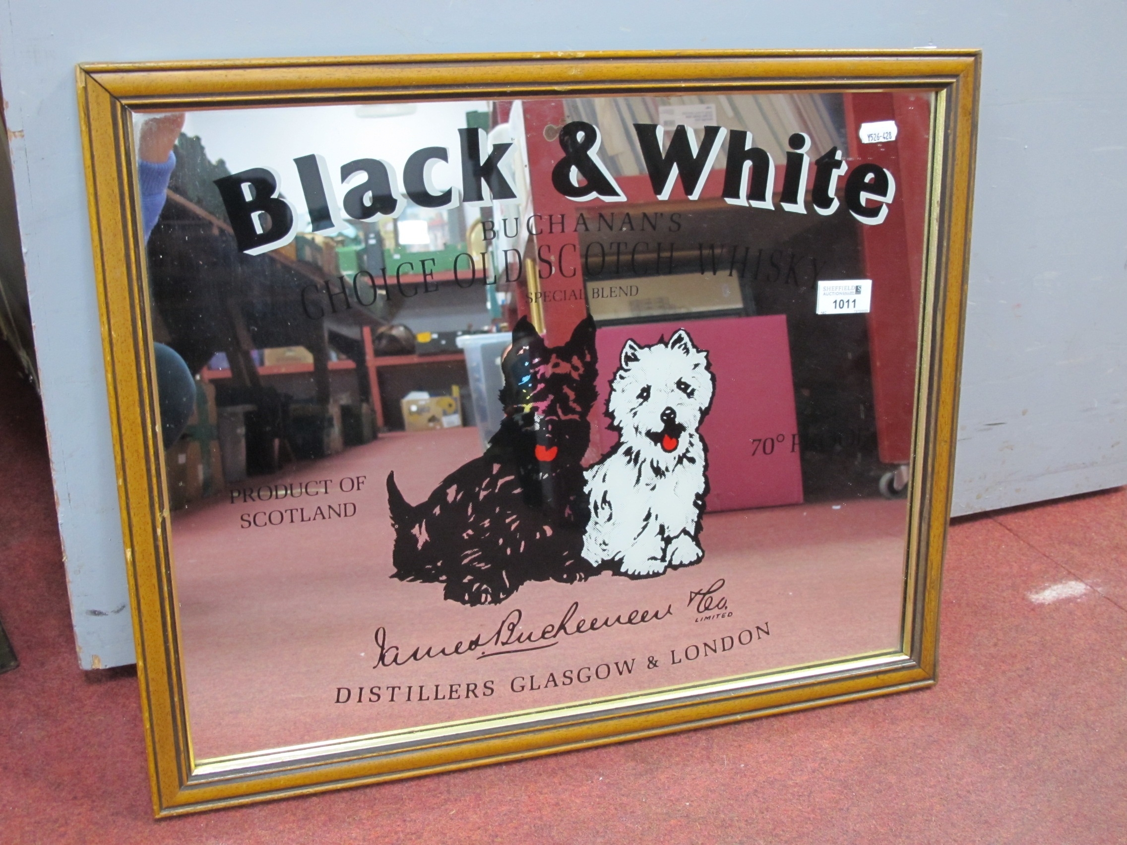 A reproduction 'Black and White Buchanan's choice old scotch whiskey' advertising pub mirror 40 x 50cm.