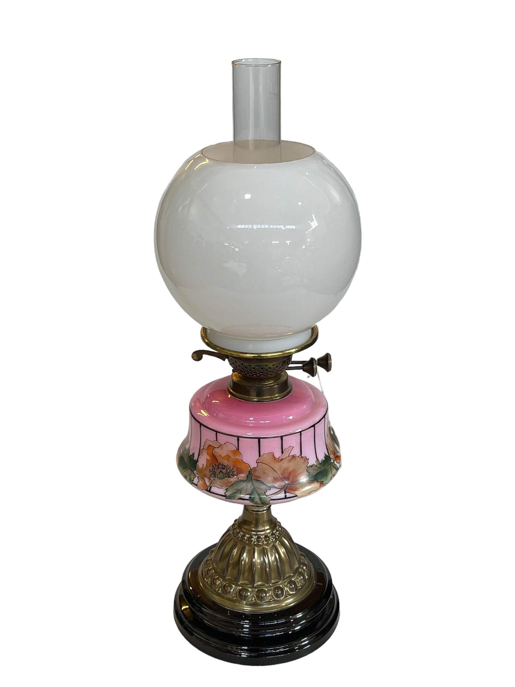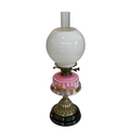 Victorian oil lamp with pink glass floral reservoir, 61cm.