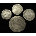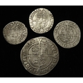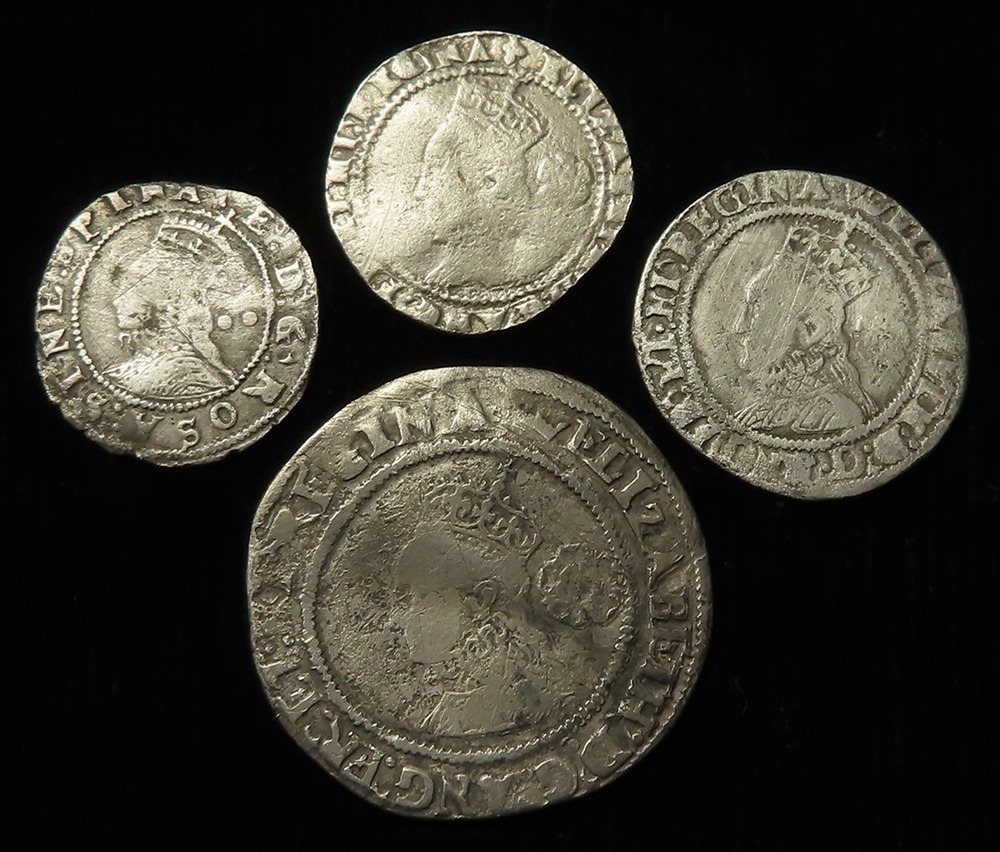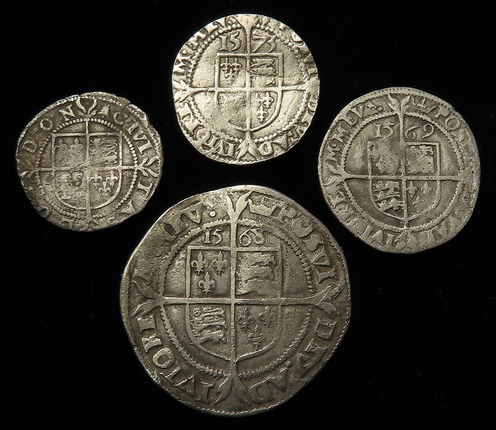 Elizabeth I hammered silver (4): Sixpence 1568 mm. coronet, S.2562, 2.50g, Fine; Threepence 1569 mm. coronet, S.2566, 1.39g, aF; Threepence 1573 mm. acorn, S.2566, 1.23g, VG; and Halfgroat mm. bell, with pellets, S.2579, 0.95g, nF.