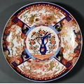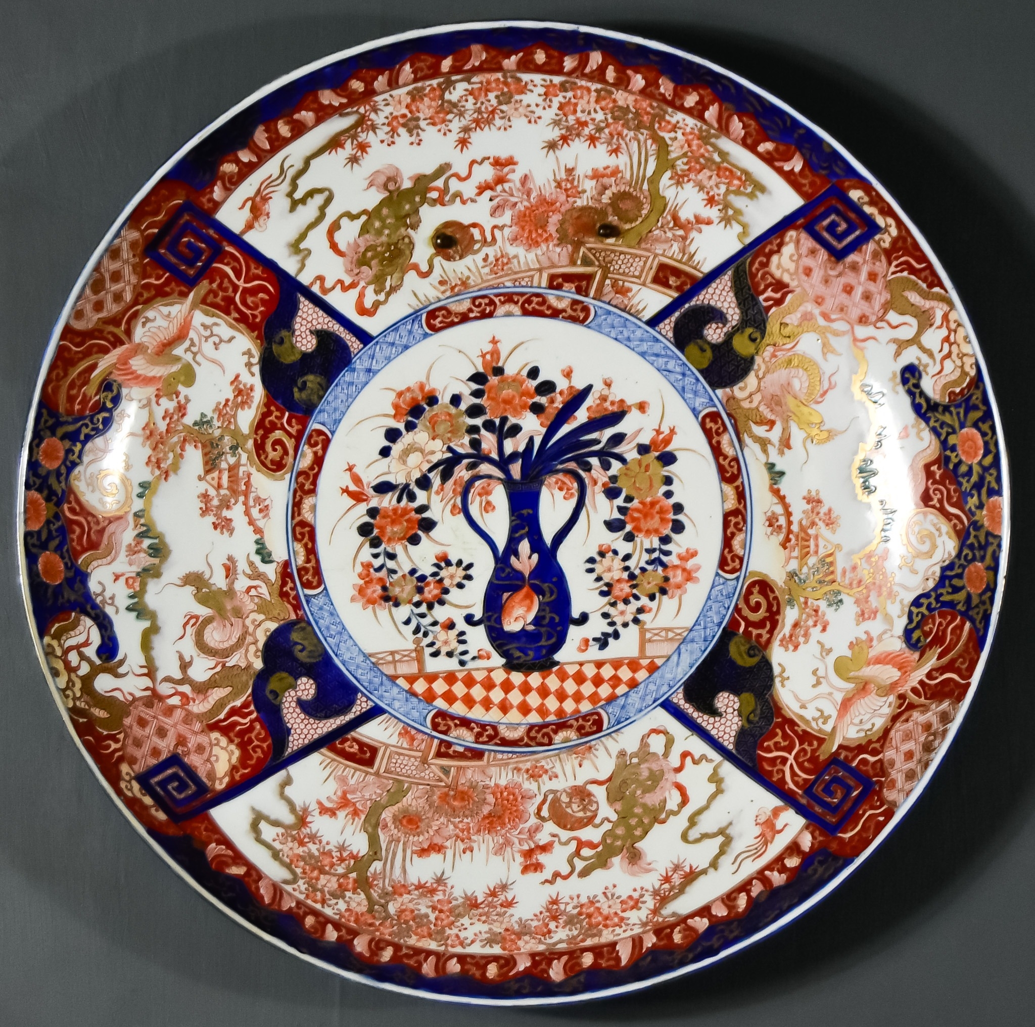 A Japeanese Porcelain Imari Charger, enamelled in blue, orange, green and gilt with a central reserve of a wase of flowers, flanked by shaped reserves filled with dragons and mythical beasts, 24ins (61cm) diameter, seal mark to underside