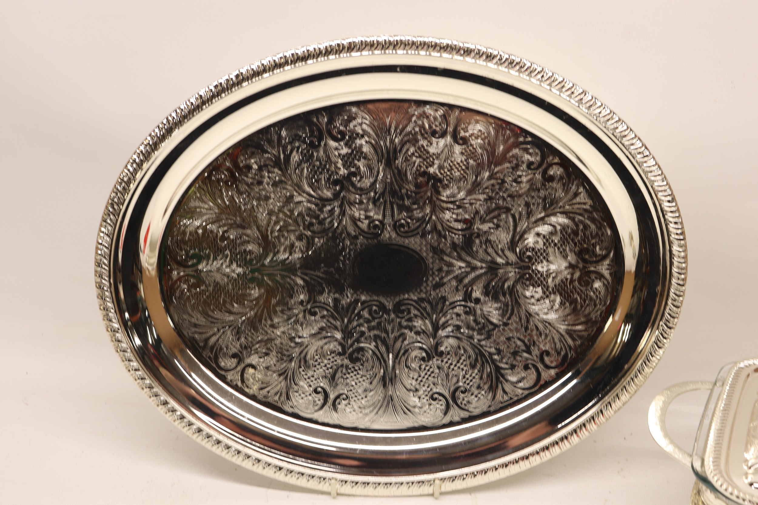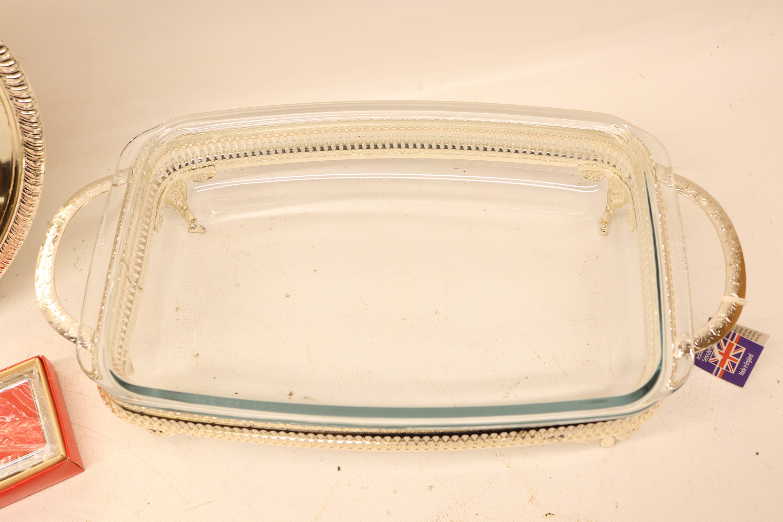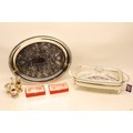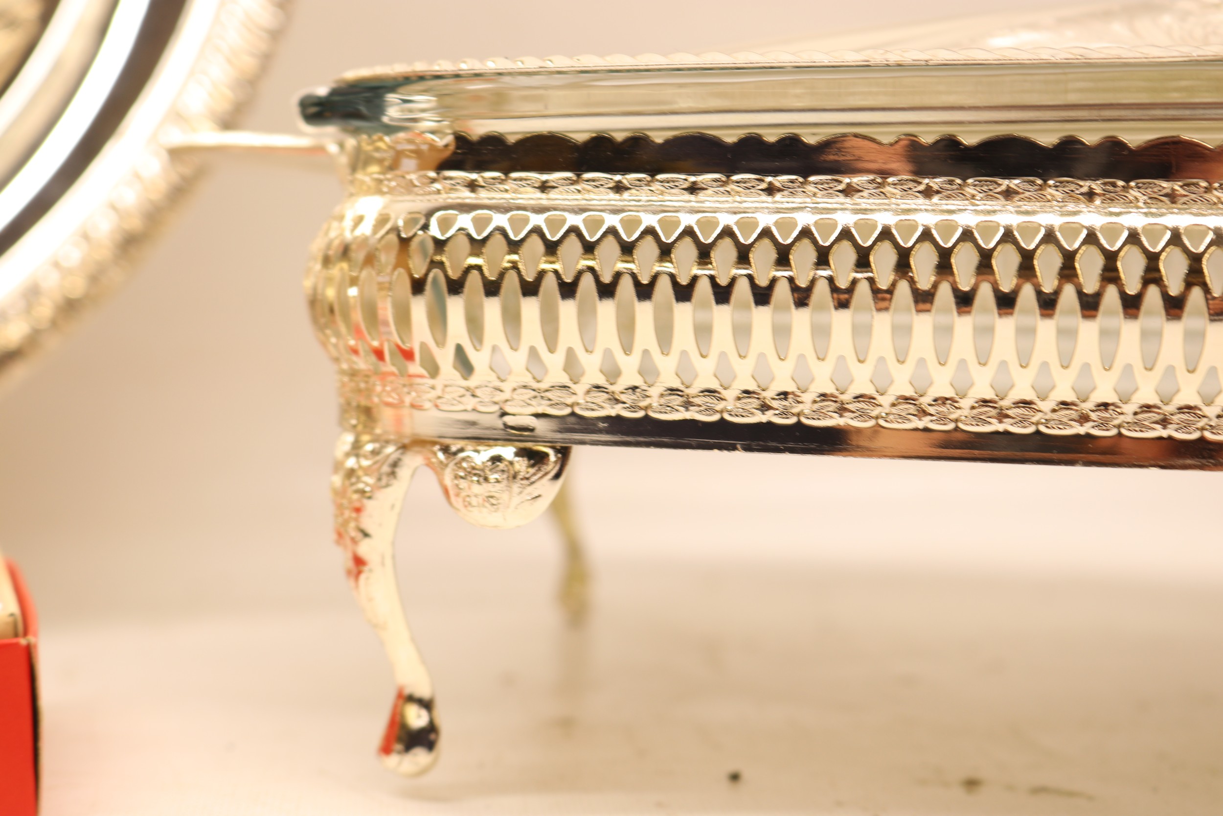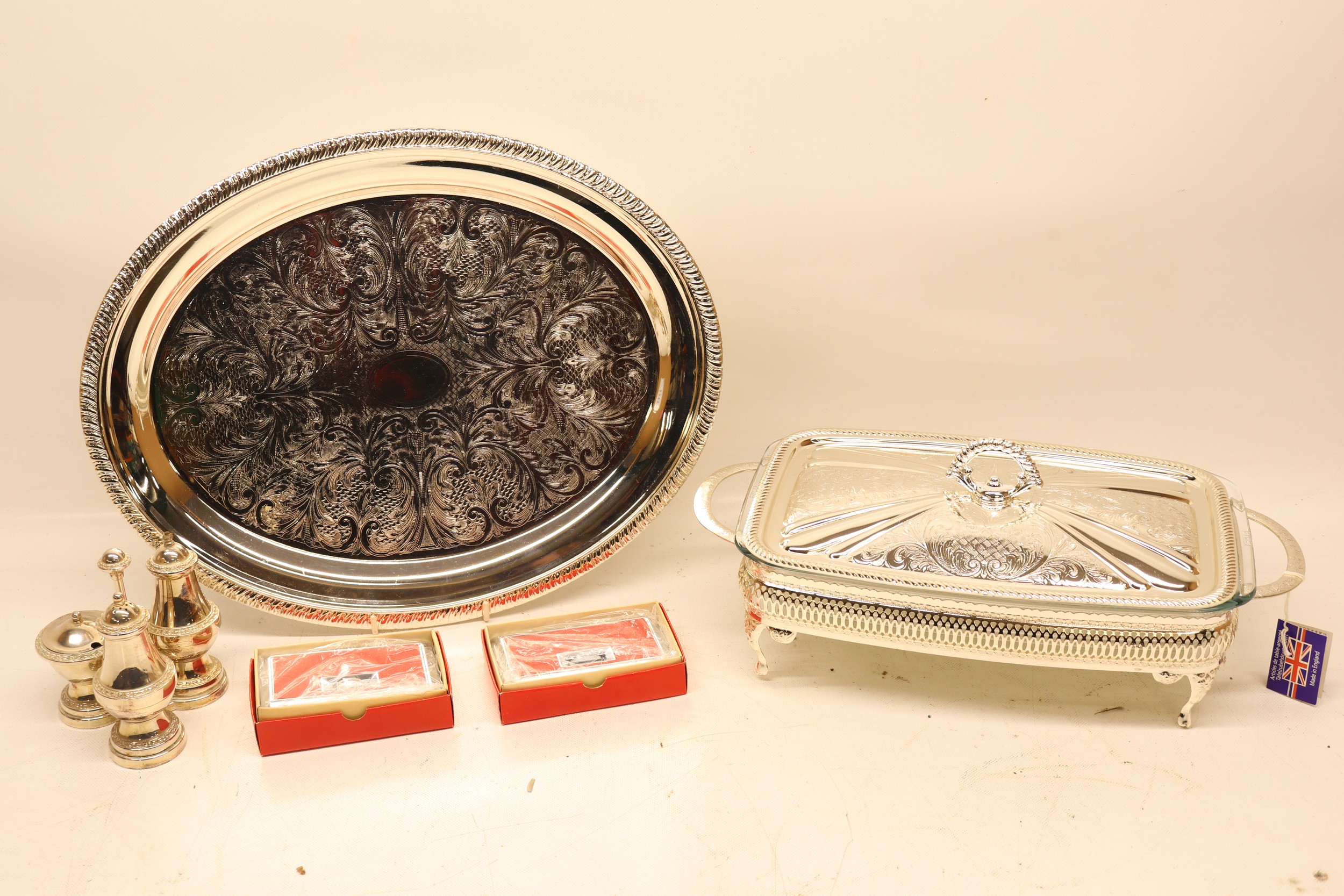 Silver plate incl. The Jeweller's Collection oval serving platter approx. W42cm & matching glass-lined Queen Anne-style lidded casserole dish, both with decorative scrollwork etchings and rope twist borders; Ianthe cruet set with shakers & blue lined pot; plus two red opera binoculars in original boxes, etc. (5)