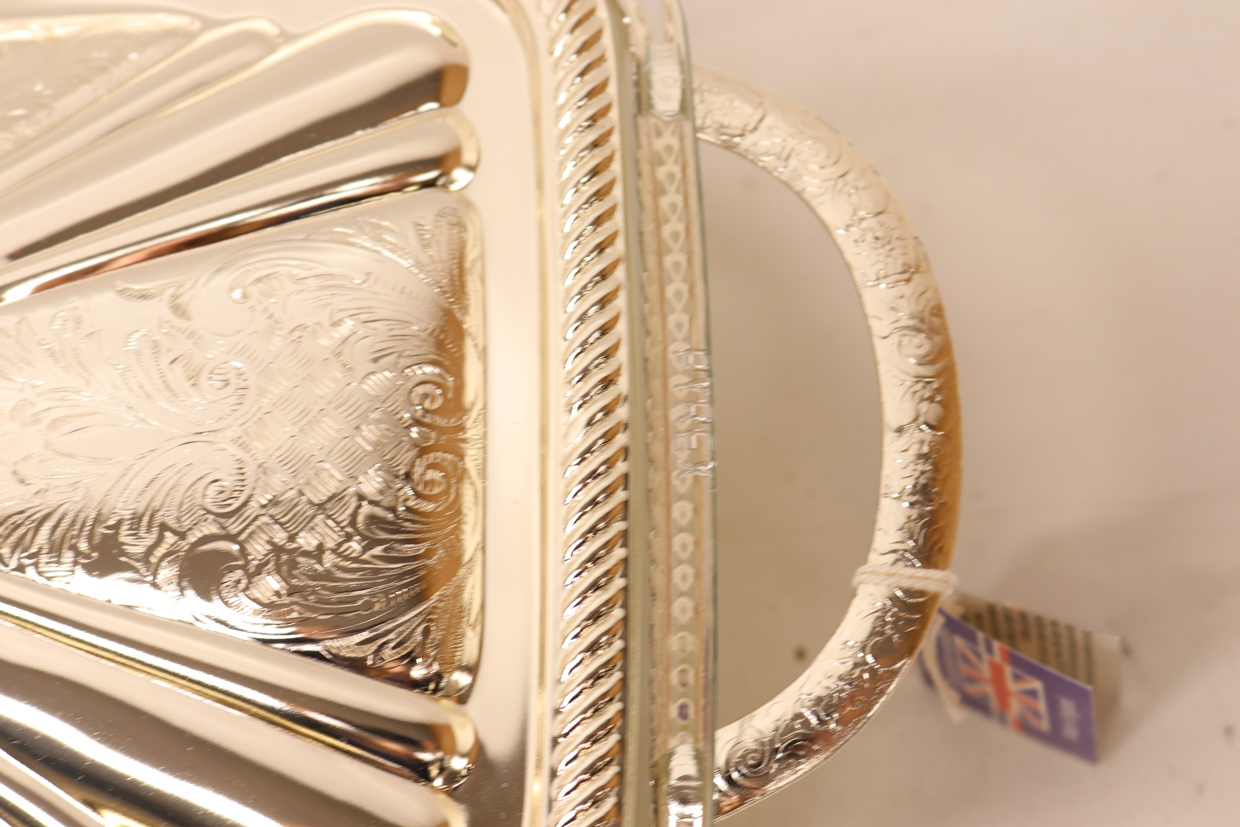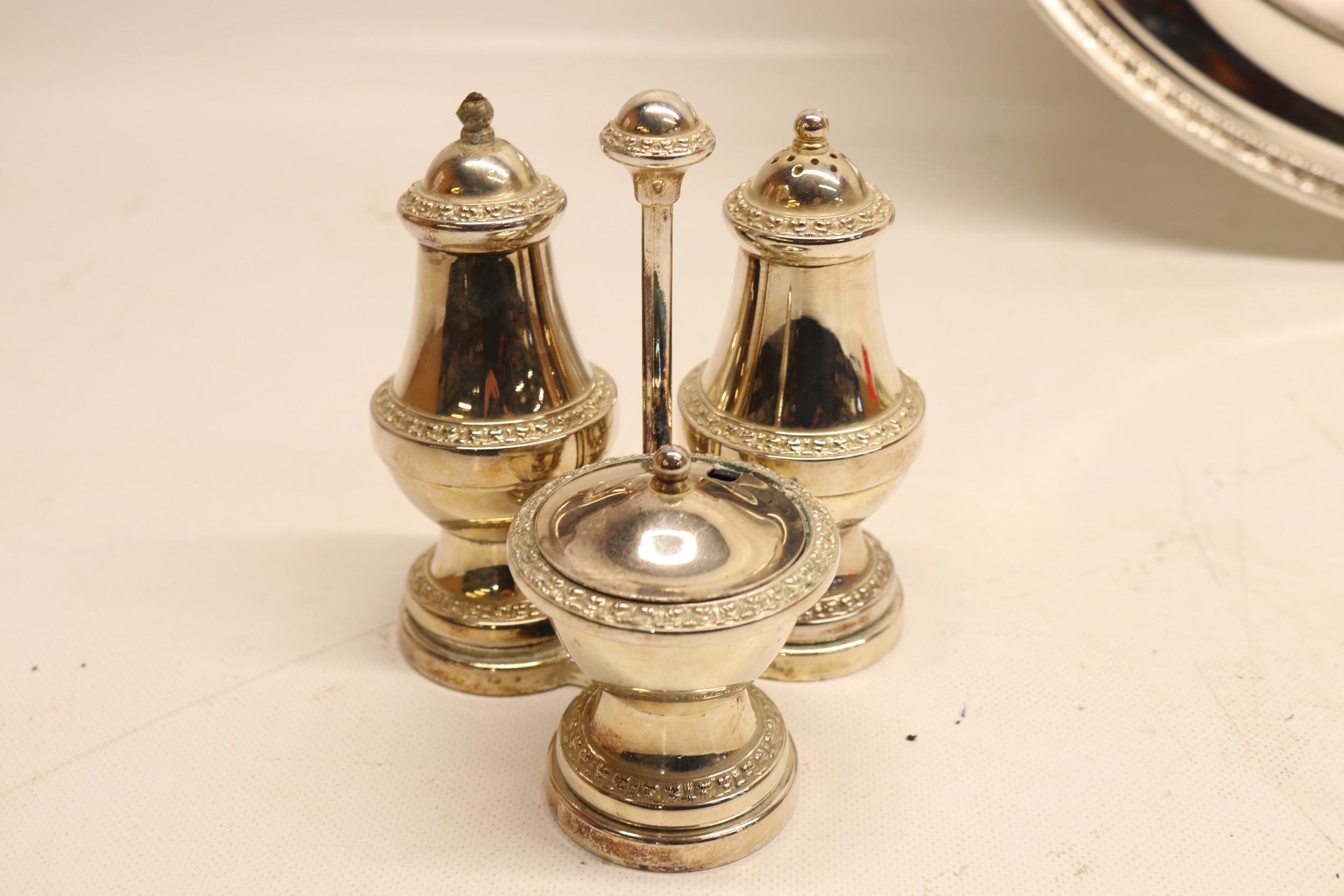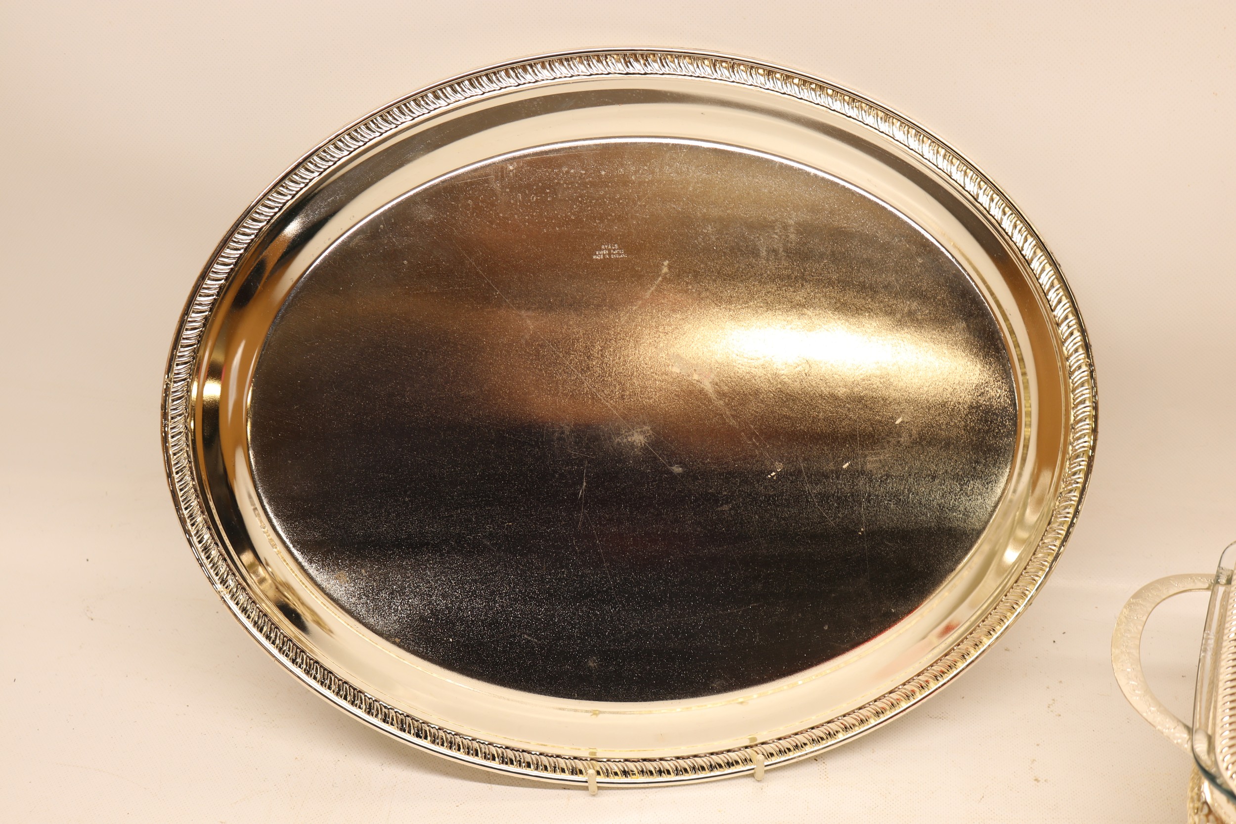 Silver plate incl. The Jeweller's Collection oval serving platter approx. W42cm & matching glass-lined Queen Anne-style lidded casserole dish, both with decorative scrollwork etchings and rope twist borders; Ianthe cruet set with shakers & blue lined pot; plus two red opera binoculars in original boxes, etc. (5)