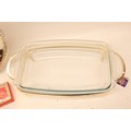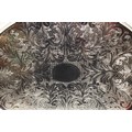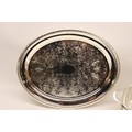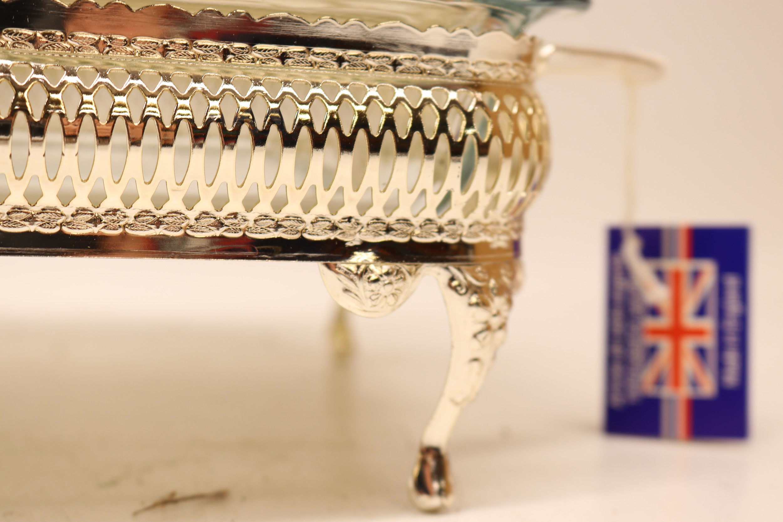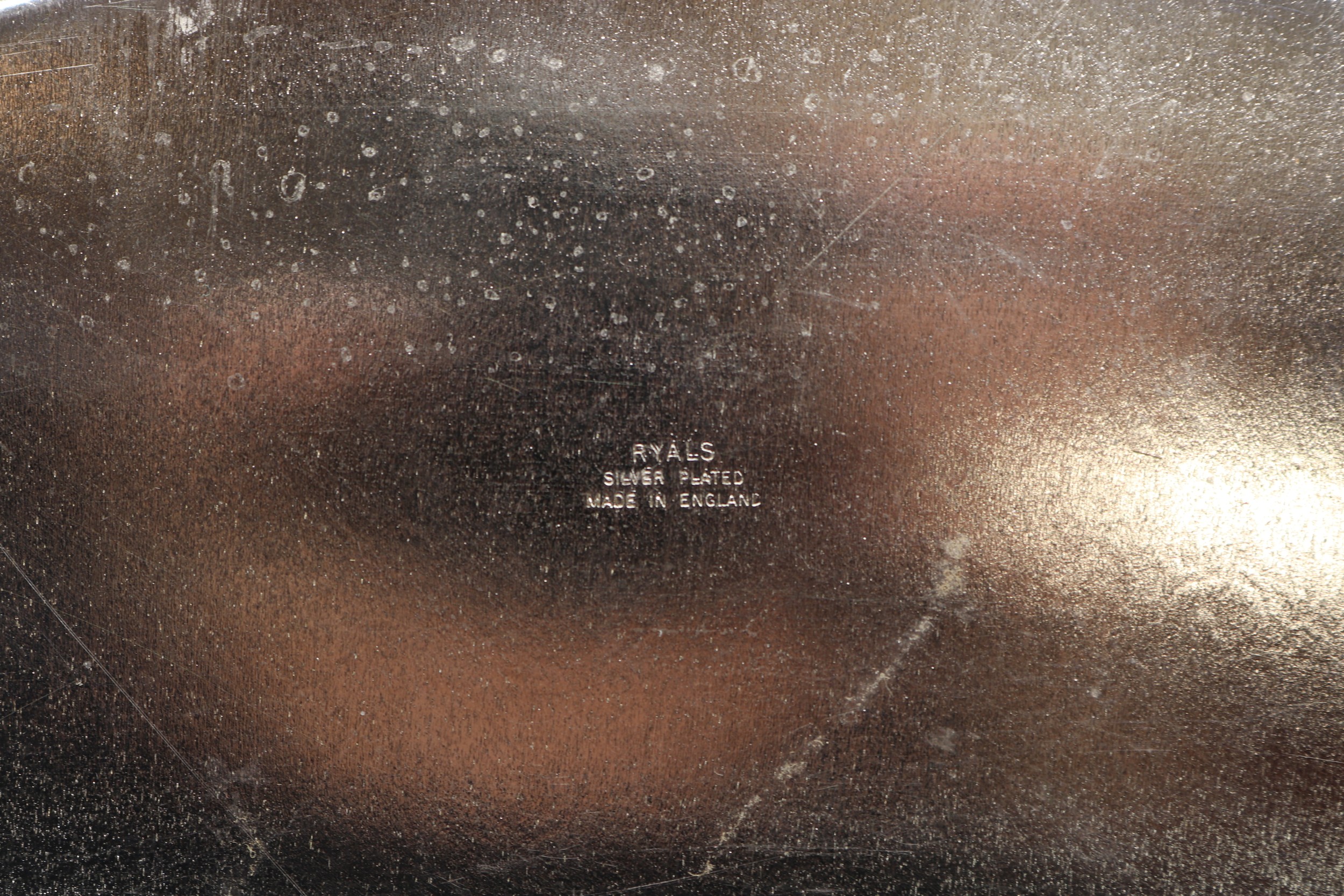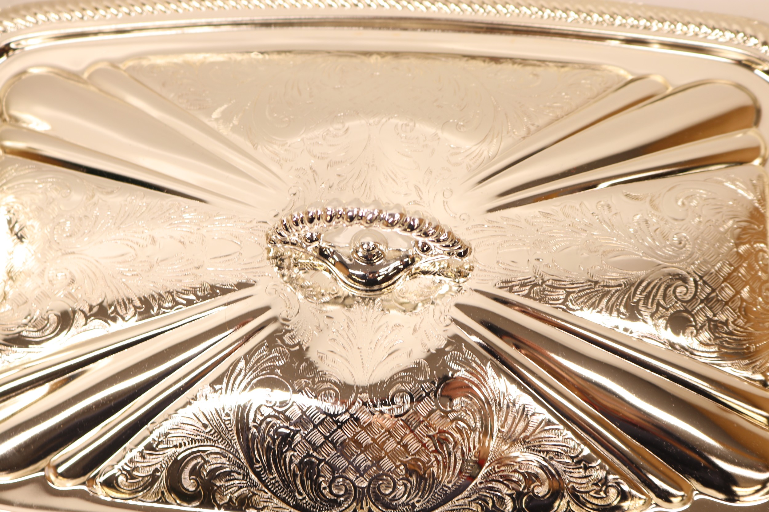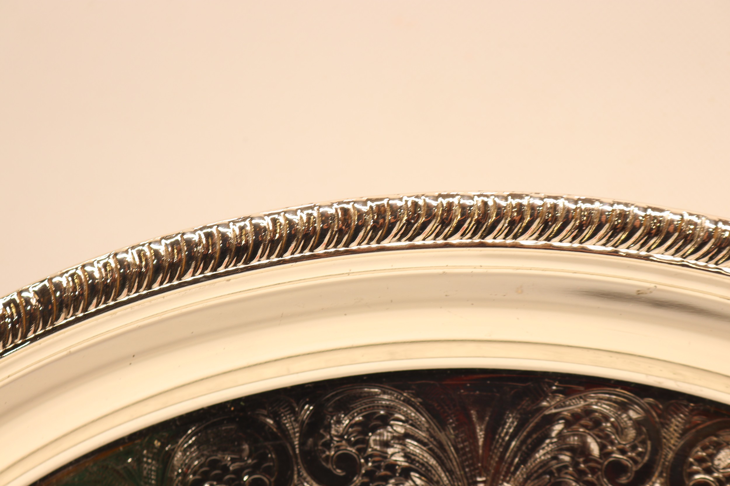 Silver plate incl. The Jeweller's Collection oval serving platter approx. W42cm & matching glass-lined Queen Anne-style lidded casserole dish, both with decorative scrollwork etchings and rope twist borders; Ianthe cruet set with shakers & blue lined pot; plus two red opera binoculars in original boxes, etc. (5)