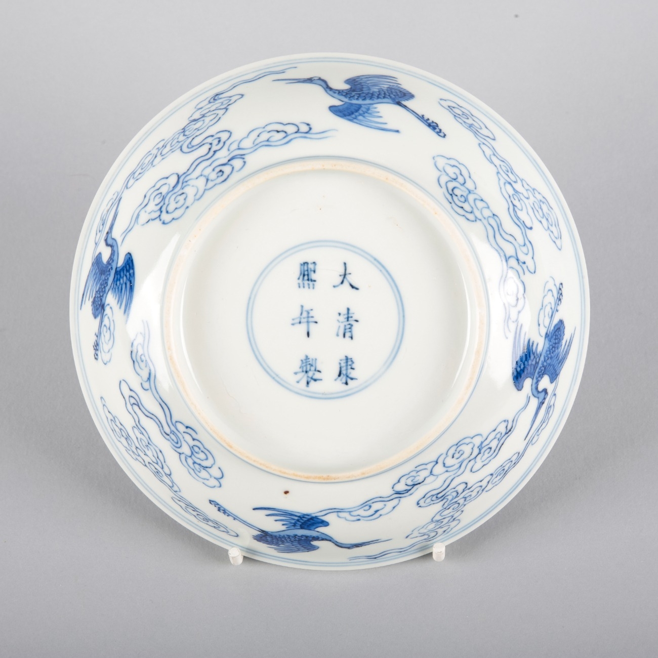 bearing a six-character Kangxi mark, the interior decorated with a dragon chasing and flaming pearl within concentric rings, the exterior with a continuous scene of herons amongst clouds, 15cm diameter